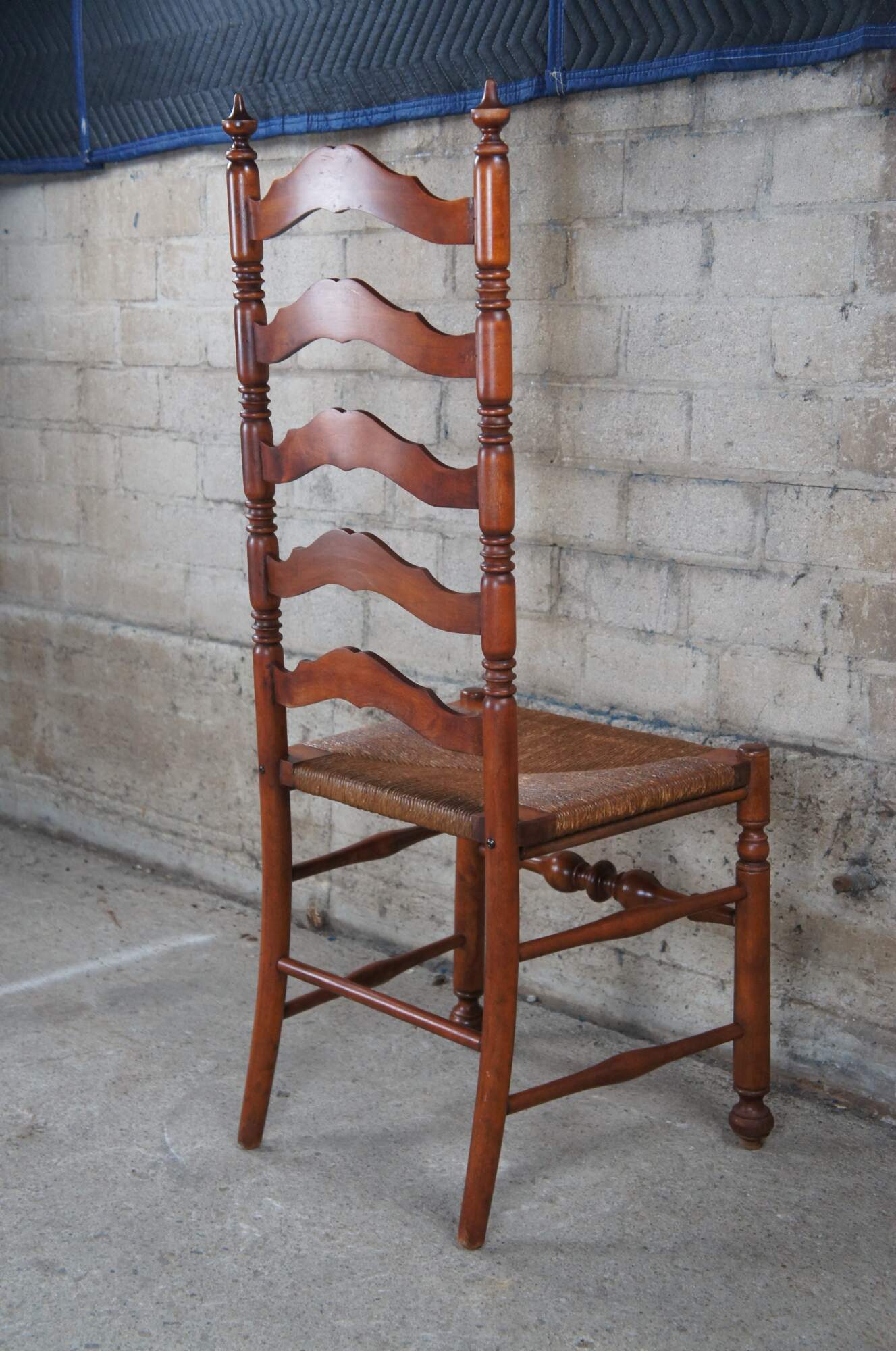 A lovely early 20th century shaker side chair. Made from oak with a serpentine ladder back. Features ripped stiles, spire finials and a rush seat. Legs are turned with shapely stretchers.