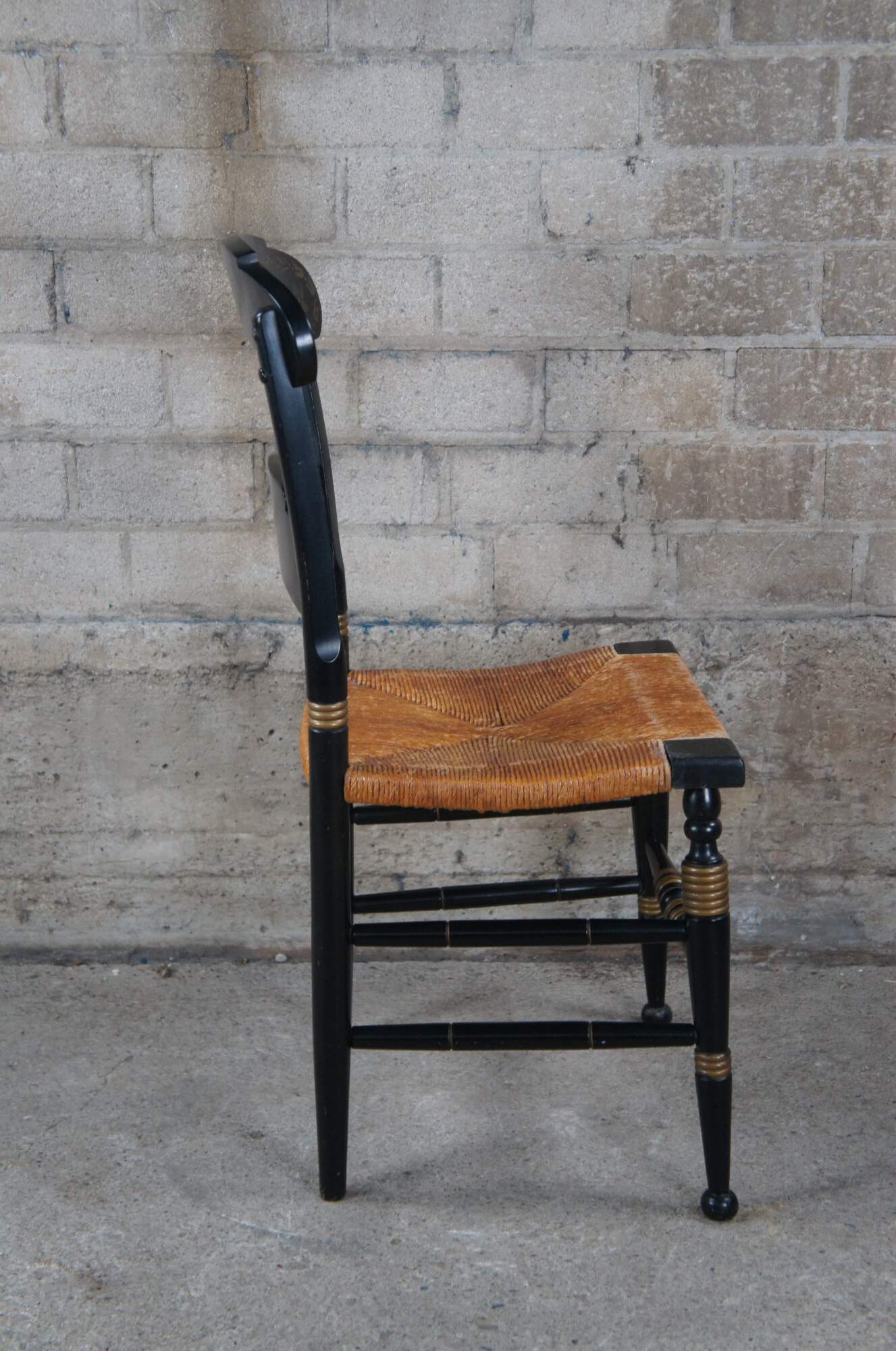 Mid 20th century Hitchcock style stenciled farmhouse chair. Features a fruit and foliate design along the back, ribbed stiles / legs and a rush seat.