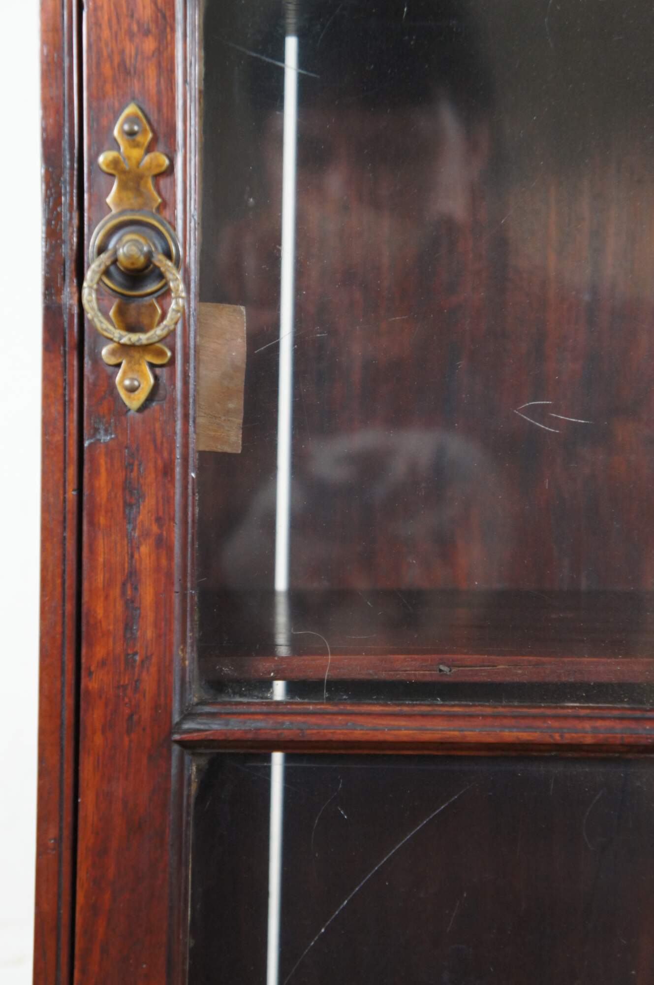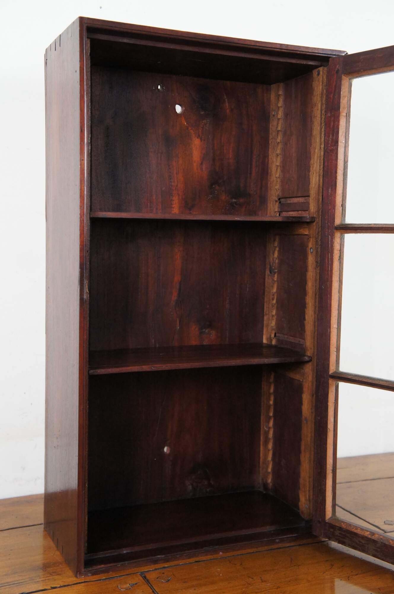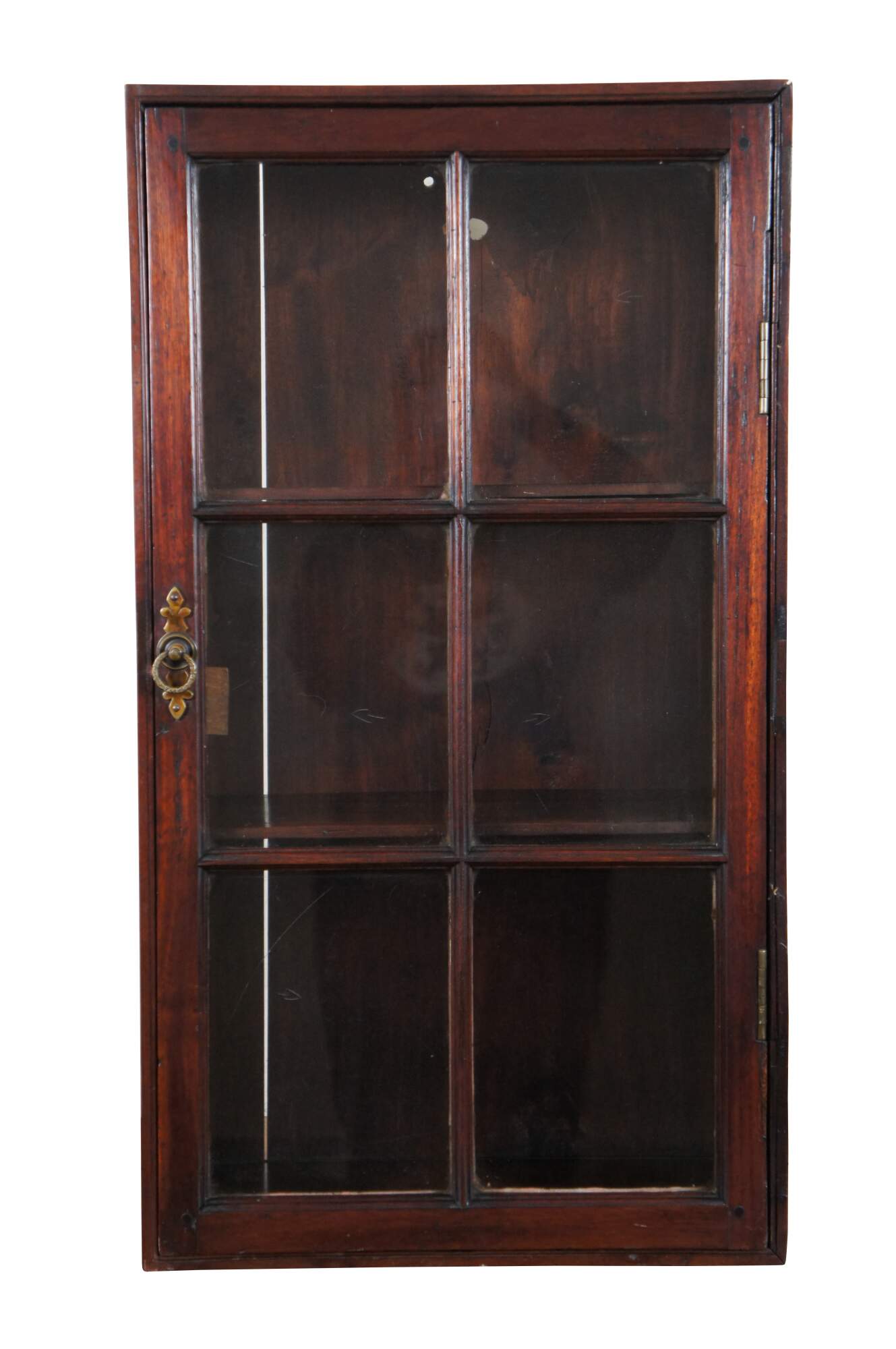 Antique 19th century wall hanging vitrine cabinet or display case featuring rectangular form with hand dovetailed accents, six pane glass front door with rotating latch and two adjustable shelves.