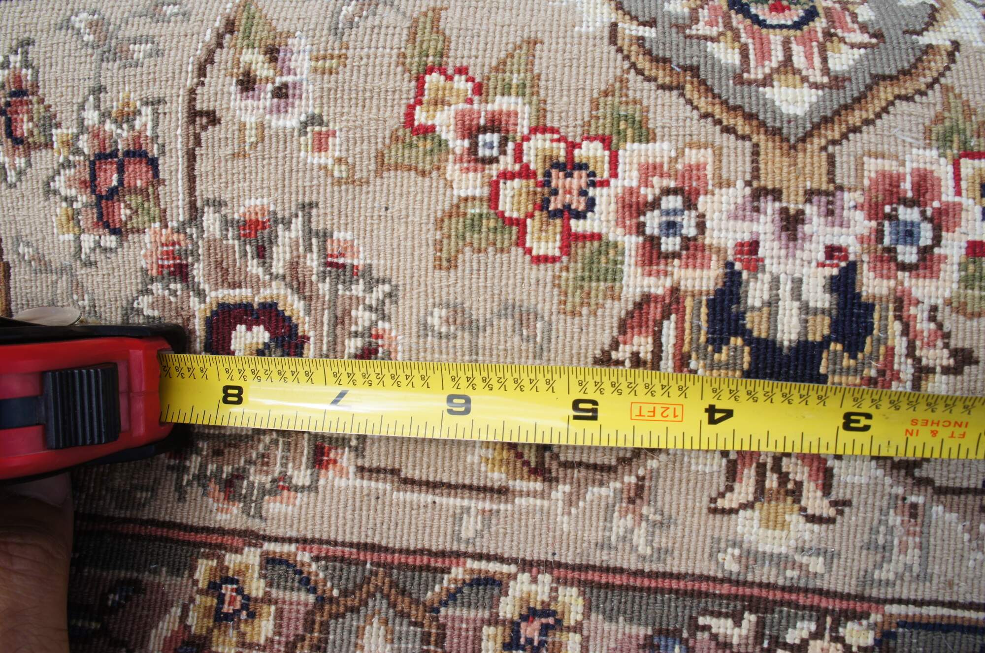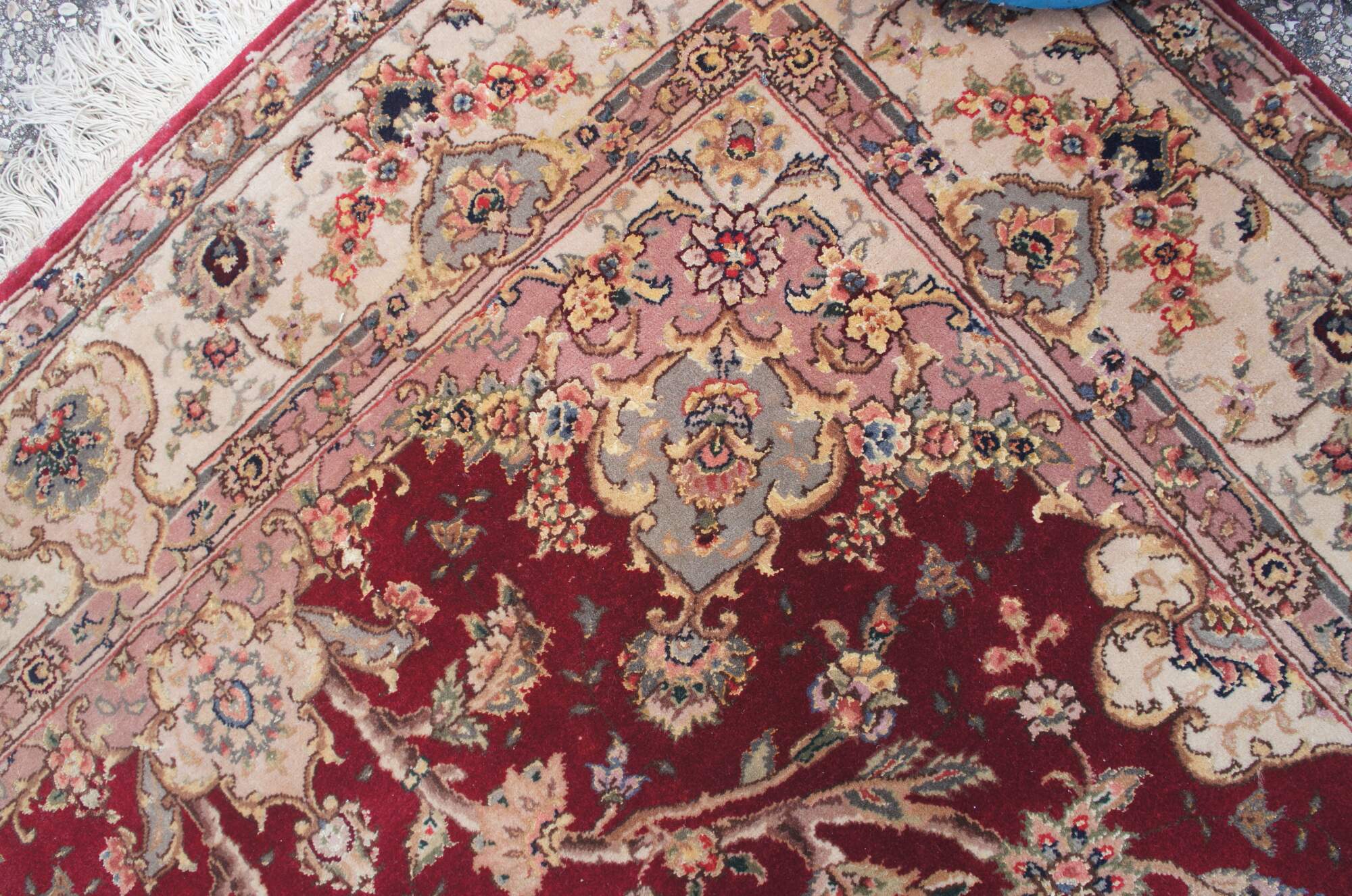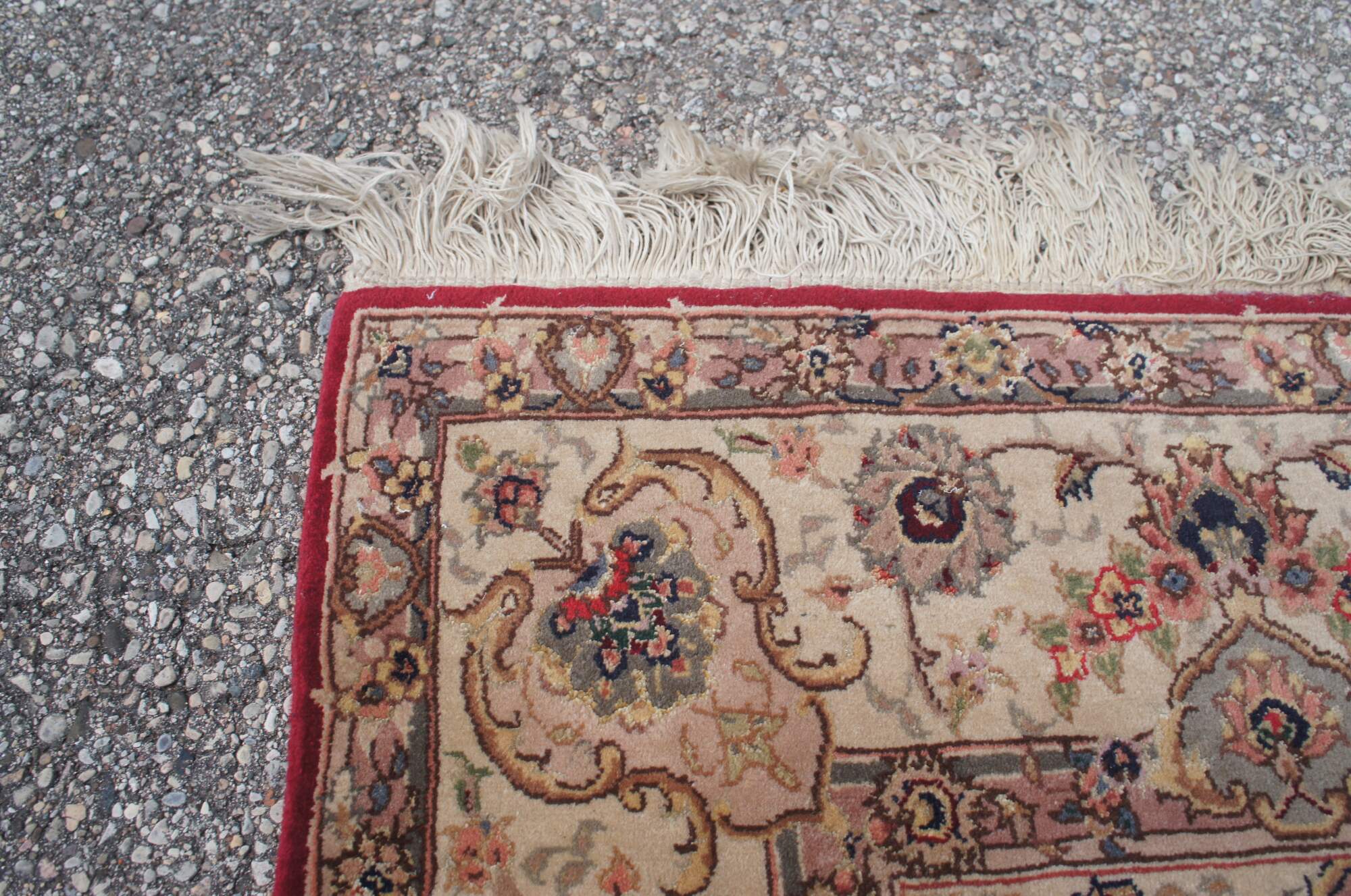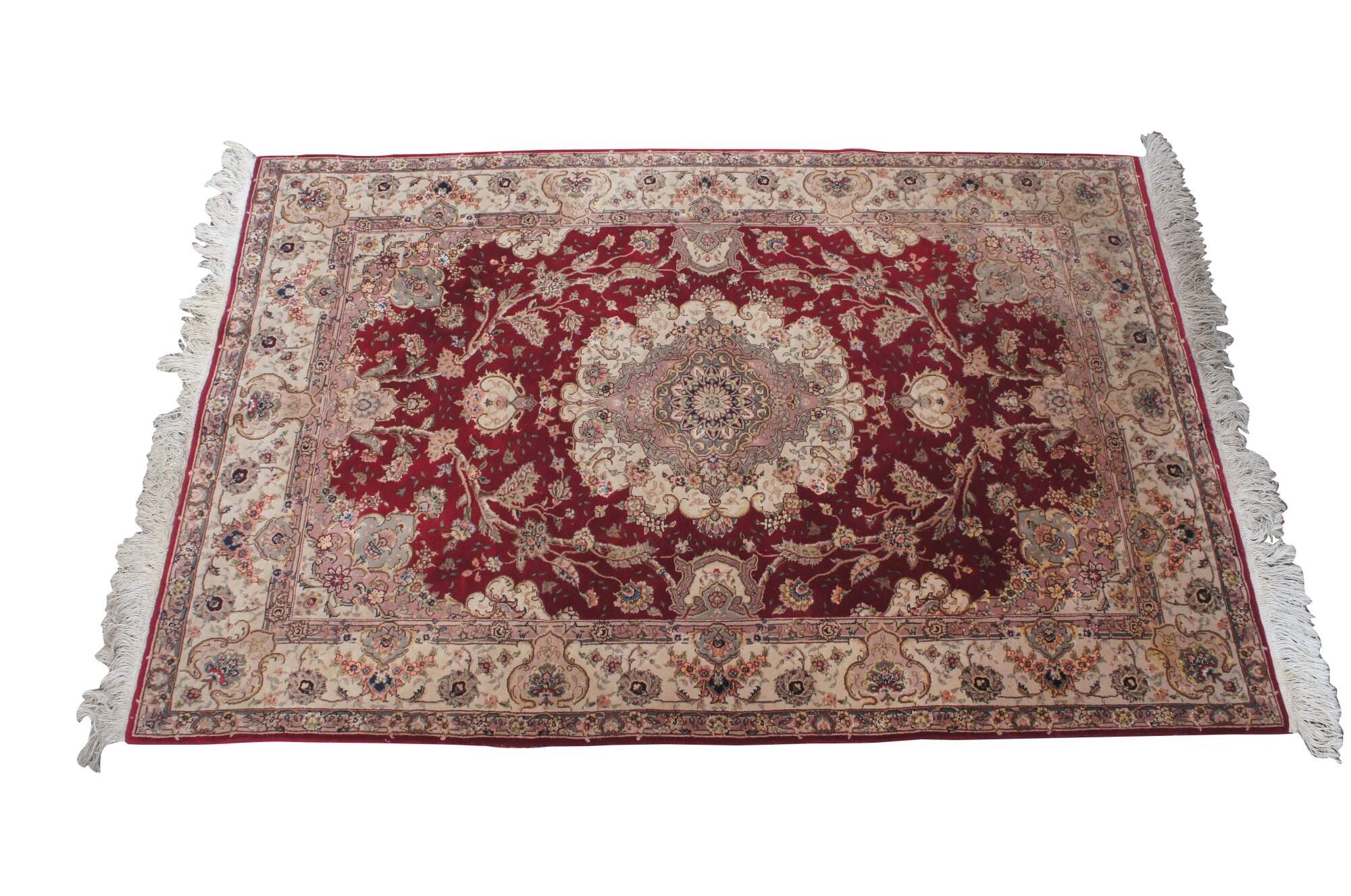 A genuine hand woven oriental area rug. Made from silk and wool with a red field showing beige and pink accents. The vibrant geometric medallion is surrounded by elegant floral sprays. 256 knots per square inch