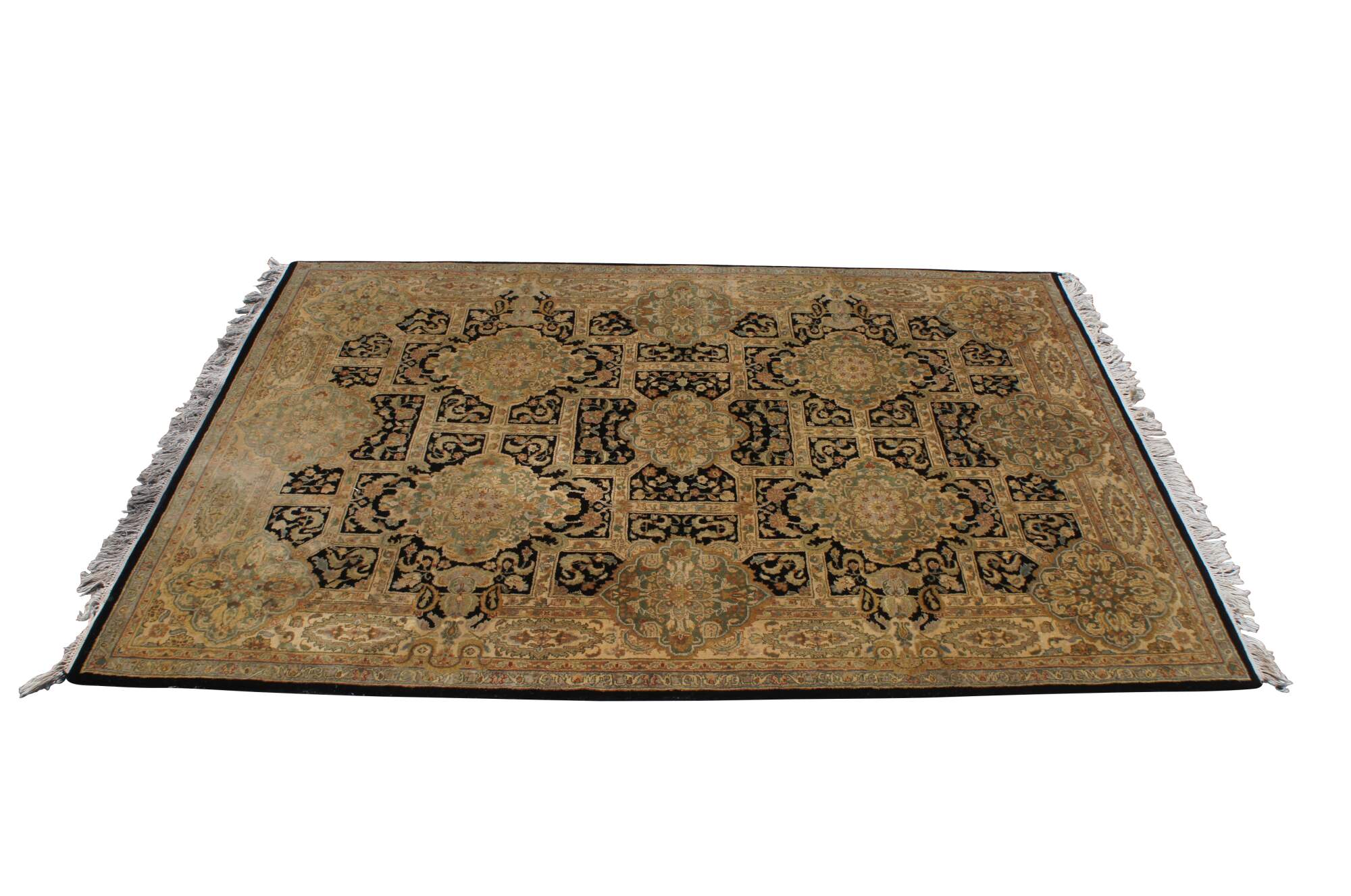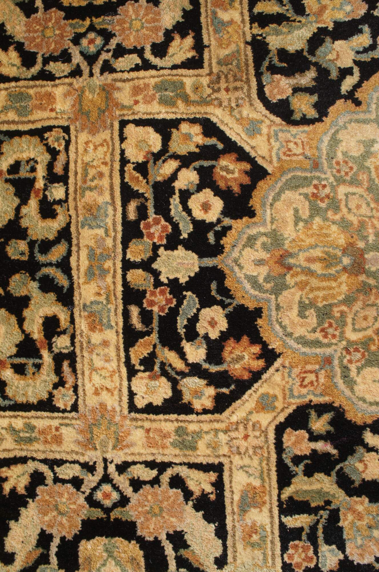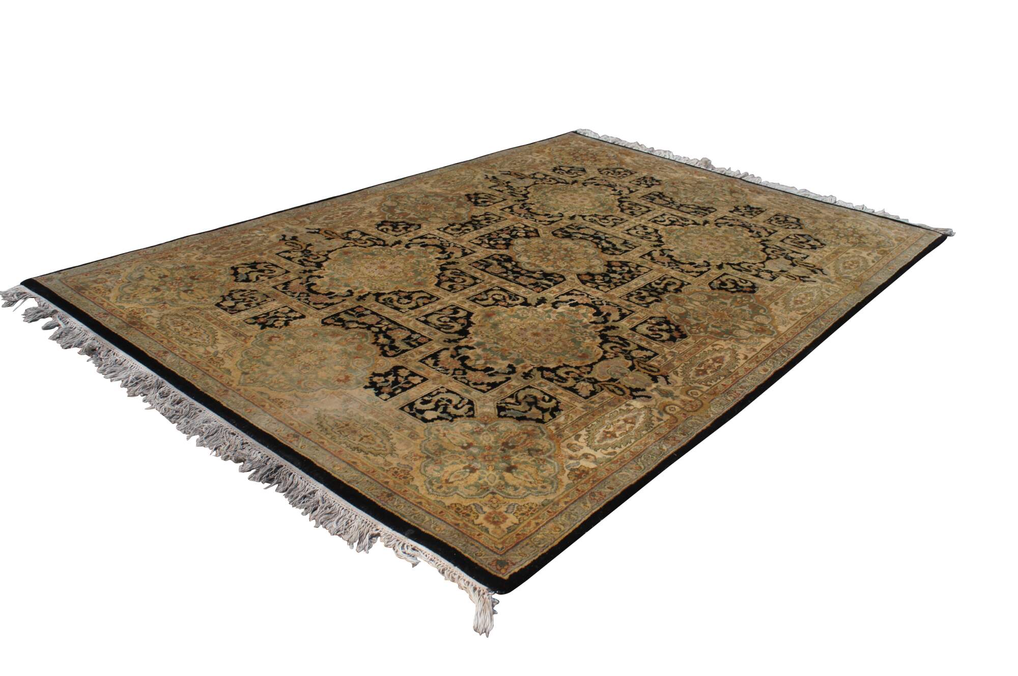 Genuine Oriental area rug, made in India. Hand knotted in Jaipur. Features a floral geometric deisgn in beige and black with some green and red/orange accents. This intricate design is reminiscent of the ceiling of a Palace / Mahal. 144kpsi
