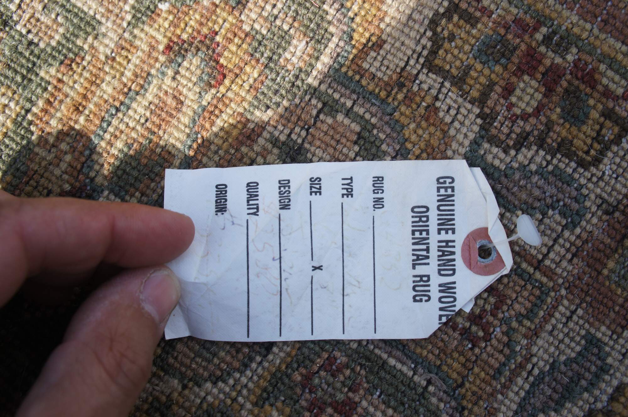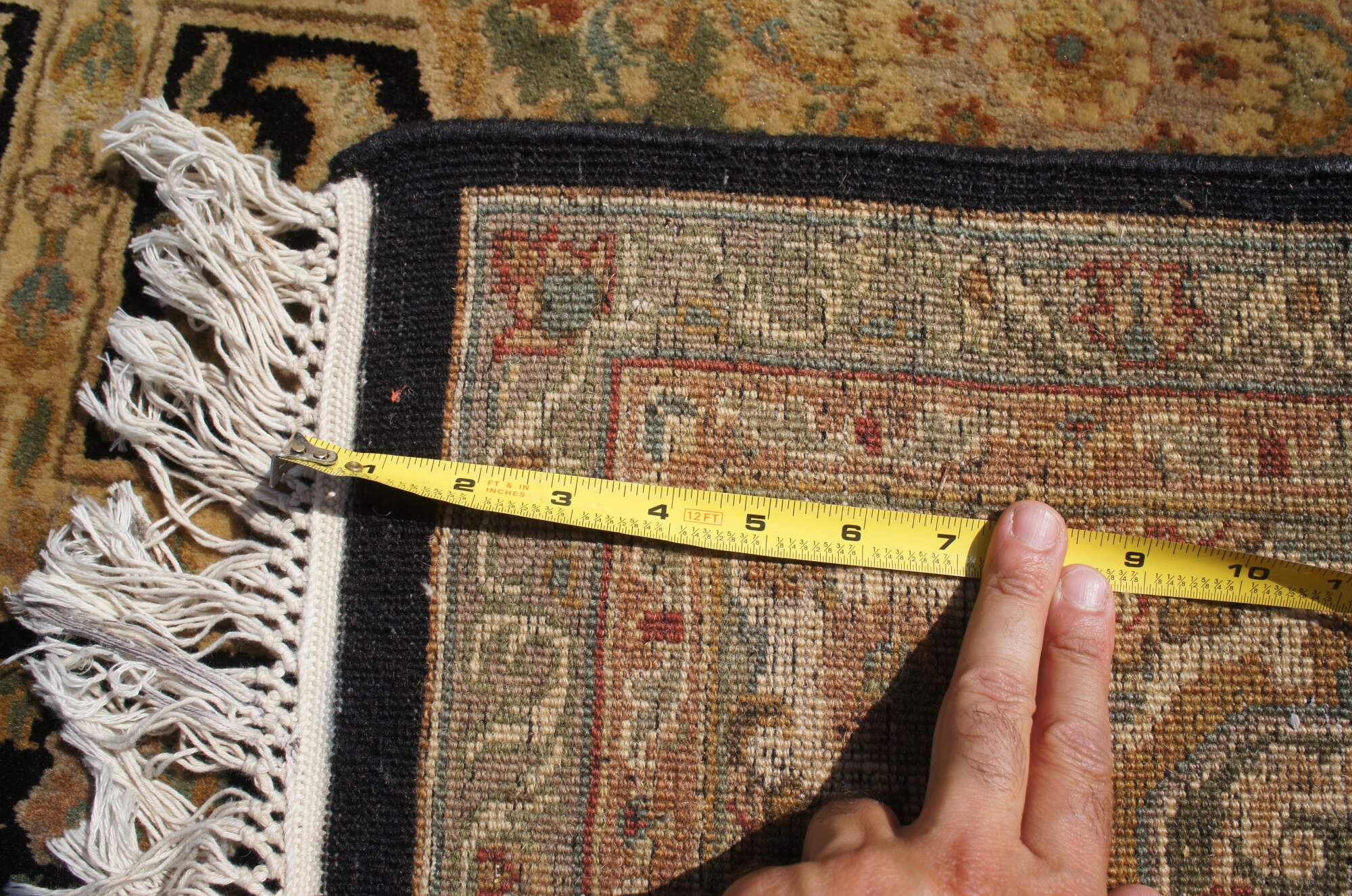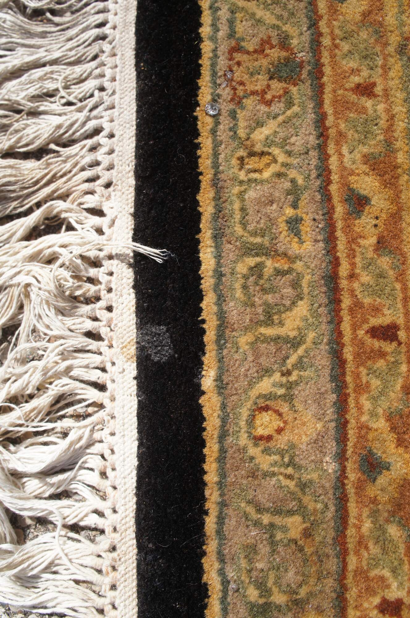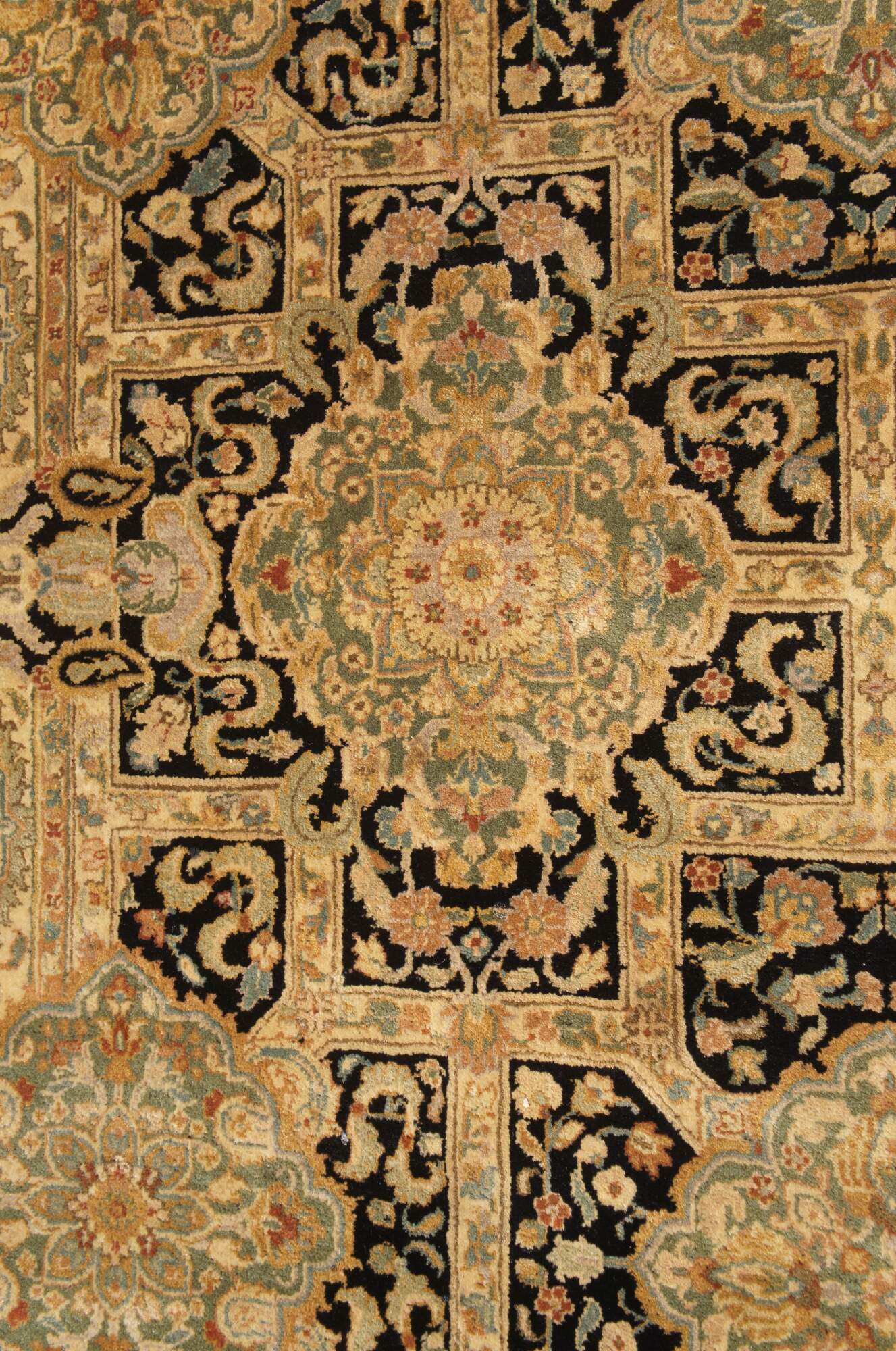 Genuine Oriental area rug, made in India. Hand knotted in Jaipur. Features a floral geometric deisgn in beige and black with some green and red/orange accents. This intricate design is reminiscent of the ceiling of a Palace / Mahal. 144kpsi
