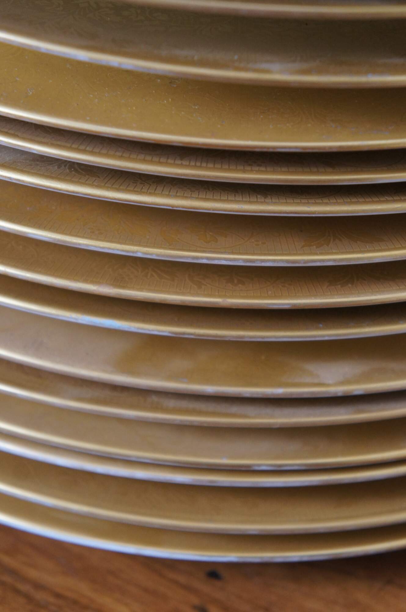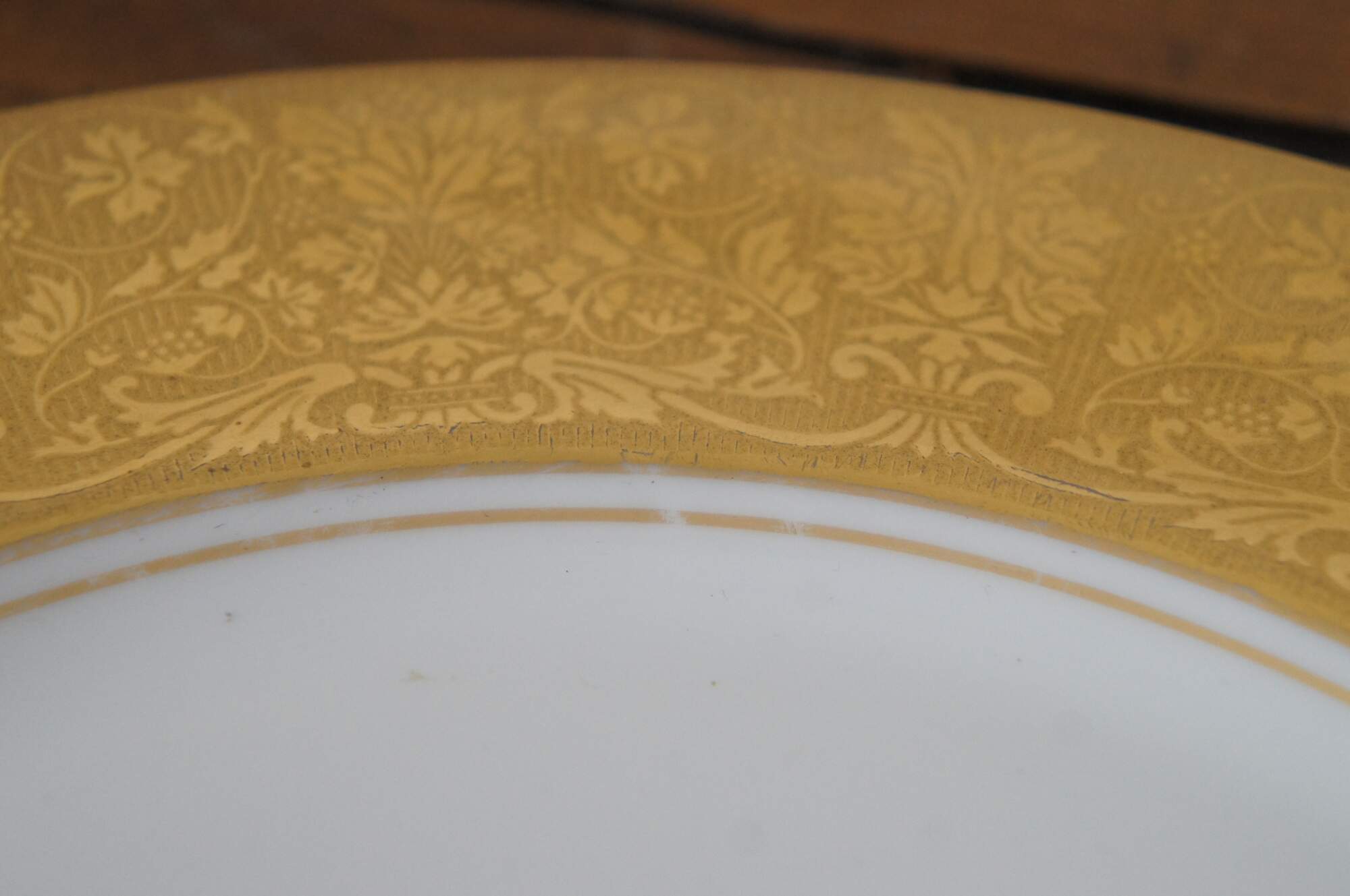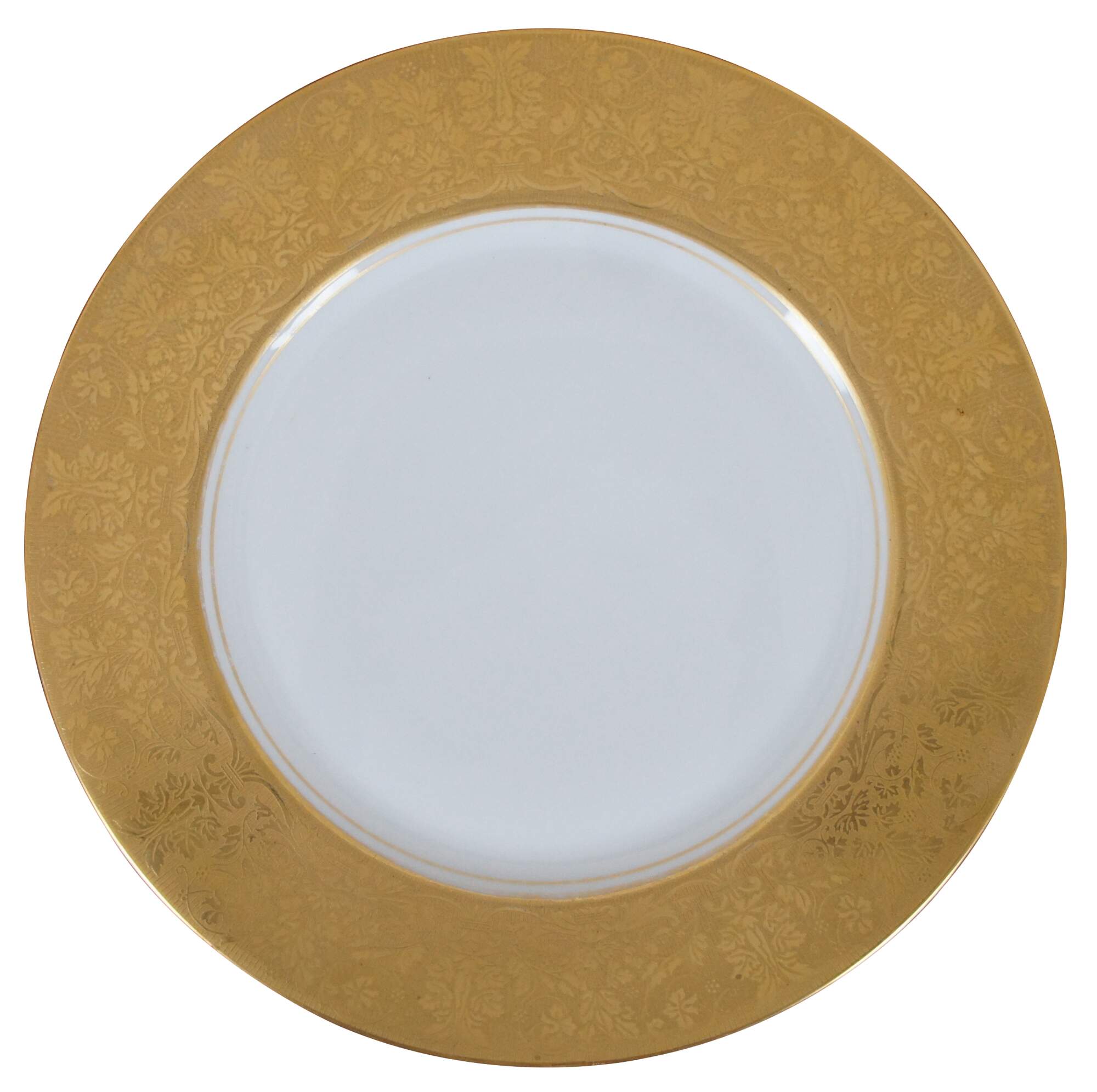 Set of 16 Heinrich & Company porcelain china dinner plates with broad edges encrusted in gold, embossed with florals, urns and grape vines.