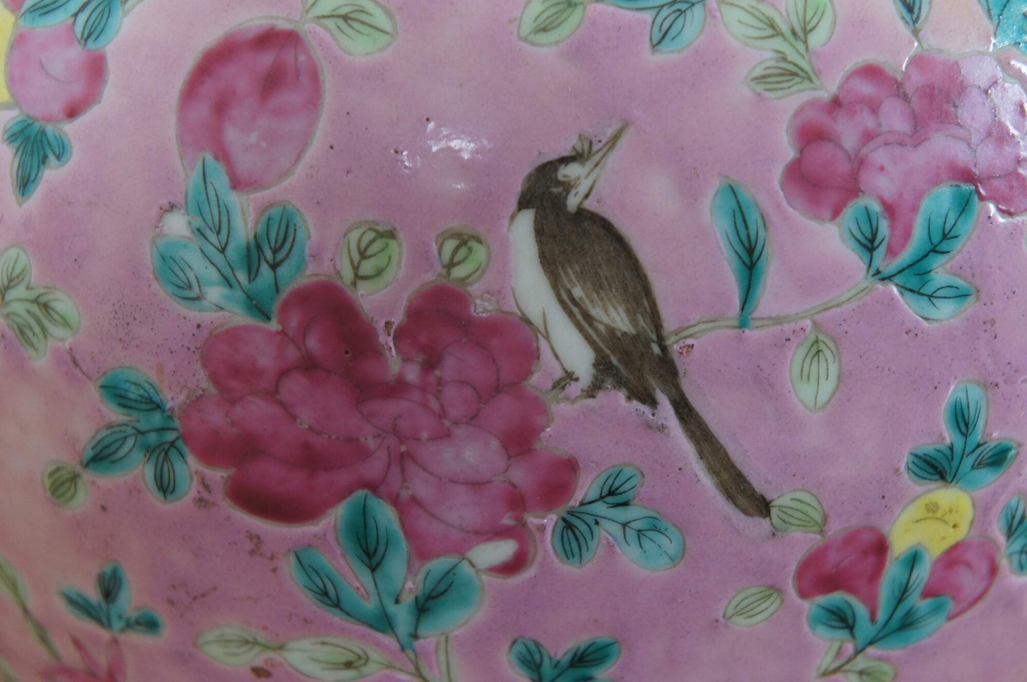 Vintage Chinese famille rose porcelain ginger jar featuring flowers and a bird on a pink and yellow background with wooden lid and stand. Made in the People’s Republic of China.
