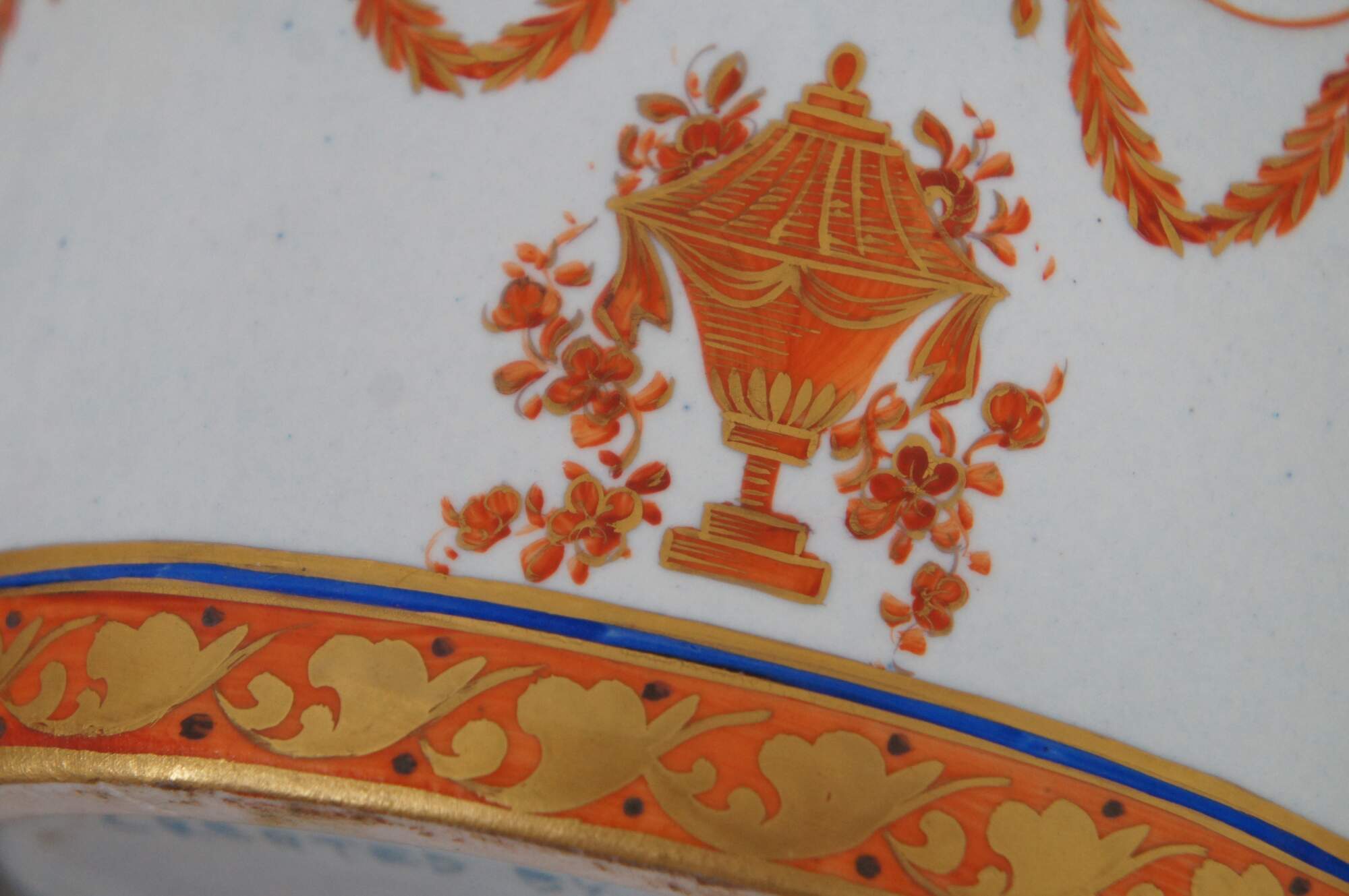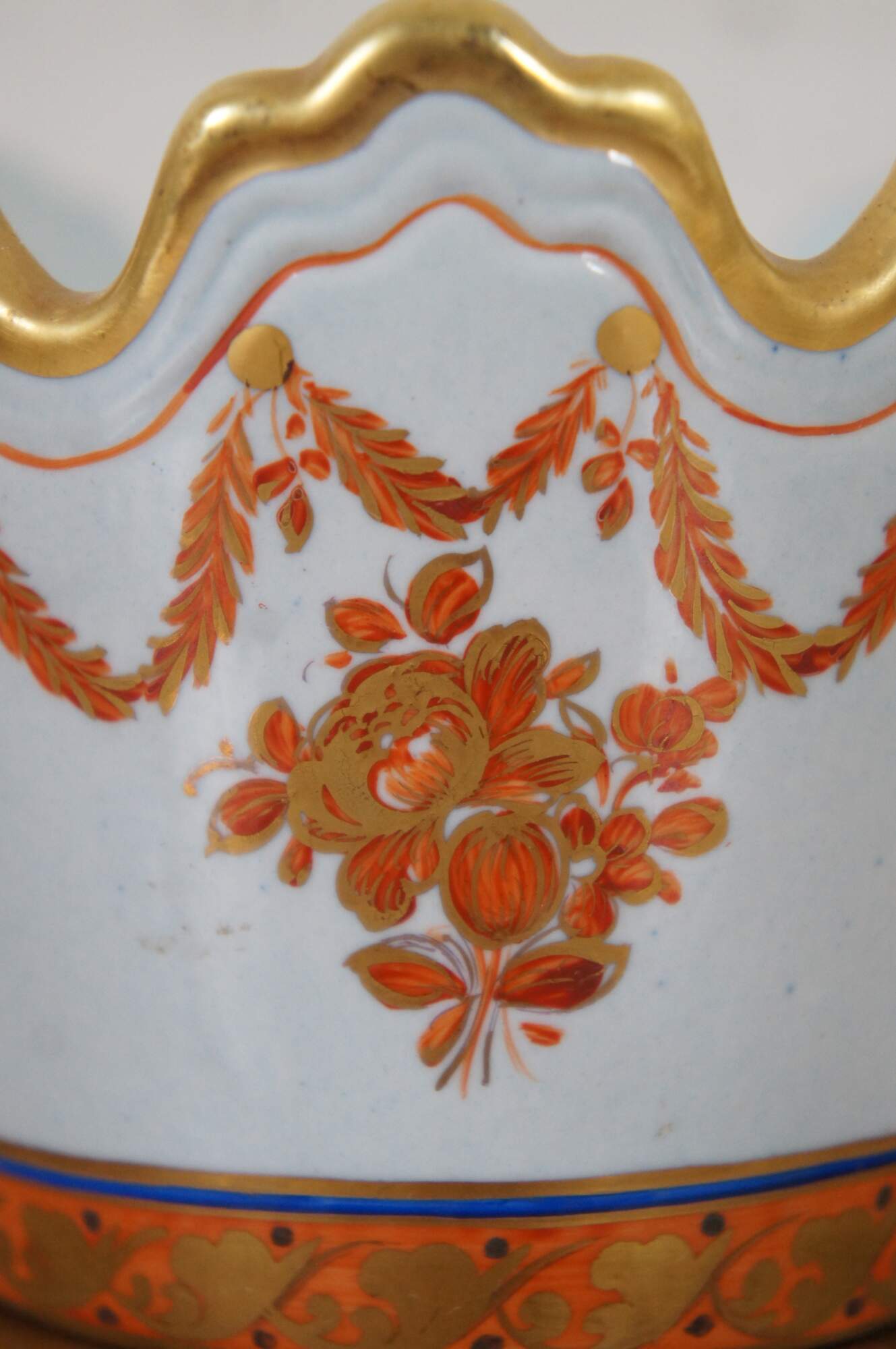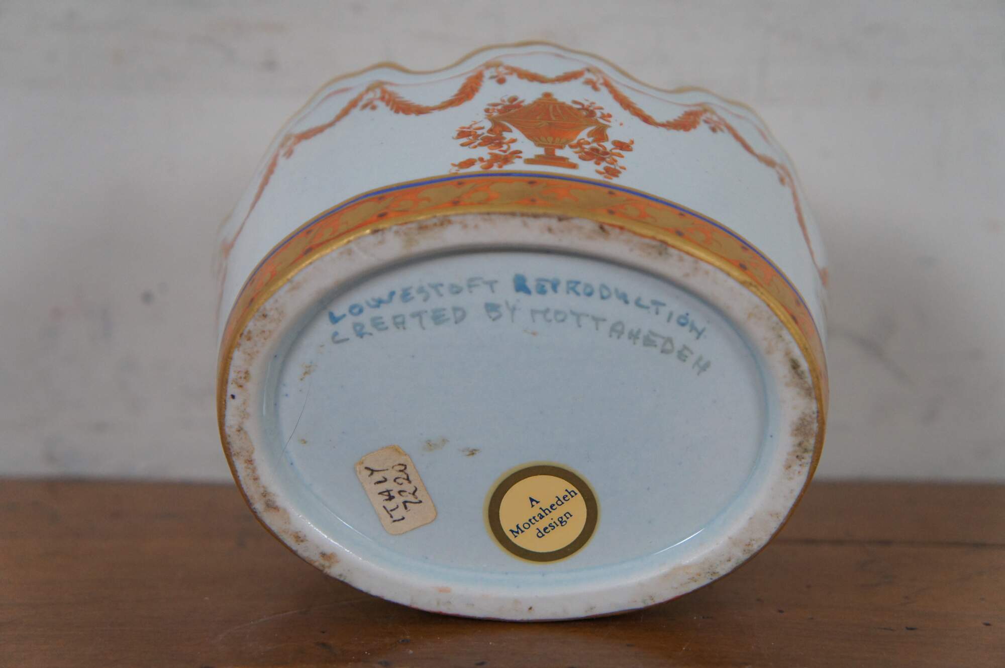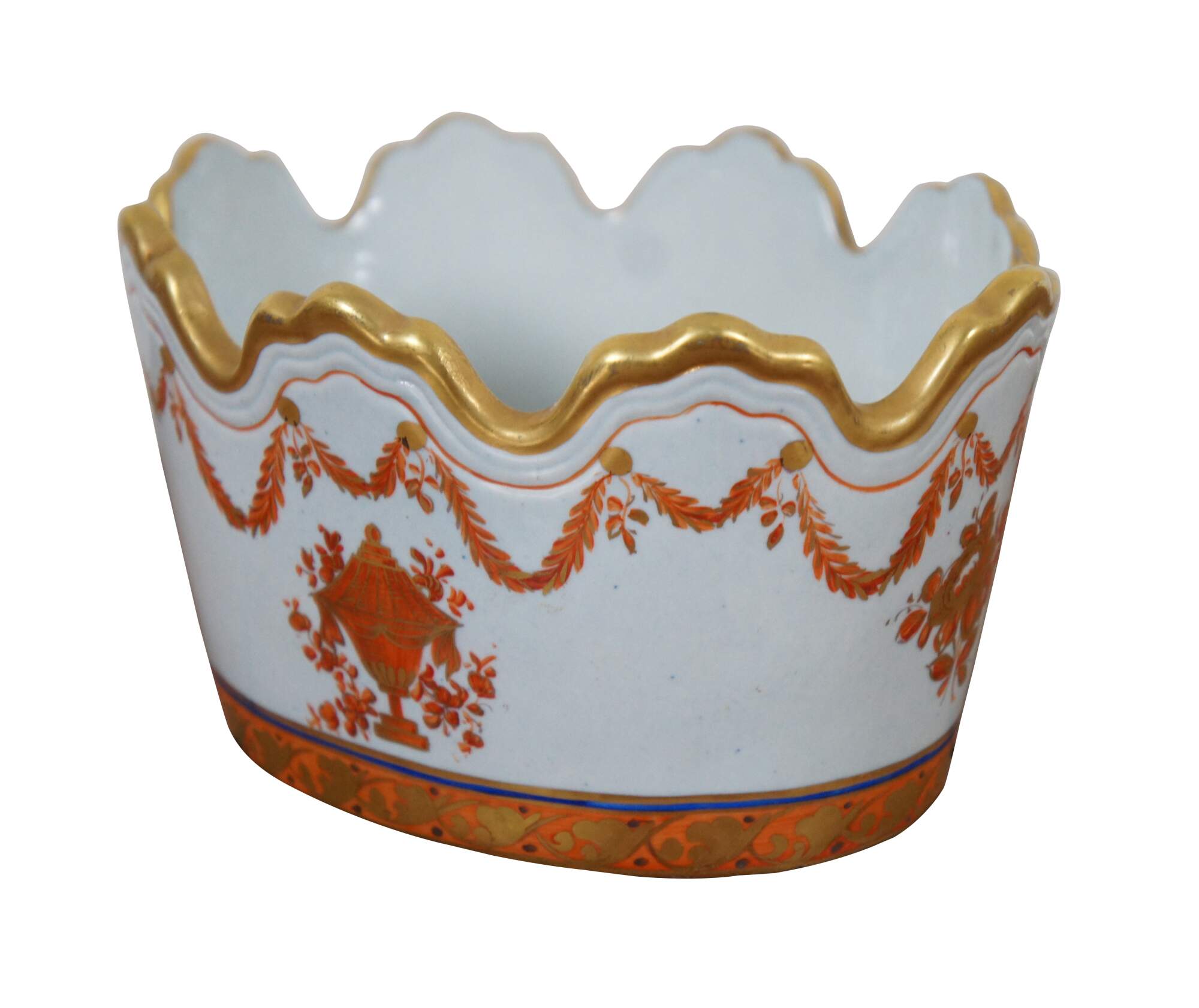 Lowestoft Reproduction Monteith nut / candy dish / cachepot by Mottahedeh featuring an oval form with gilded scalloped crown shaped edge and painted with orange neoclassical foliage with central trophy urn and cobalt blue band.