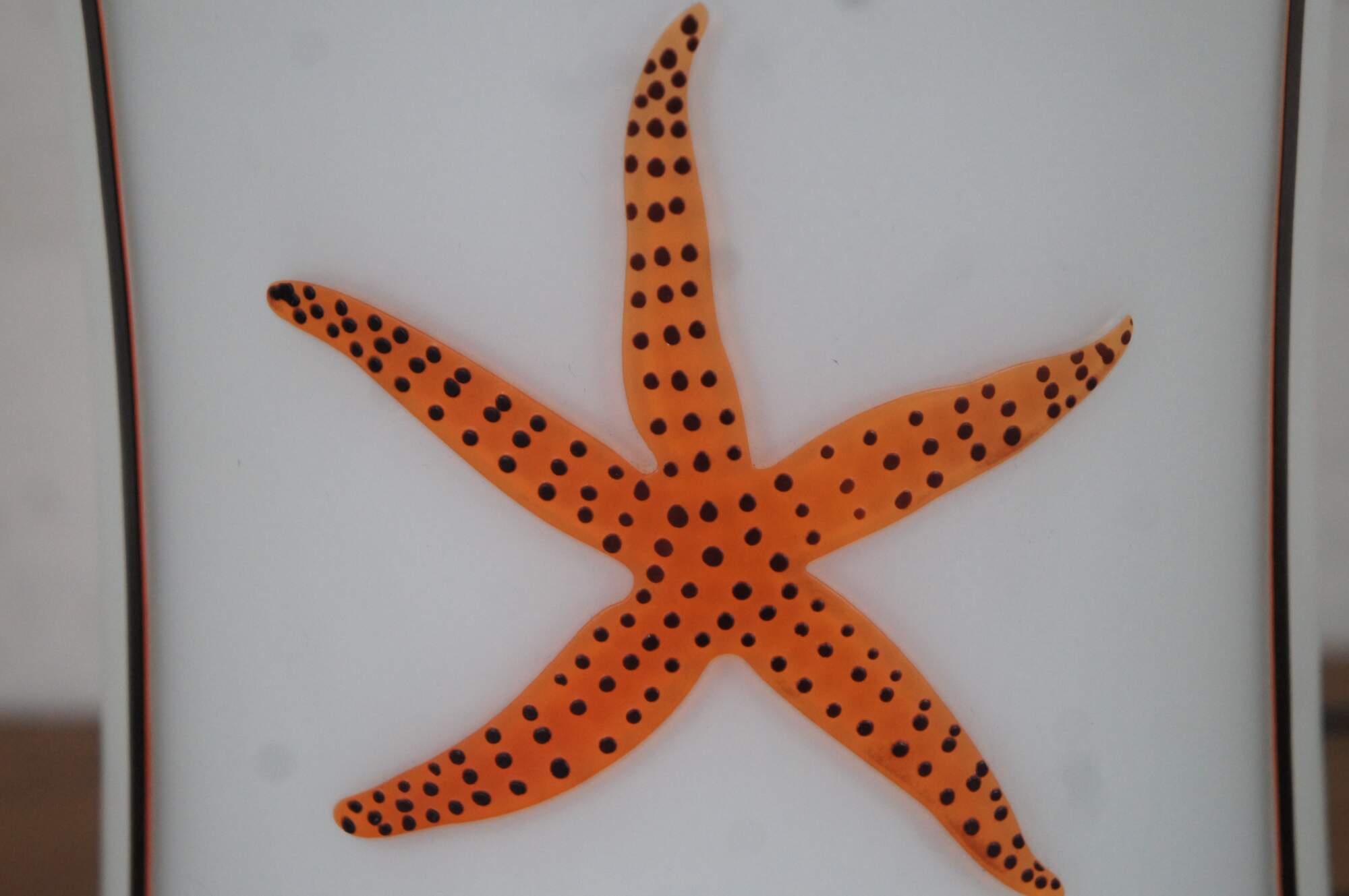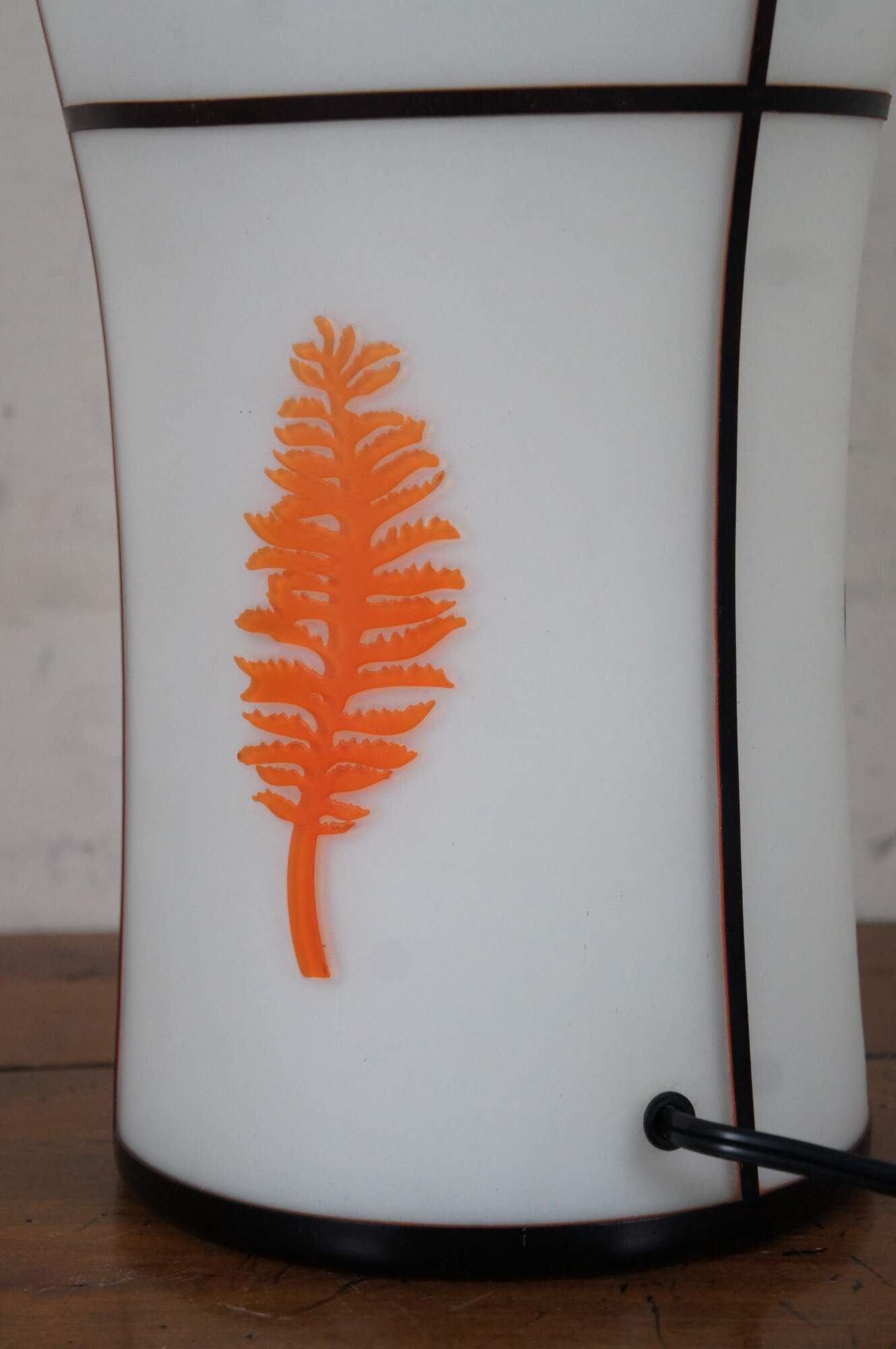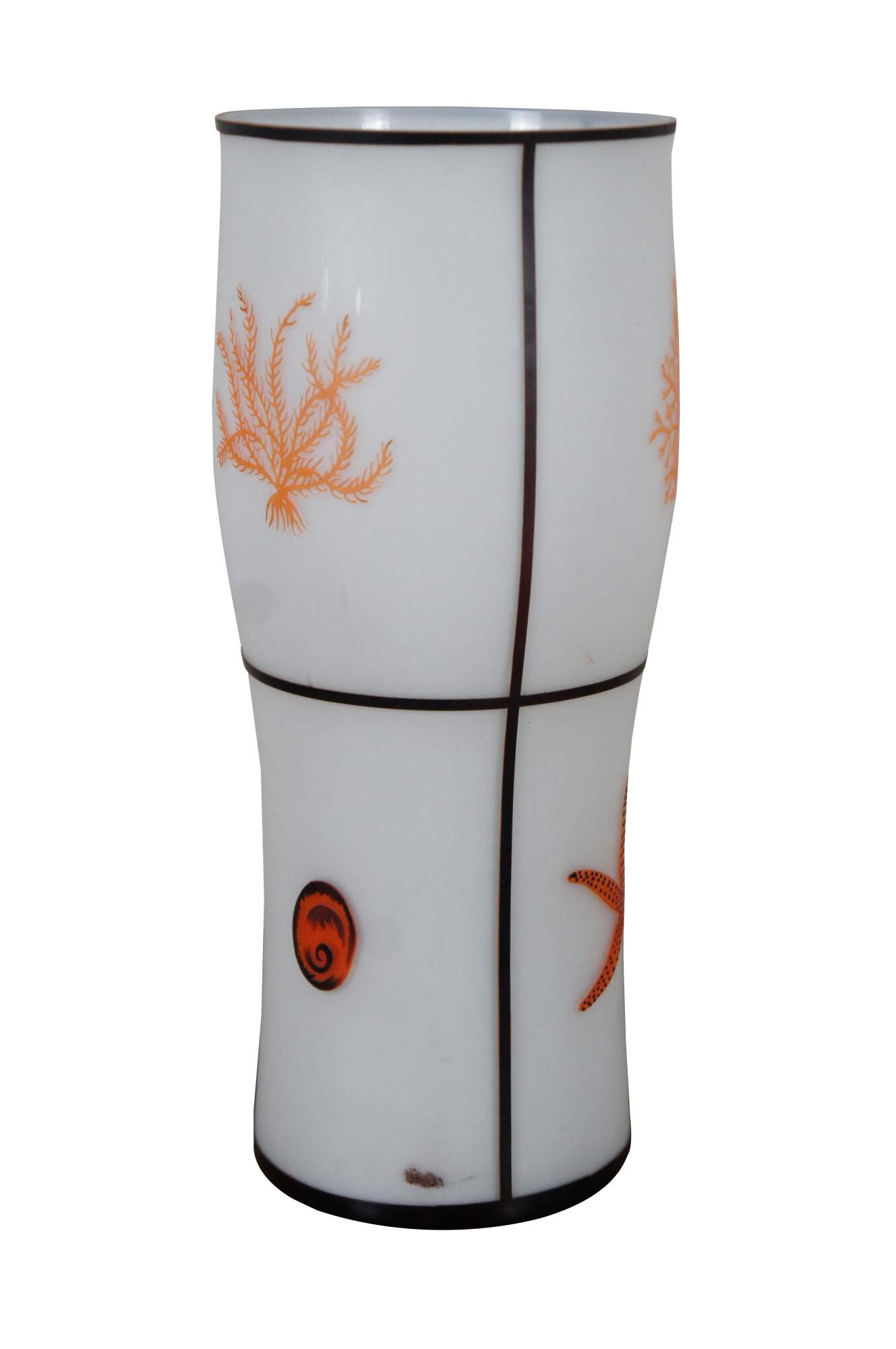 Tozai Home white frosted glass tapered canister shaped table lamp featuring segmented sections blazoned with orange sea creatures and coral.