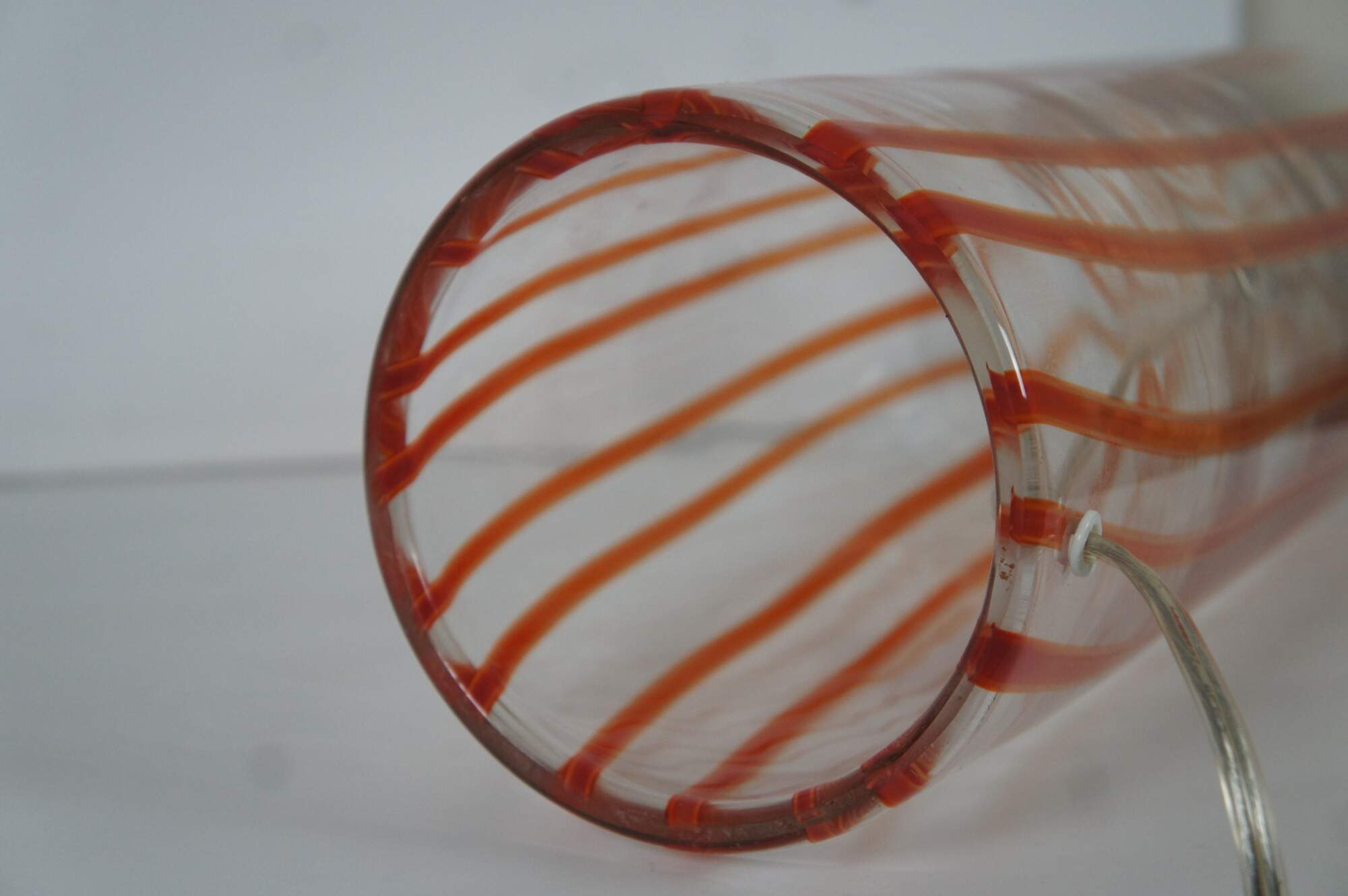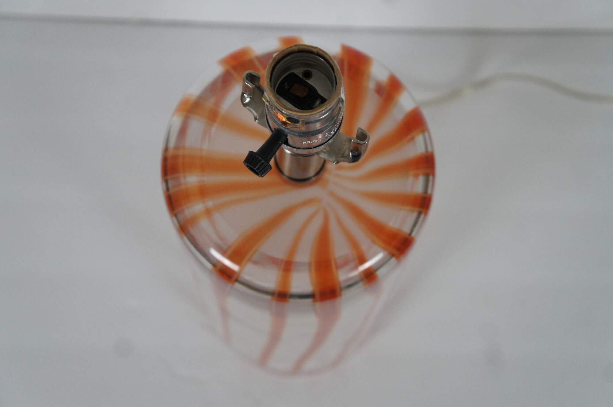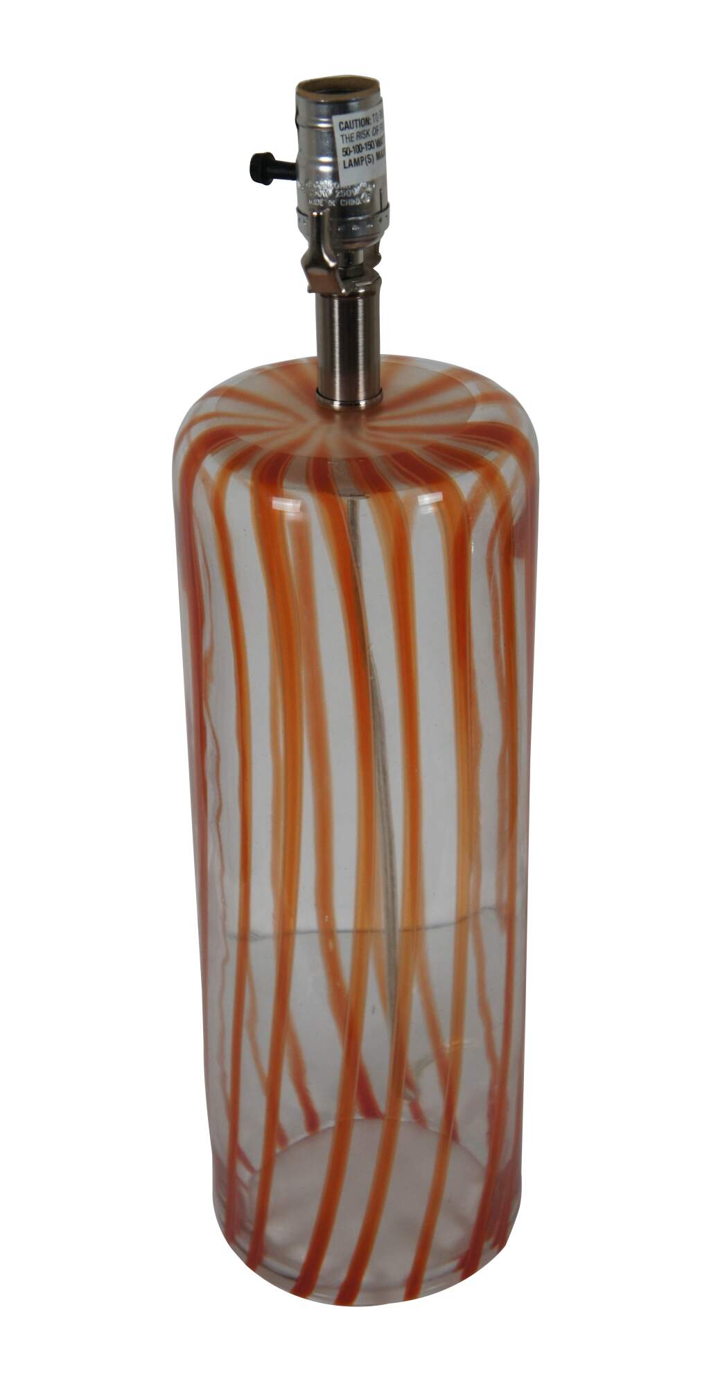 Vintage clear and orange candy stripe art glass hollow base cylindrical table lamp, with clear ball finial.