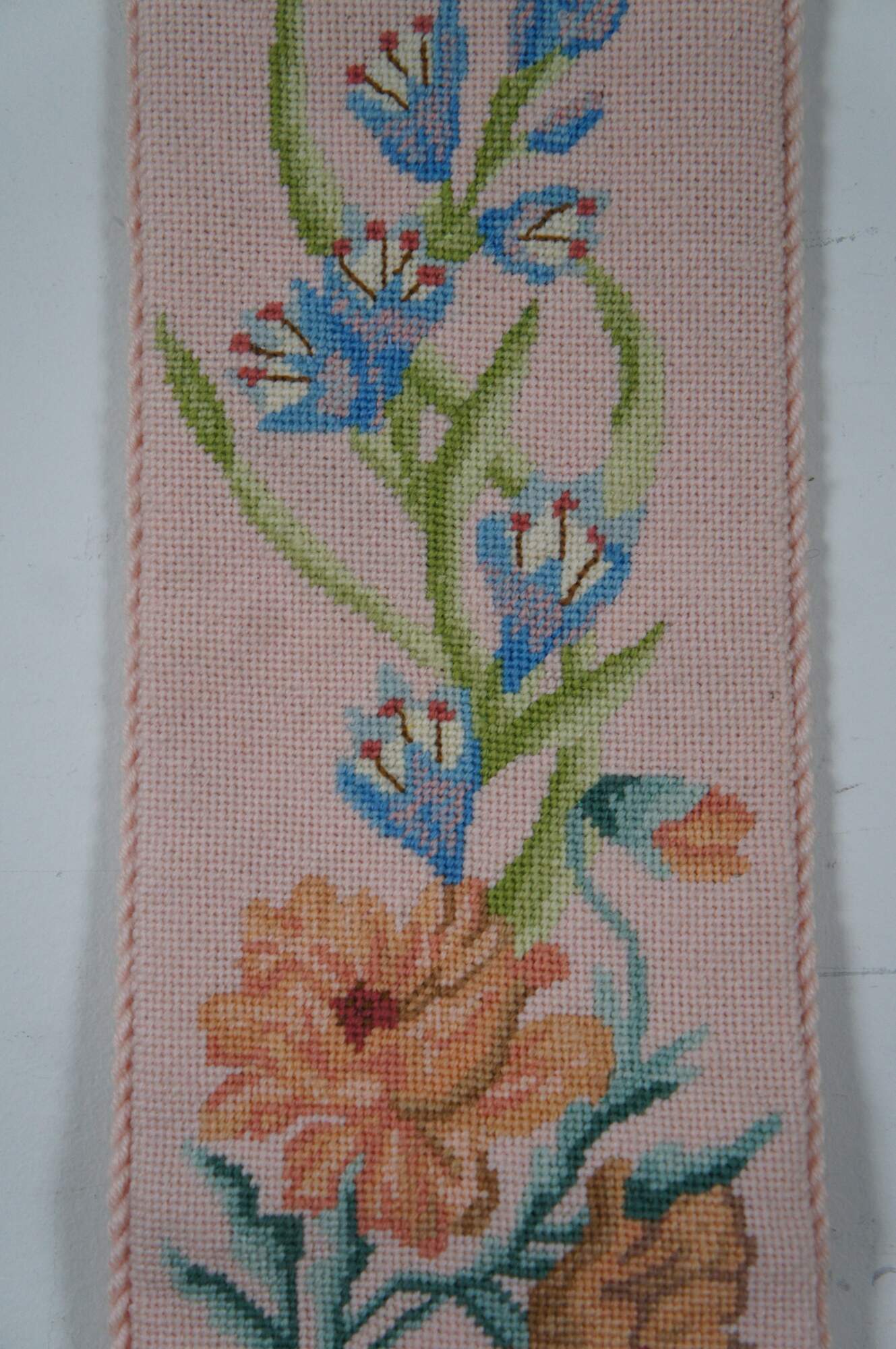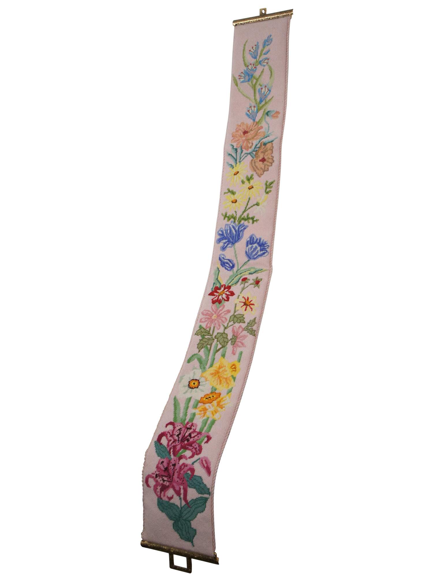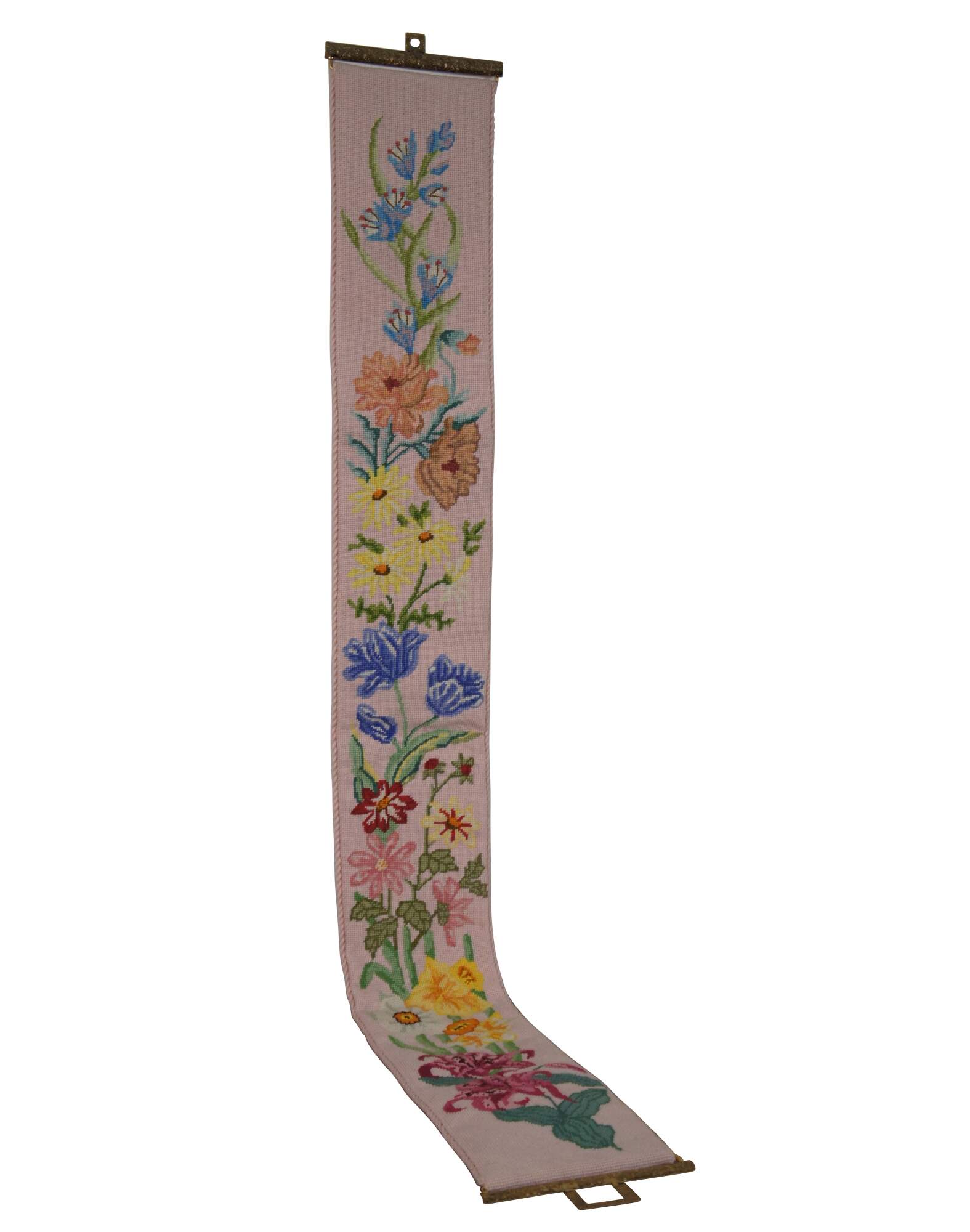 Vintage floral needlepoint embroidered bell pull or wall hanging featuring a variety of multicolored flowers on a pink background, supports by floral brass ends.