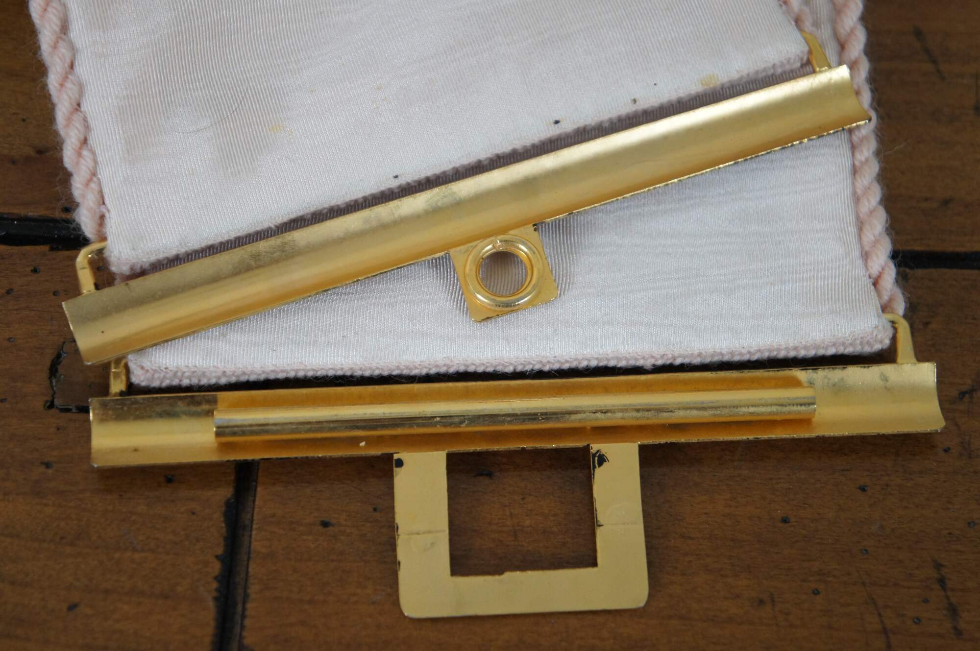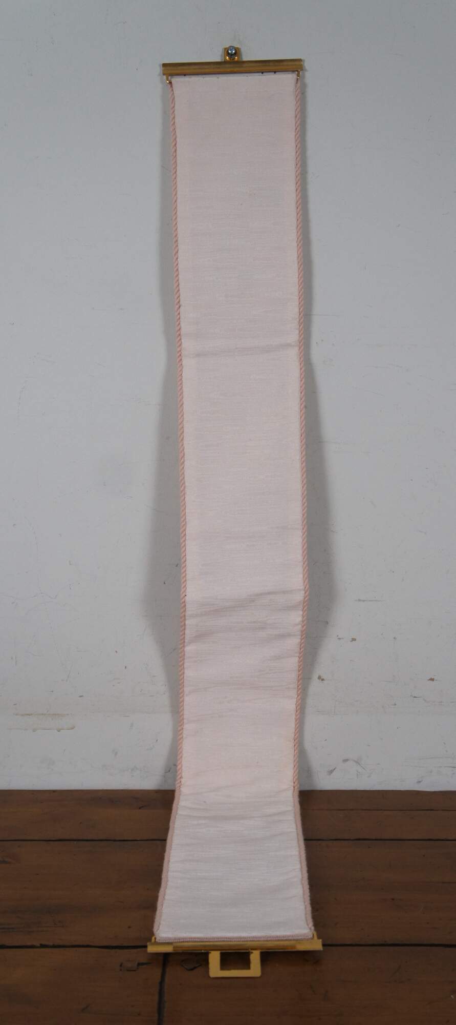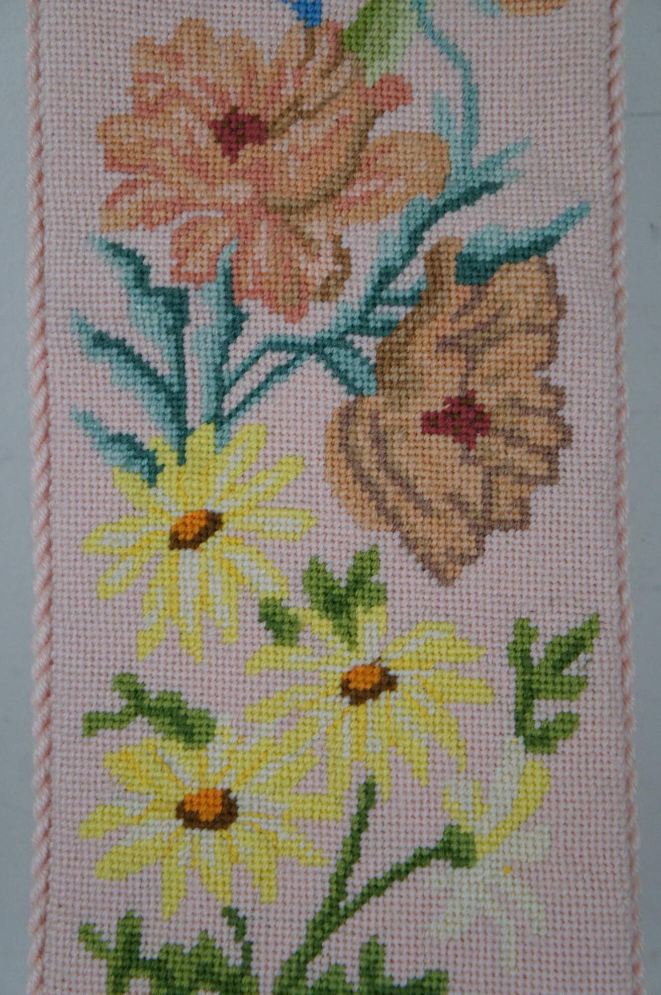 Vintage floral needlepoint embroidered bell pull or wall hanging featuring a variety of multicolored flowers on a pink background, supports by floral brass ends.