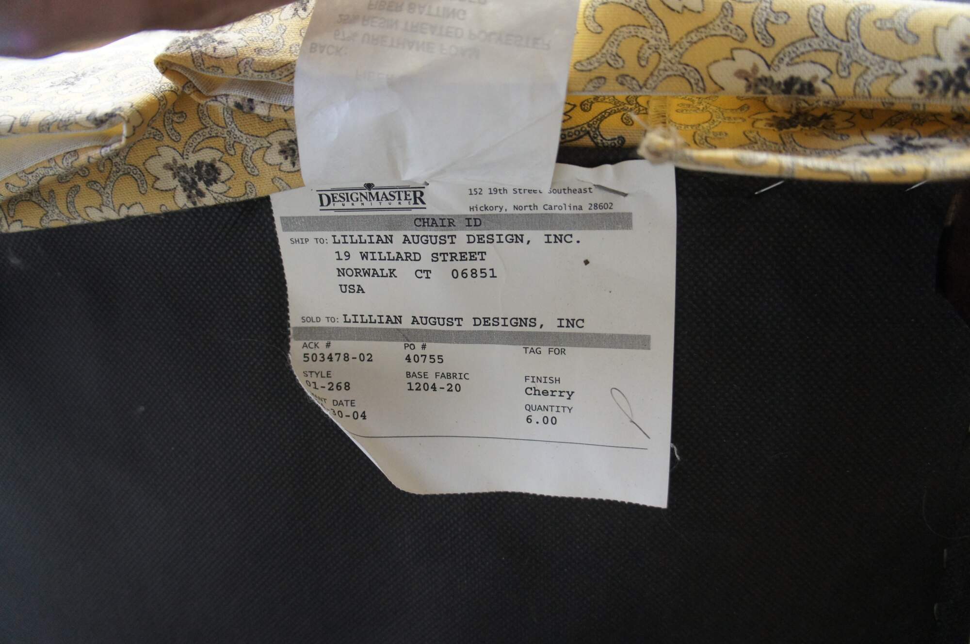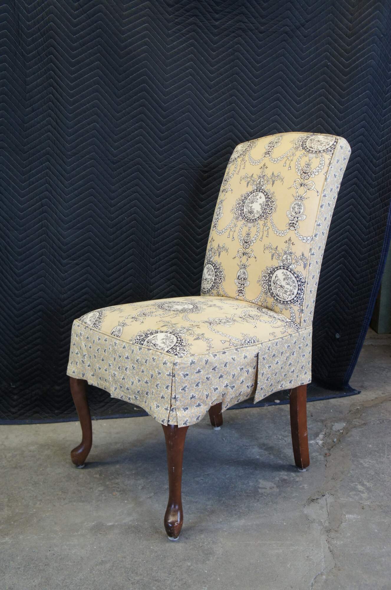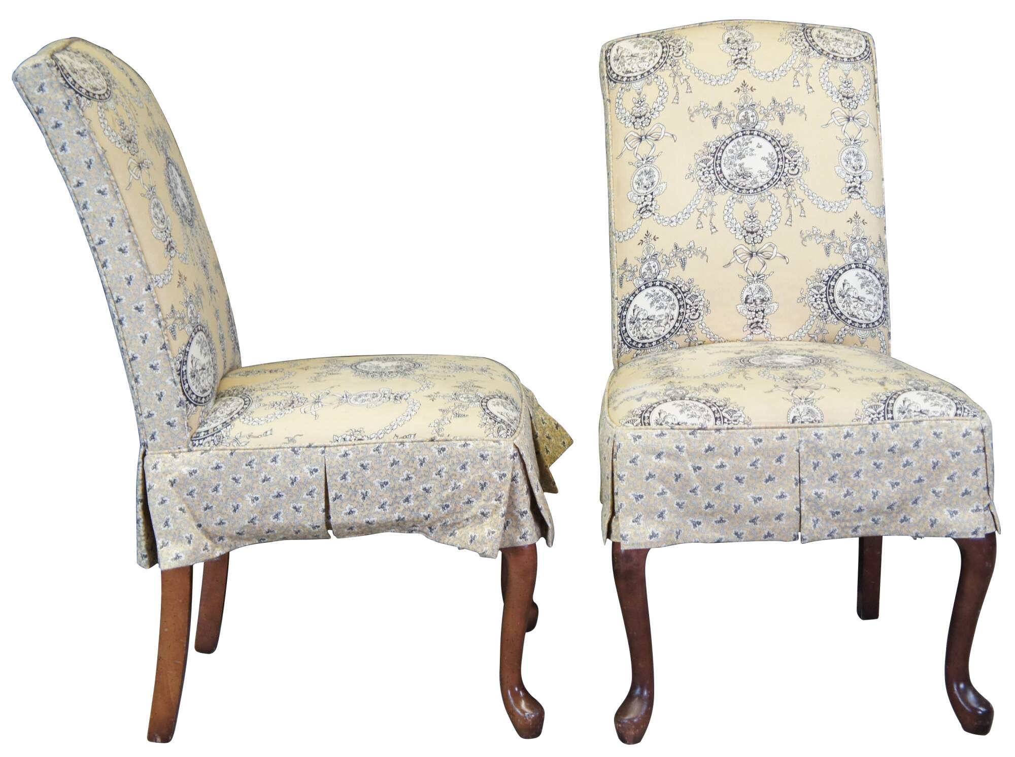 Six vintage Queen Anne style dining chairs featuring Neoclassical toile style upholstery with landscape scenes of a man and his dog; and a boy with his horse, surrounded by wreaths, bows and foliate. Made by Designmaster for Lillian August circa 2004. MSRP $498 each.