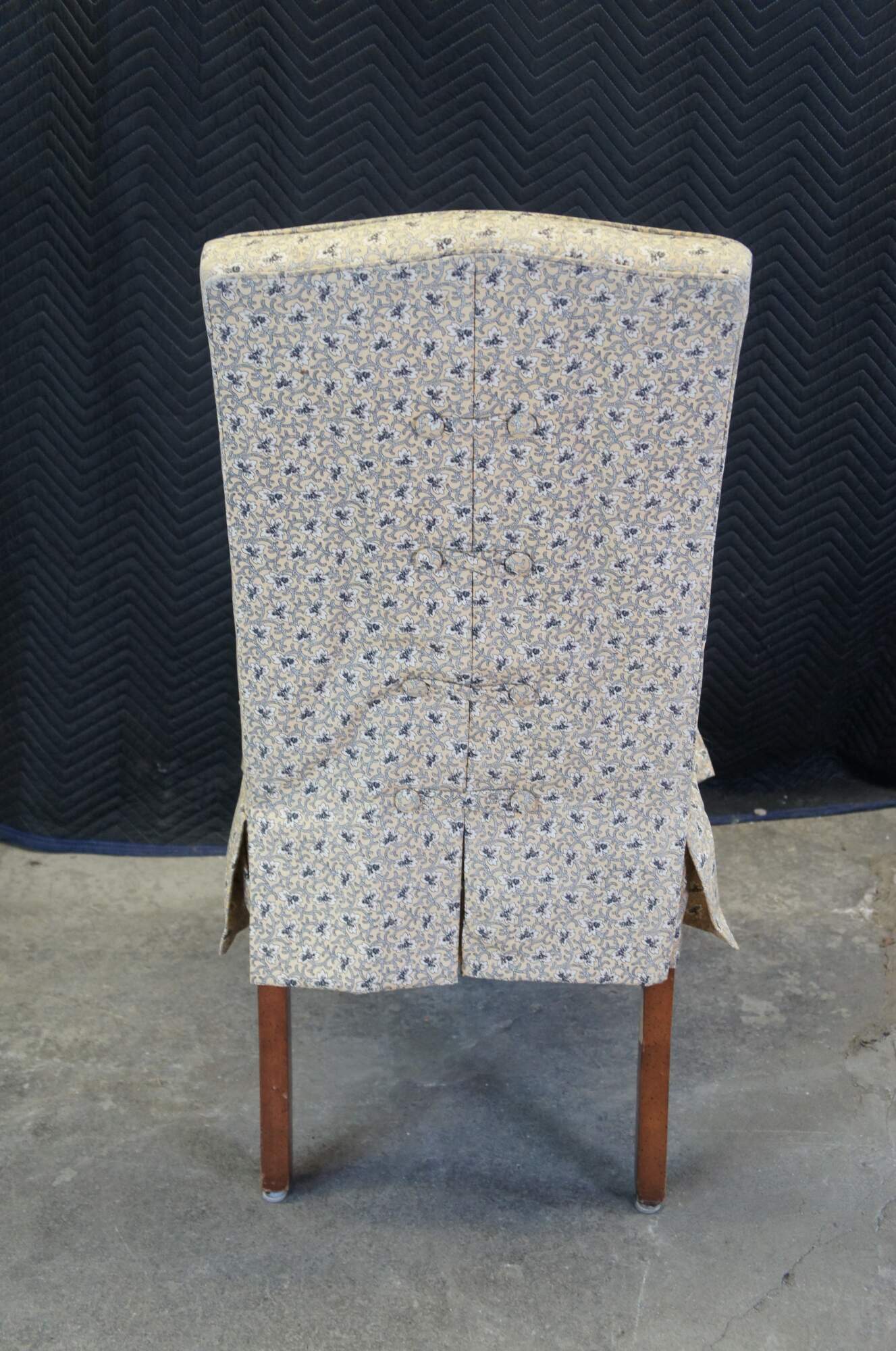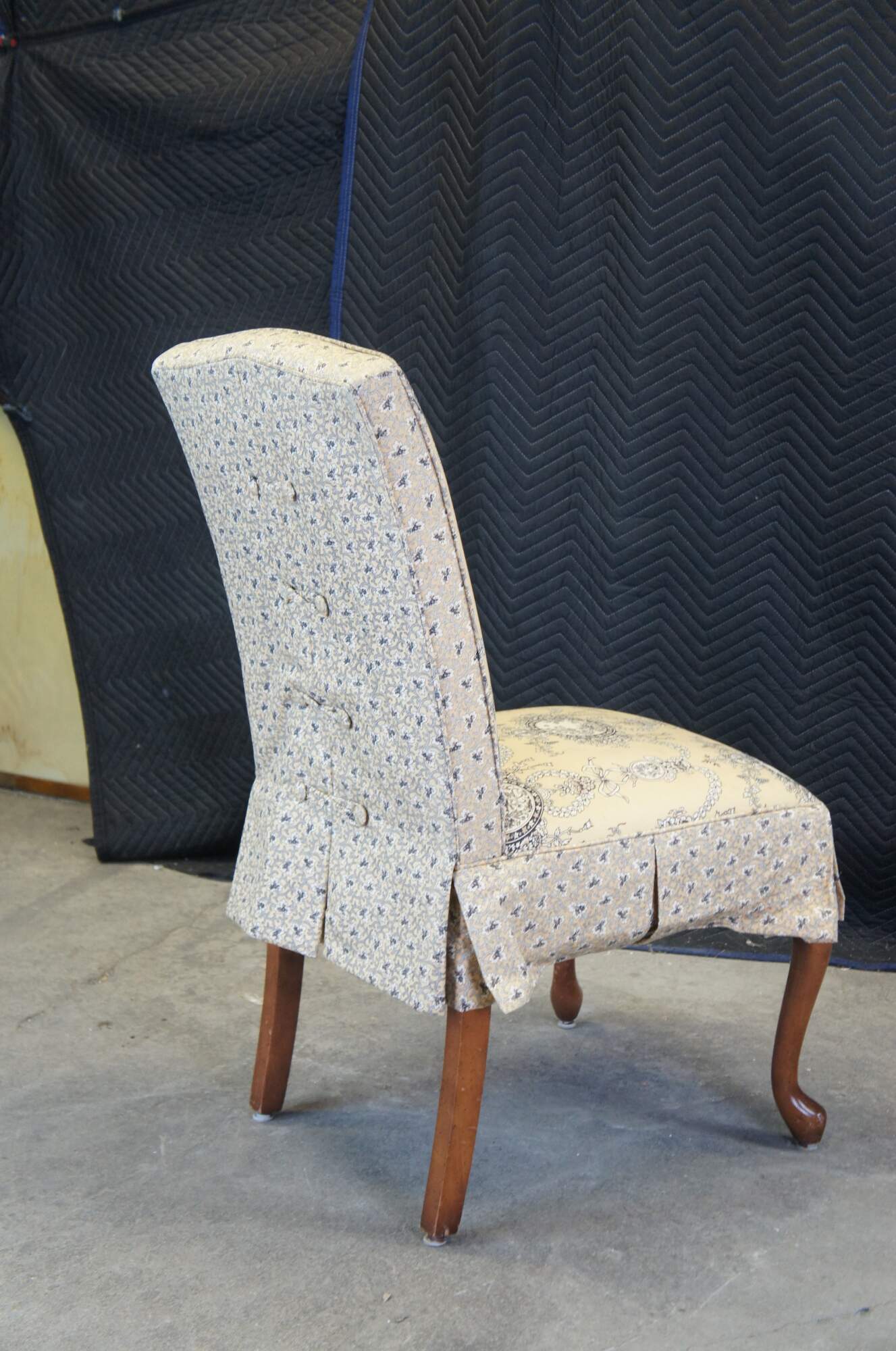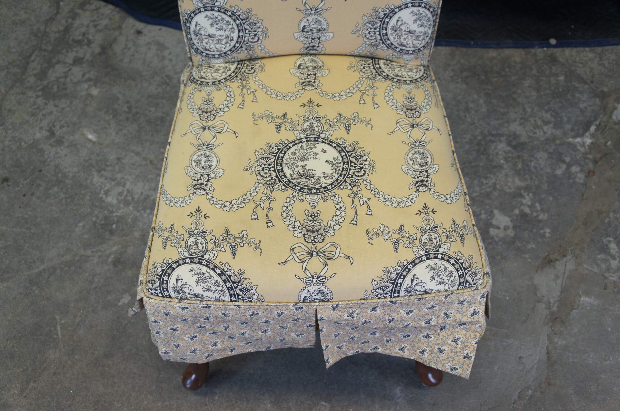 Six vintage Queen Anne style dining chairs featuring Neoclassical toile style upholstery with landscape scenes of a man and his dog; and a boy with his horse, surrounded by wreaths, bows and foliate. Made by Designmaster for Lillian August circa 2004. MSRP $498 each.