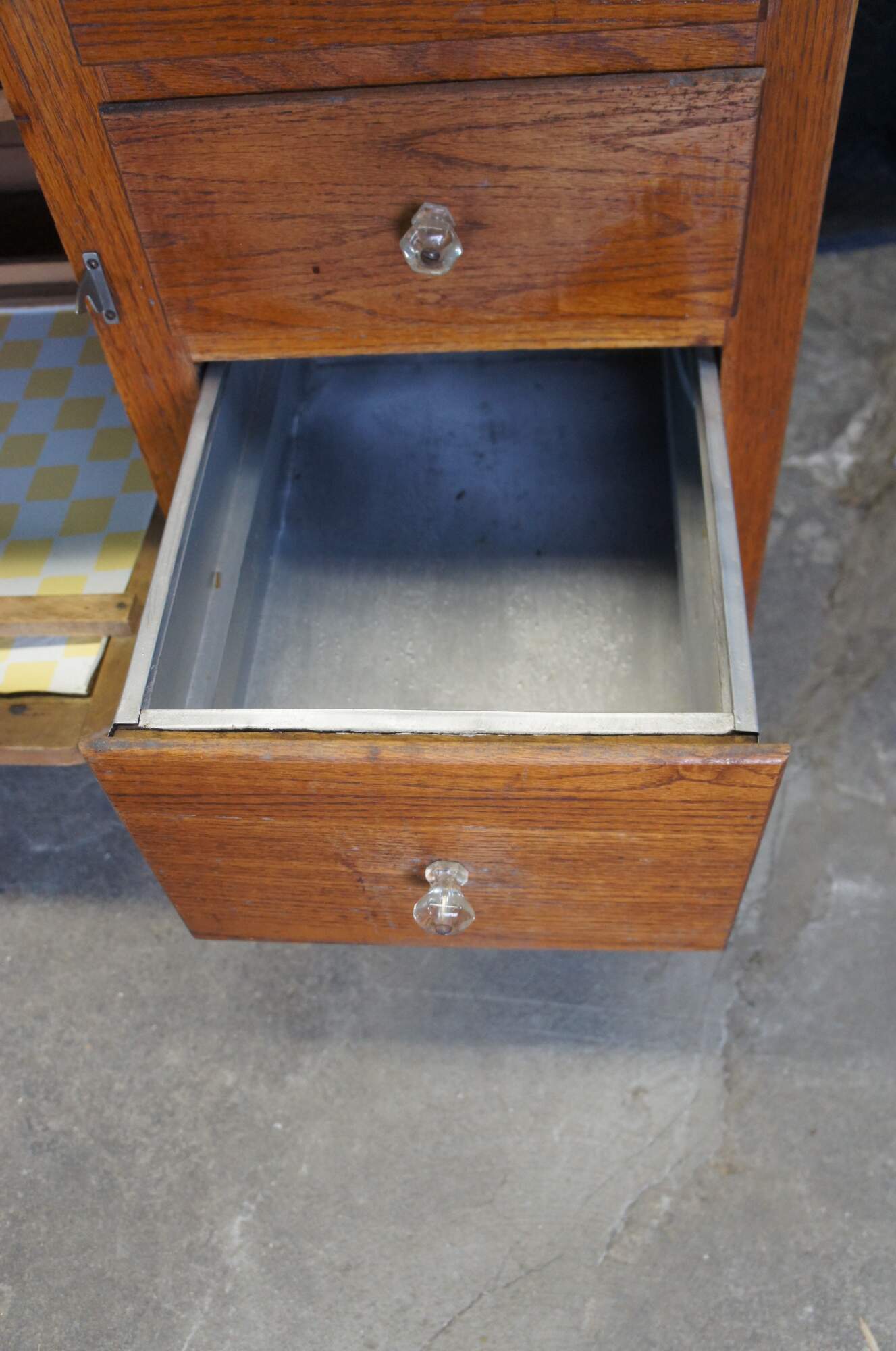 This beautiful example is made out of Amber Oak and has an enameled pullout with tambour door, in addition to multiple drawers, cabinets and pull out storage trays.