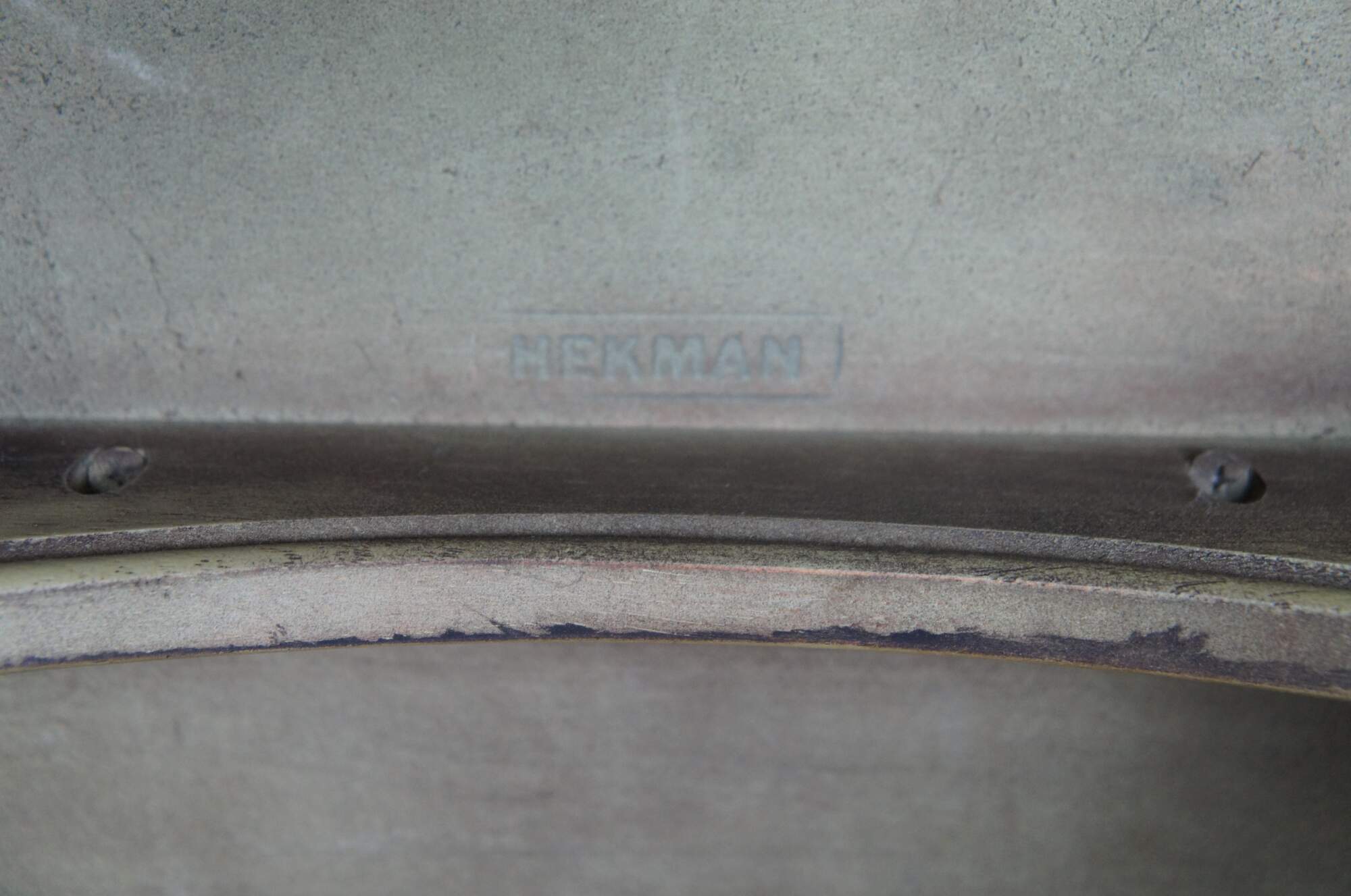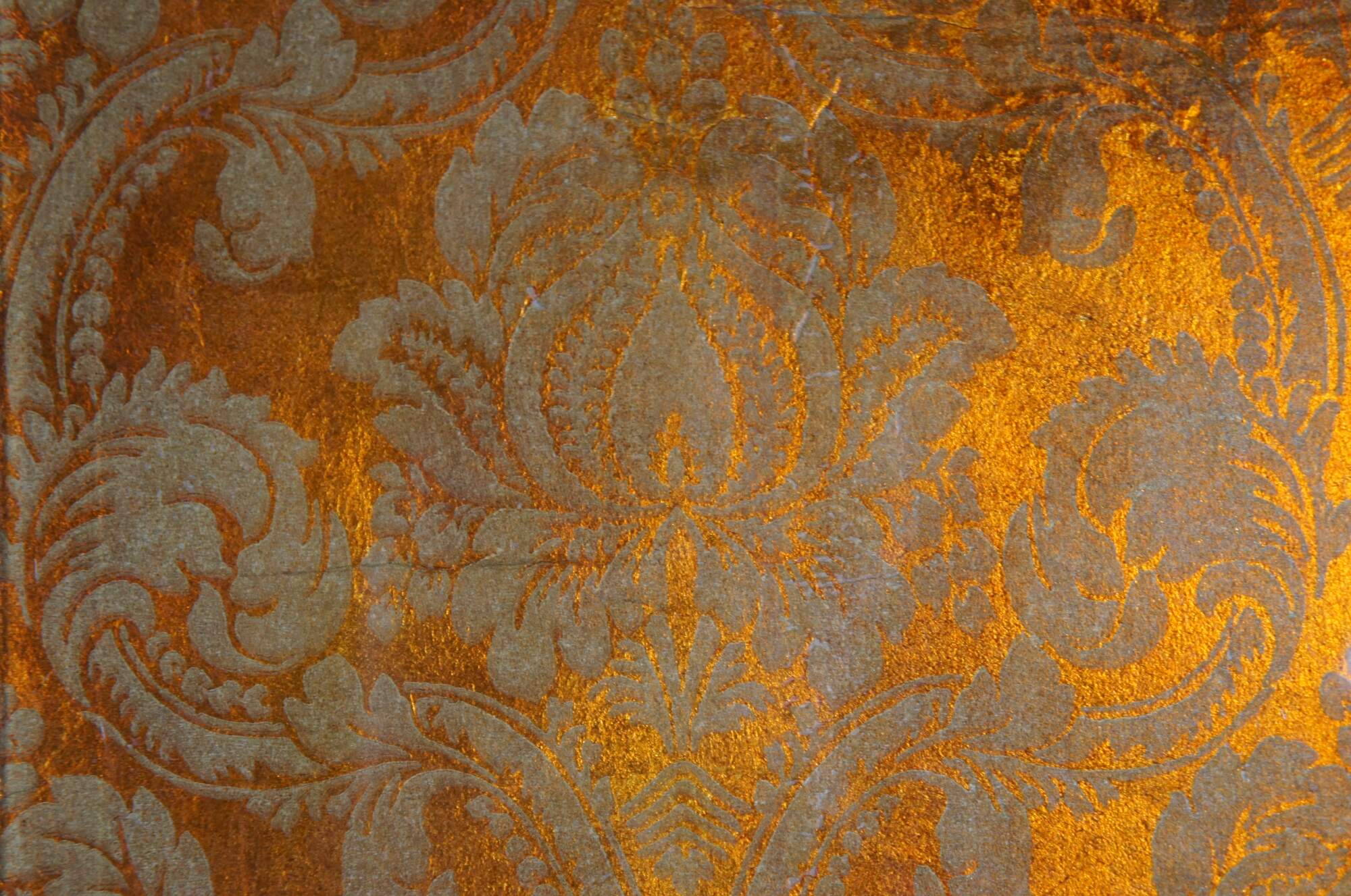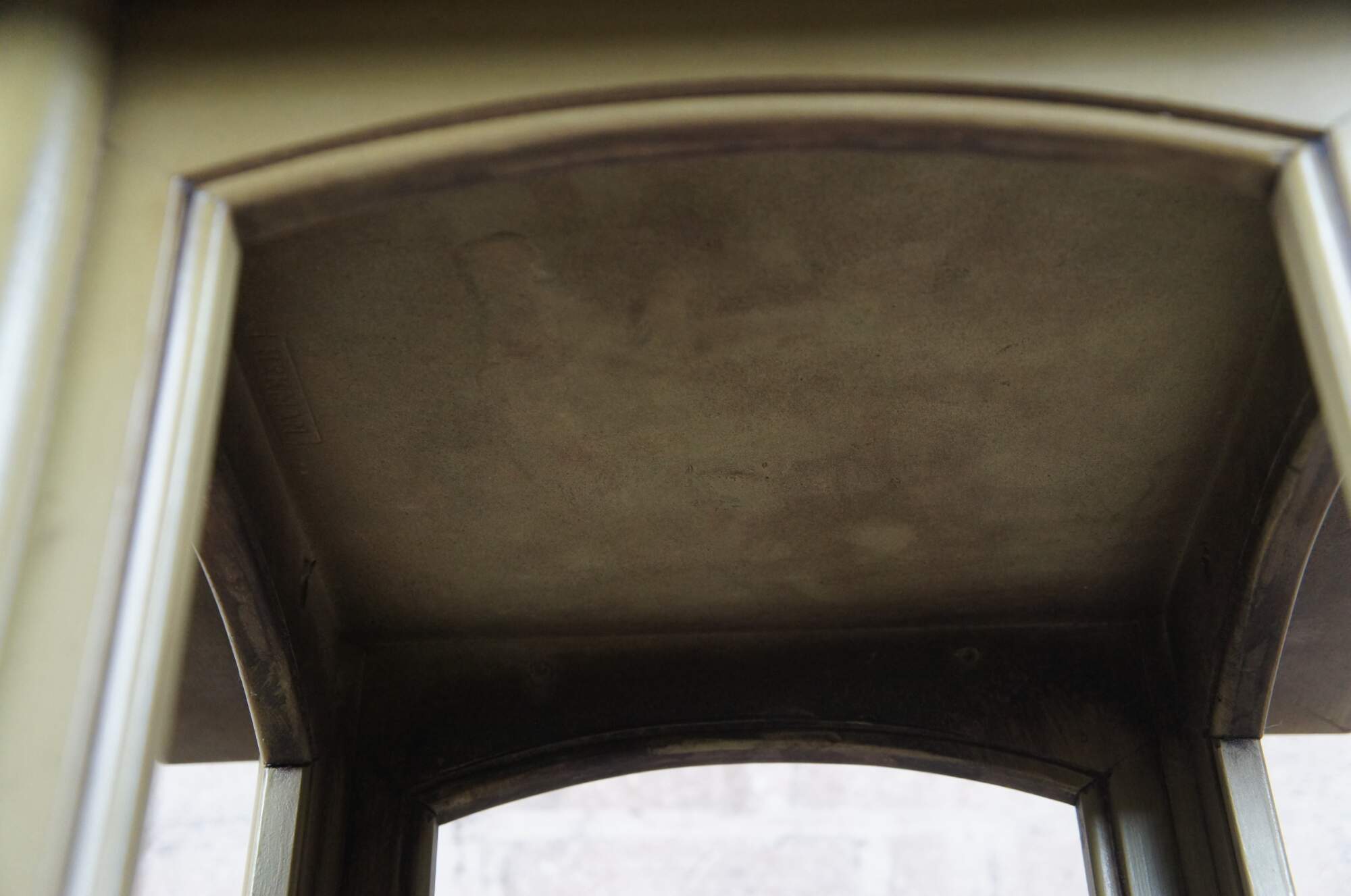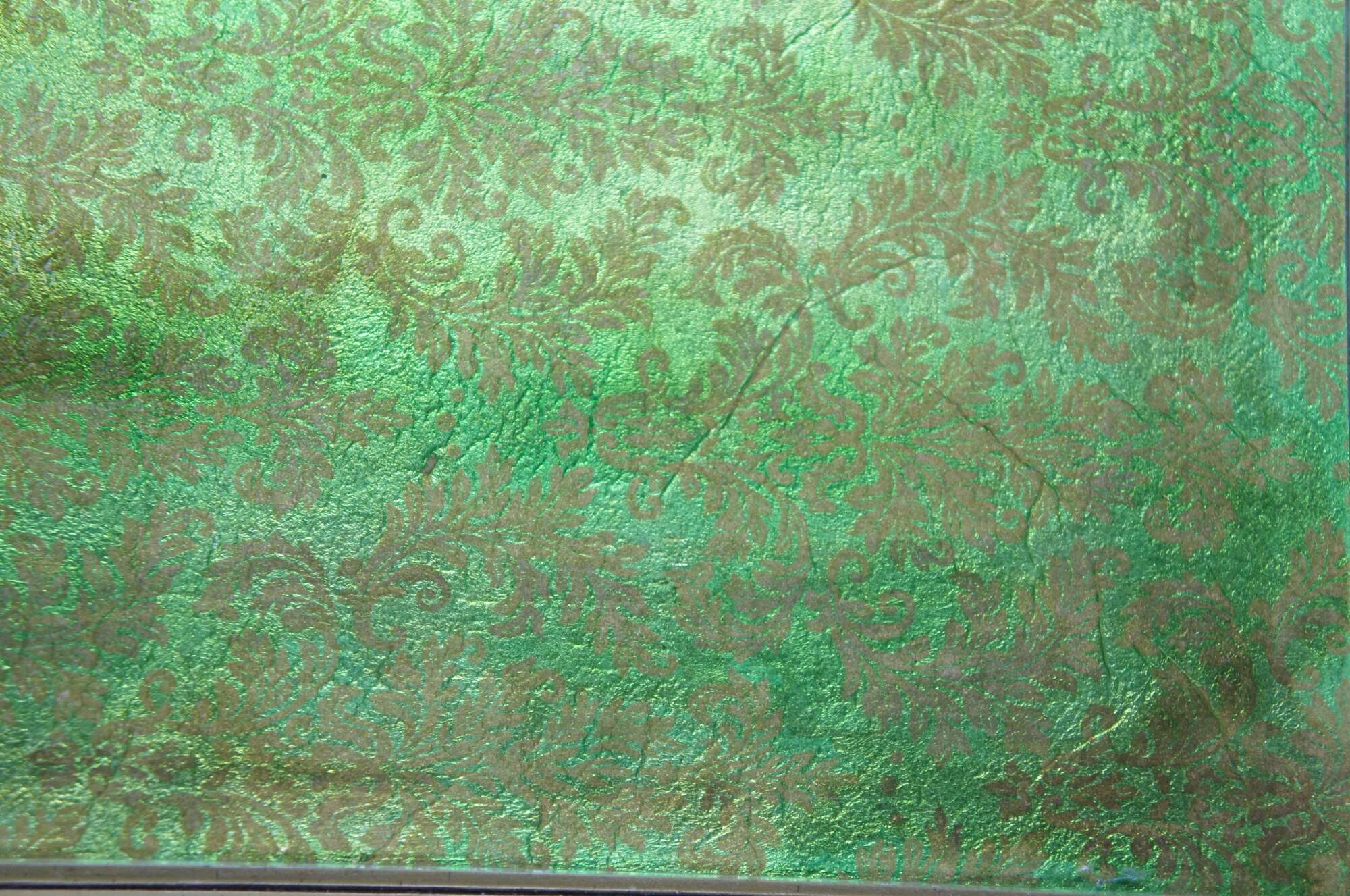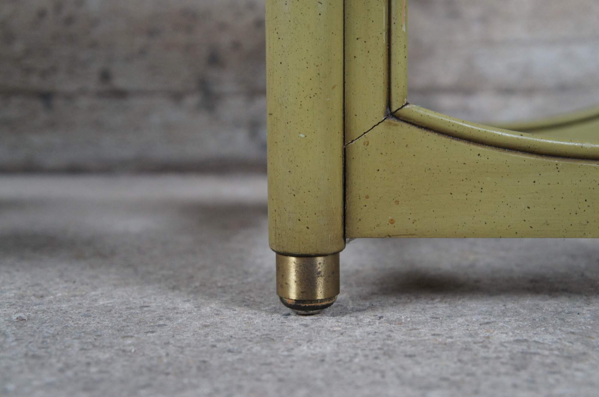 Pair of Hekman square accent tables. Made from wood with a distressed green finish. Features an open frame base with beveled glass tops. Each top is set over a french brocade. One is orange and the other is green. The glass is removeable and has the same green finish on the top.