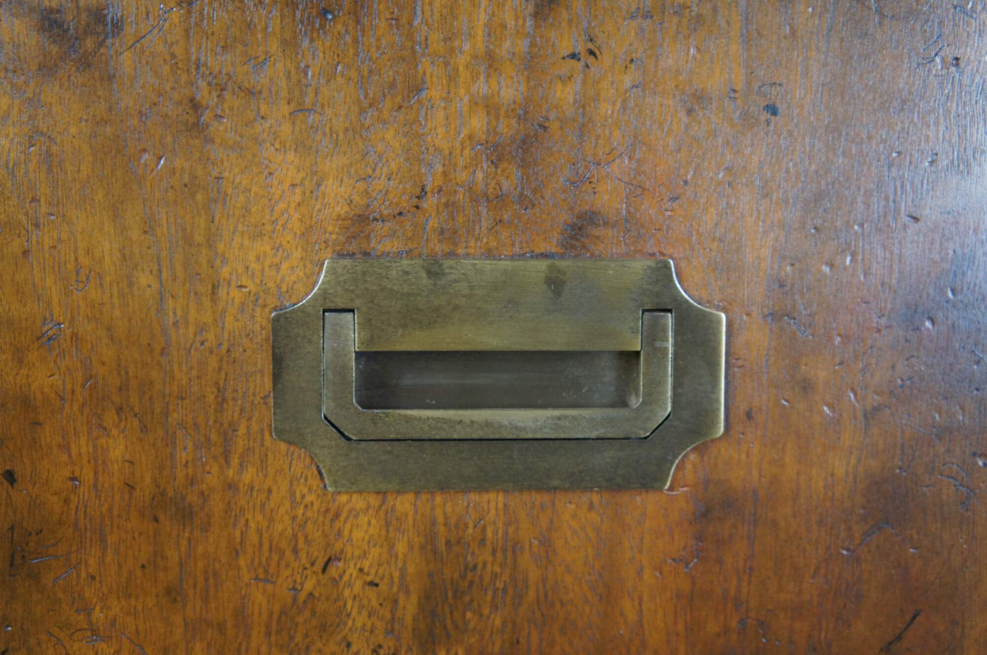 A stunning Anglo Indian style Campaign Dresser or Chest of Drawers by Baker Furniture, circa 1960s. Part of the Far East Collection. Made from European Walnut with a naturally distressed two over two drawer form. The dresser is accented by brass hardware with hinging drawer pulls and brass side plates. Drawers are constructed from solid oak. The case is supported by block feet. Silver baker tag is mounted along the inside of an upper drawer. Marked along underside 2800.
