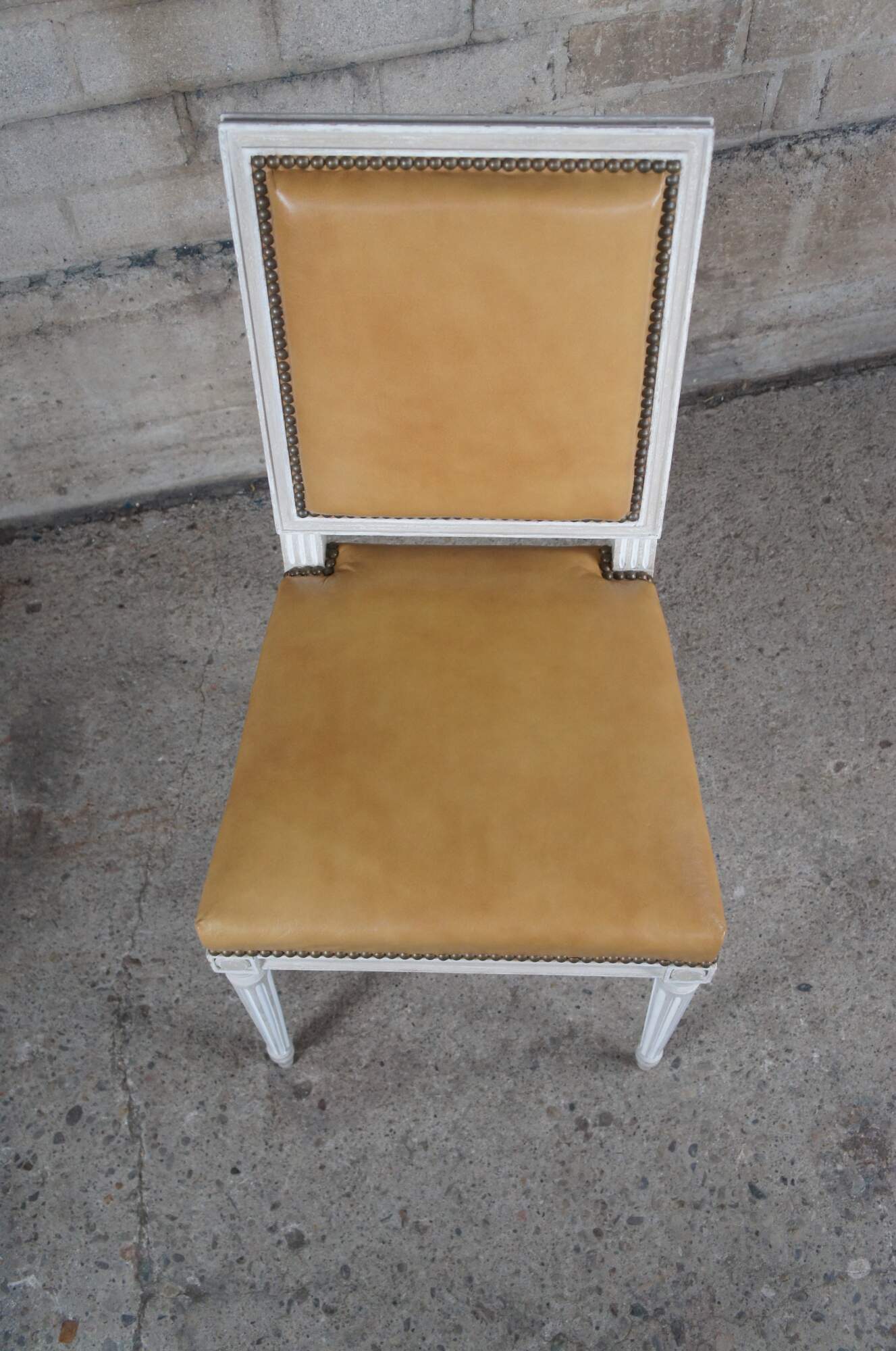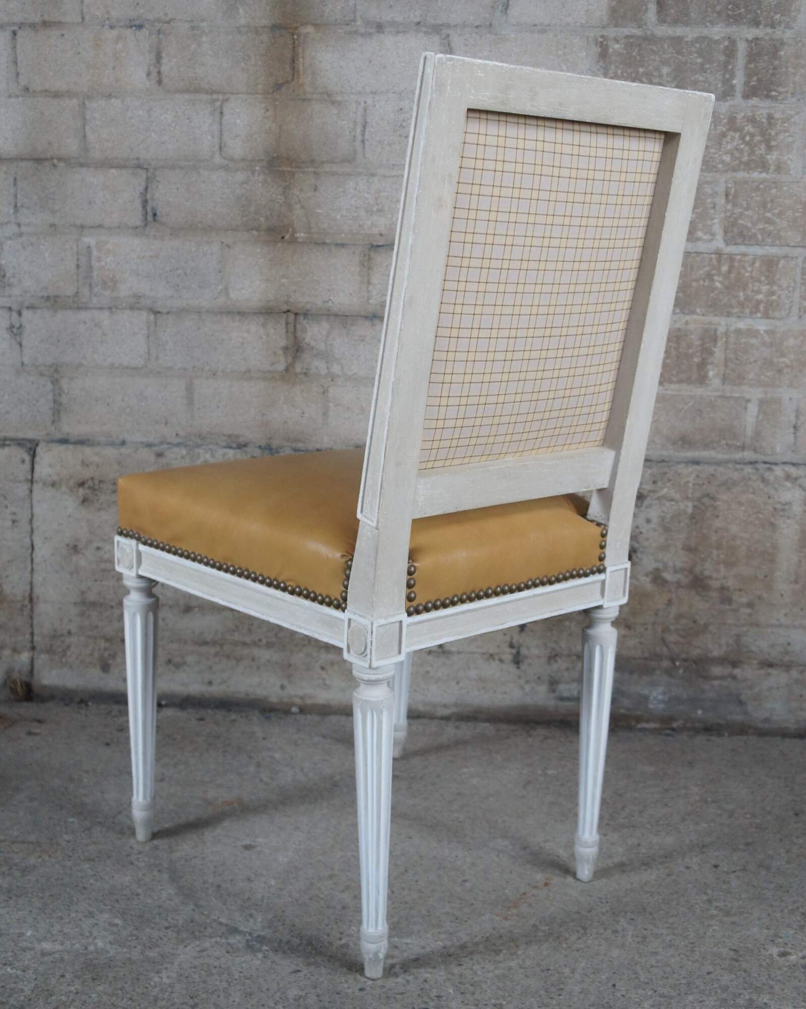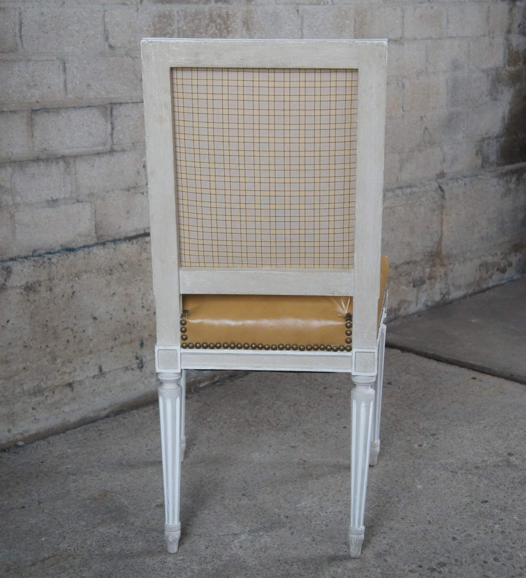 Baker Furniture French Louis XVI style Dining Side Chairs, circa 1960s. Features a square frame over turned and fluted legs leading to arrow feet. The chairs are upholstered in leather with nail head trim with a plaid backing. Provincial finish in gray and white
