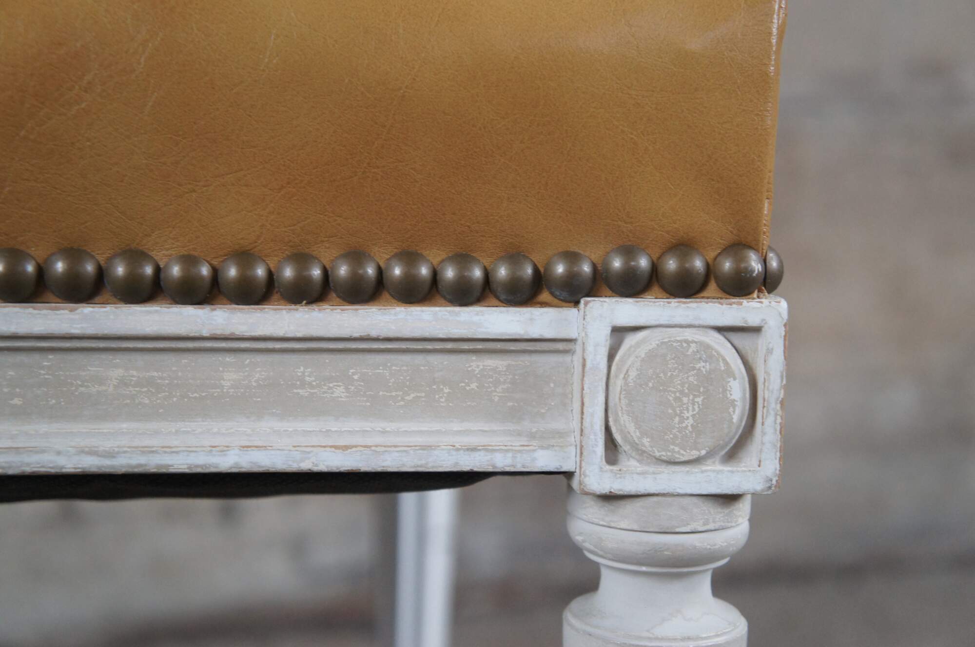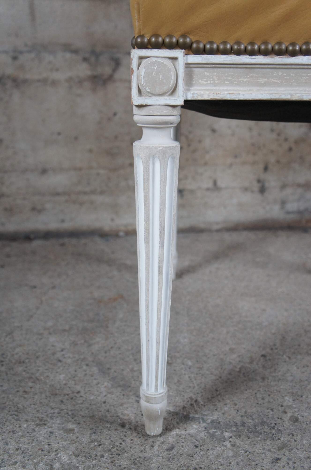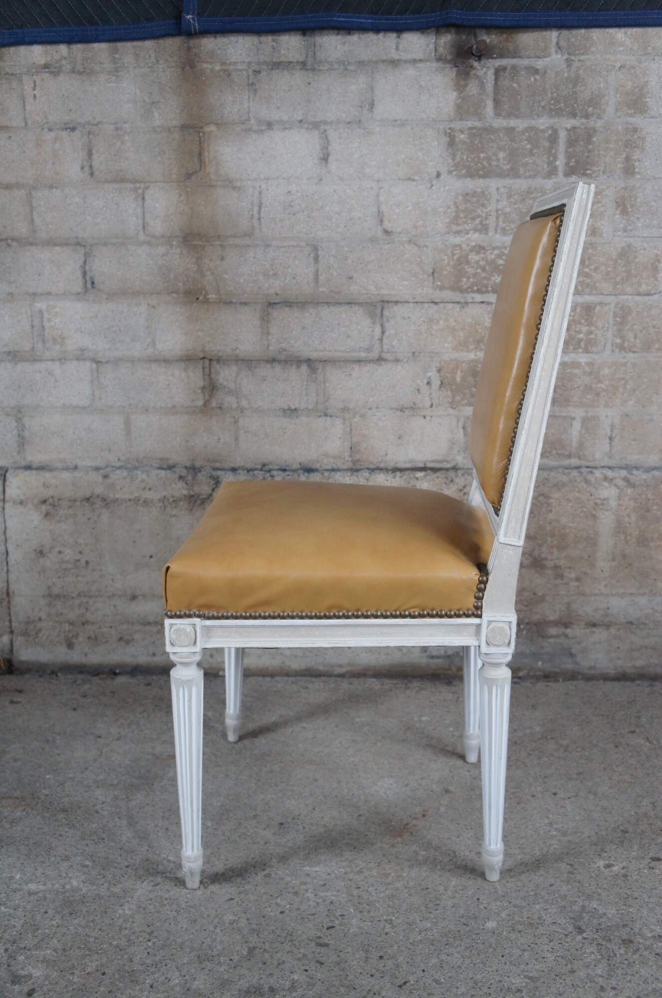 Baker Furniture French Louis XVI style Dining Side Chairs, circa 1960s. Features a square frame over turned and fluted legs leading to arrow feet. The chairs are upholstered in leather with nail head trim with a plaid backing. Provincial finish in gray and white