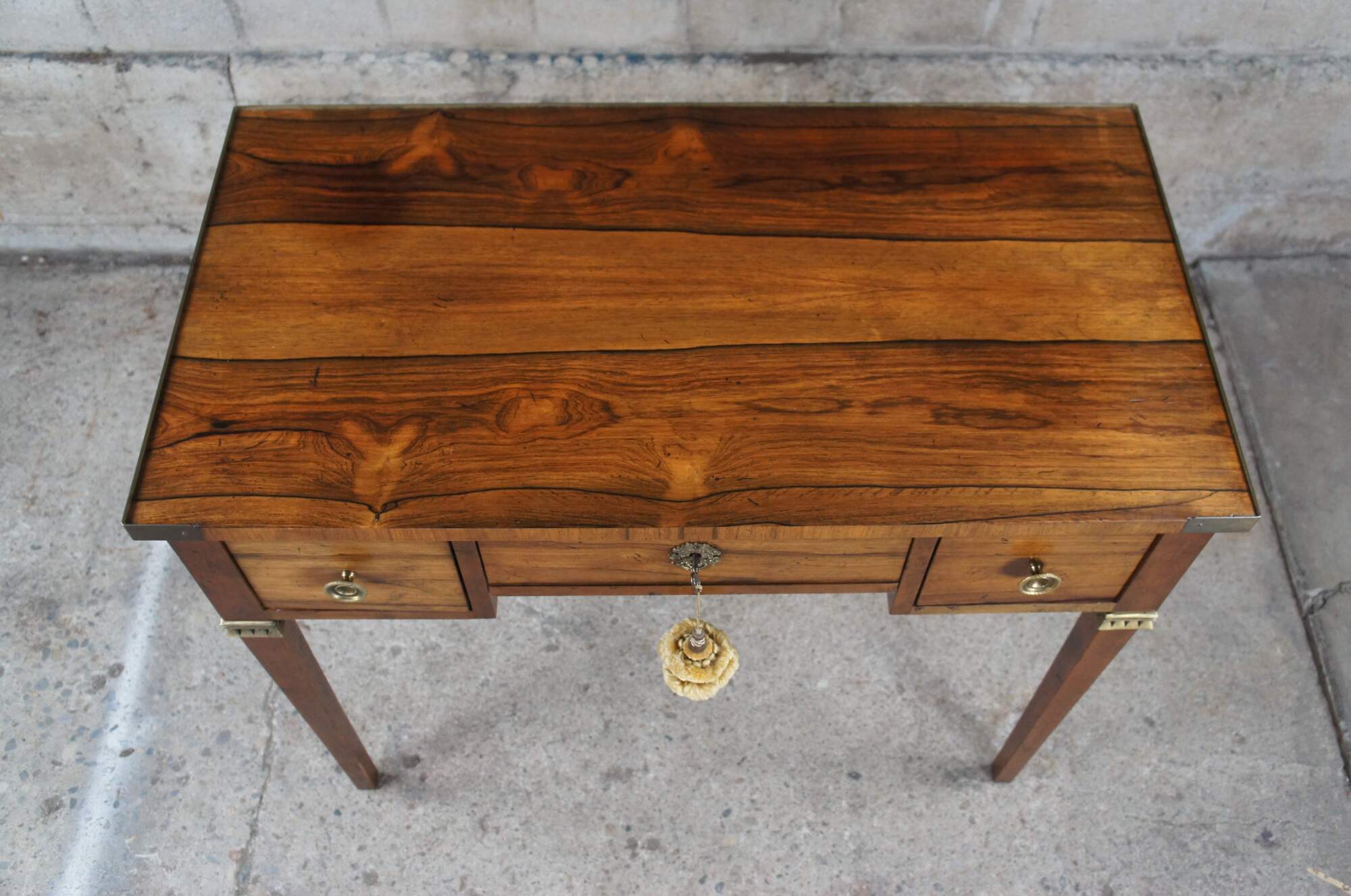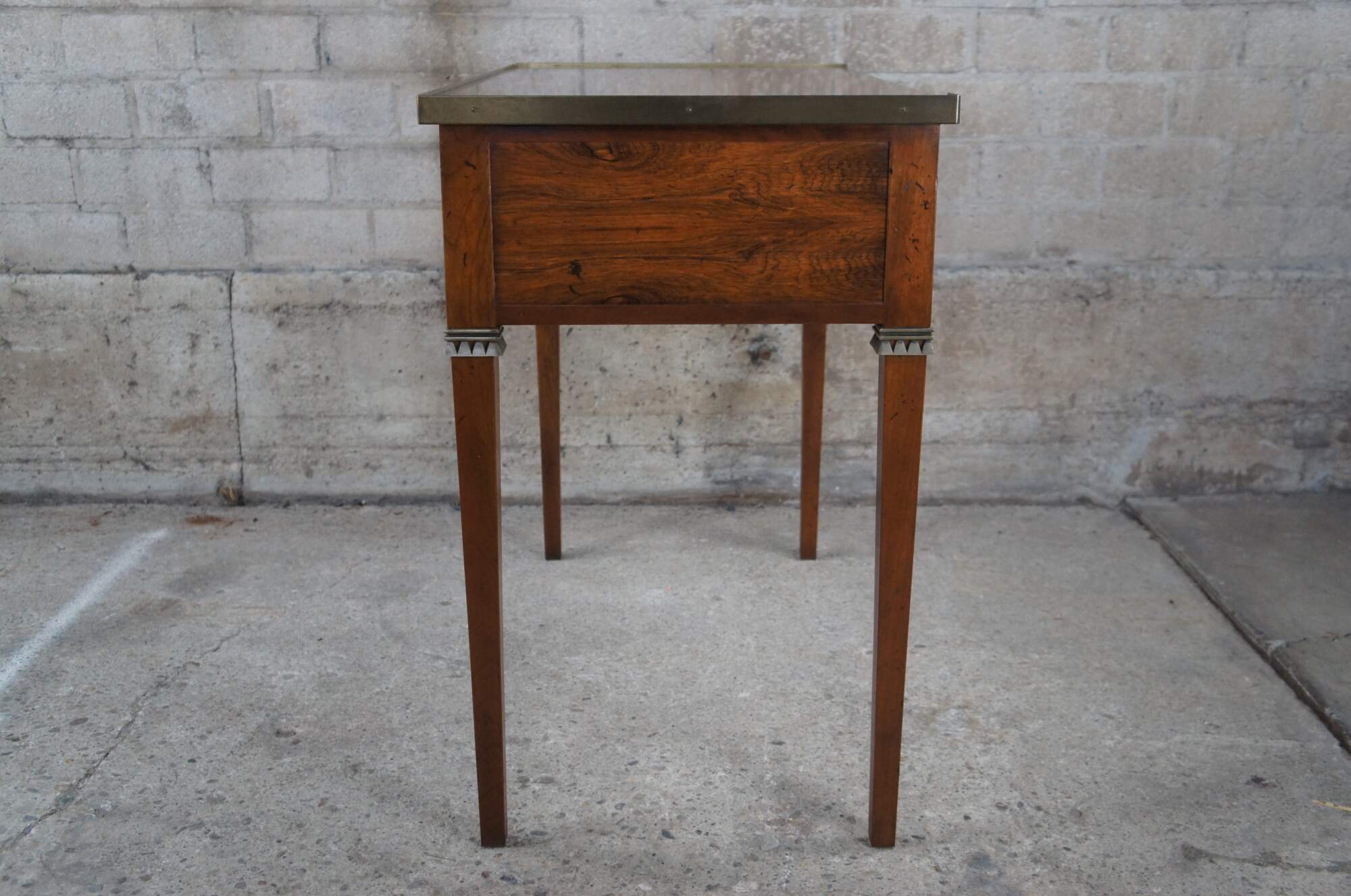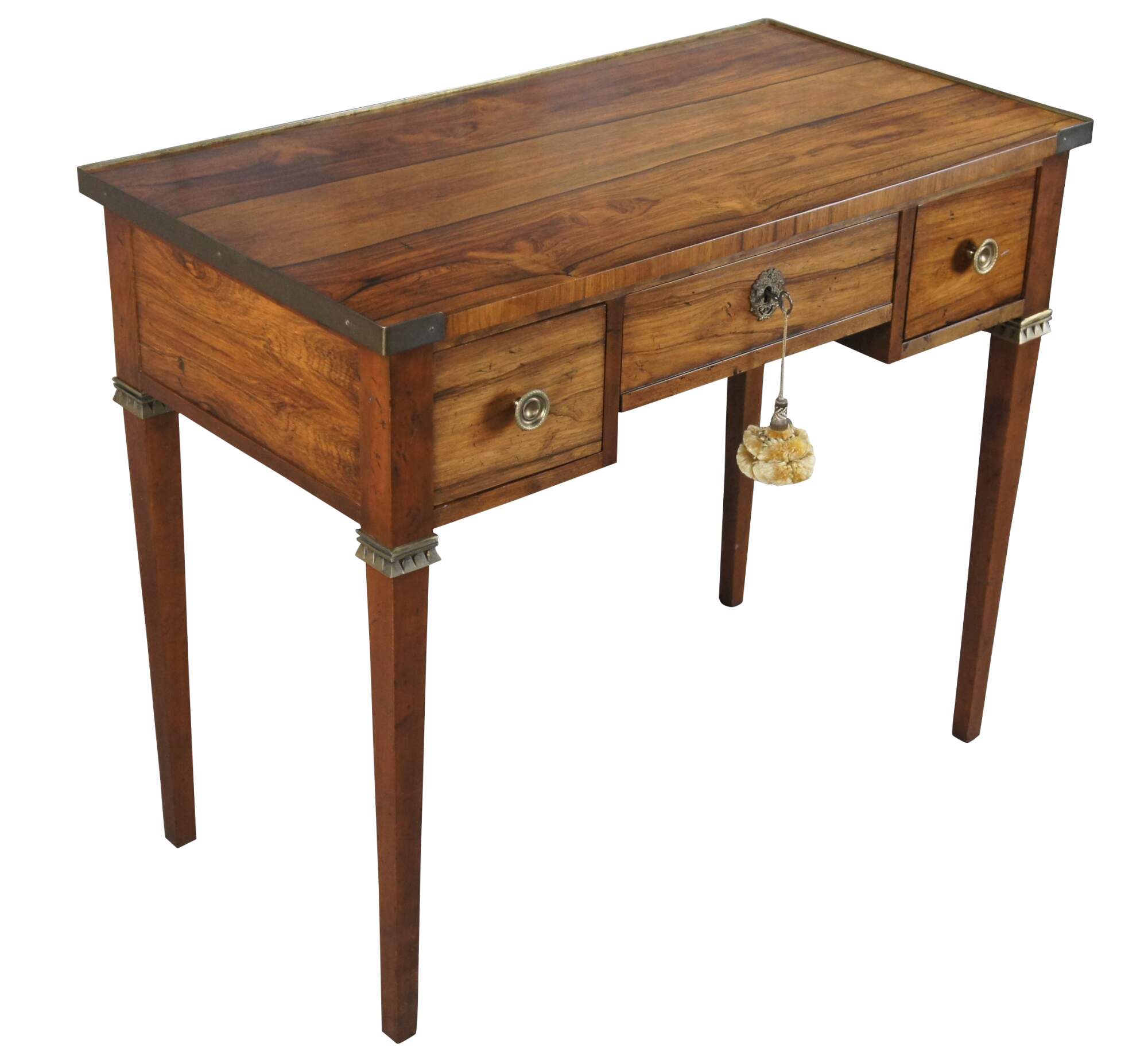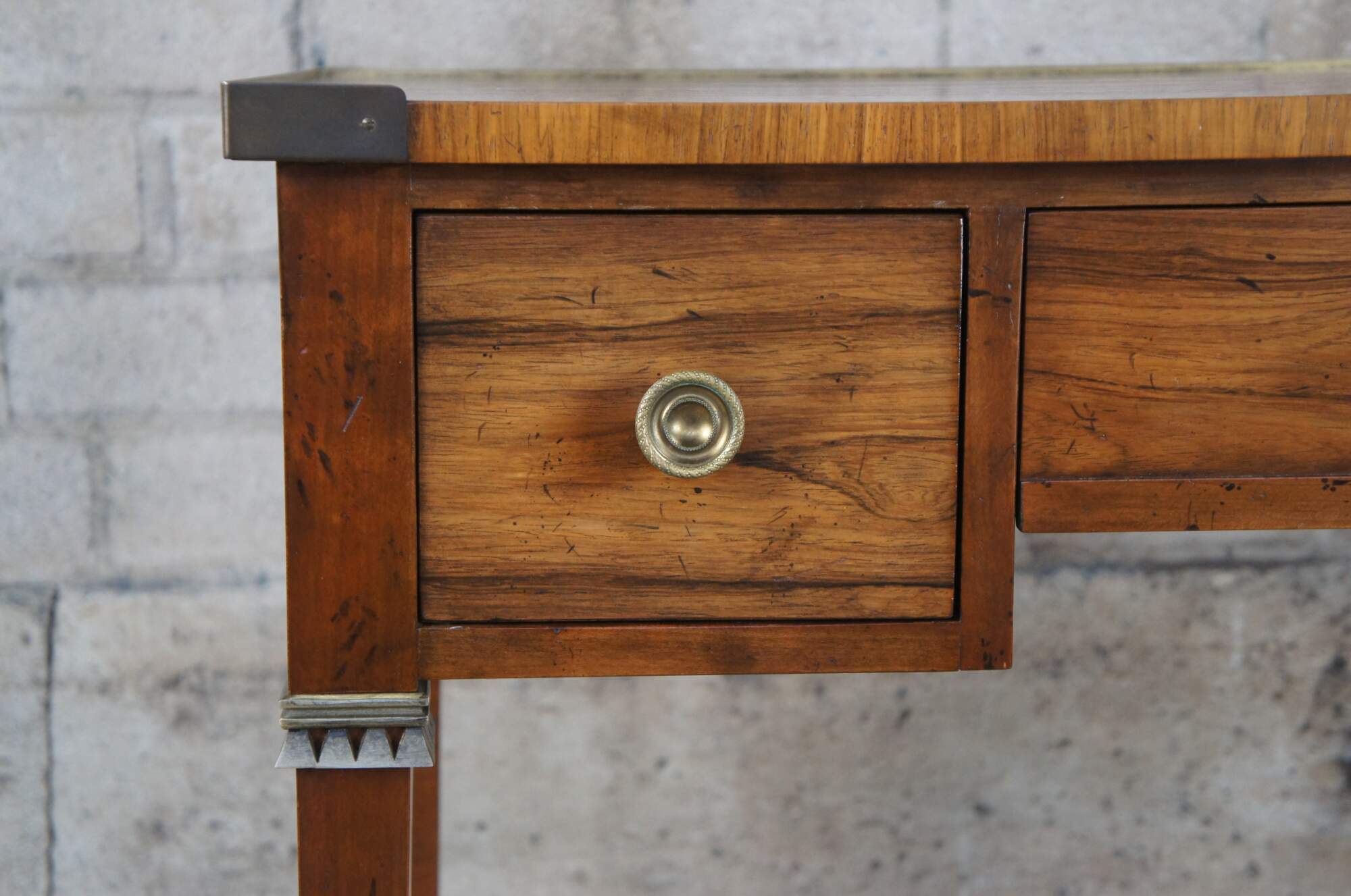 A stunning 1960s French Louis XVI or Neoclassical style ladies desk / receiving table by Michael Taylor for Baker Furniture Inc. Features a rectangular top with brass banding over a frieze fitted with three dovetailed drawers, decorated with ornate brass pulls and escutcheons. The case is raised over square tapered legs.