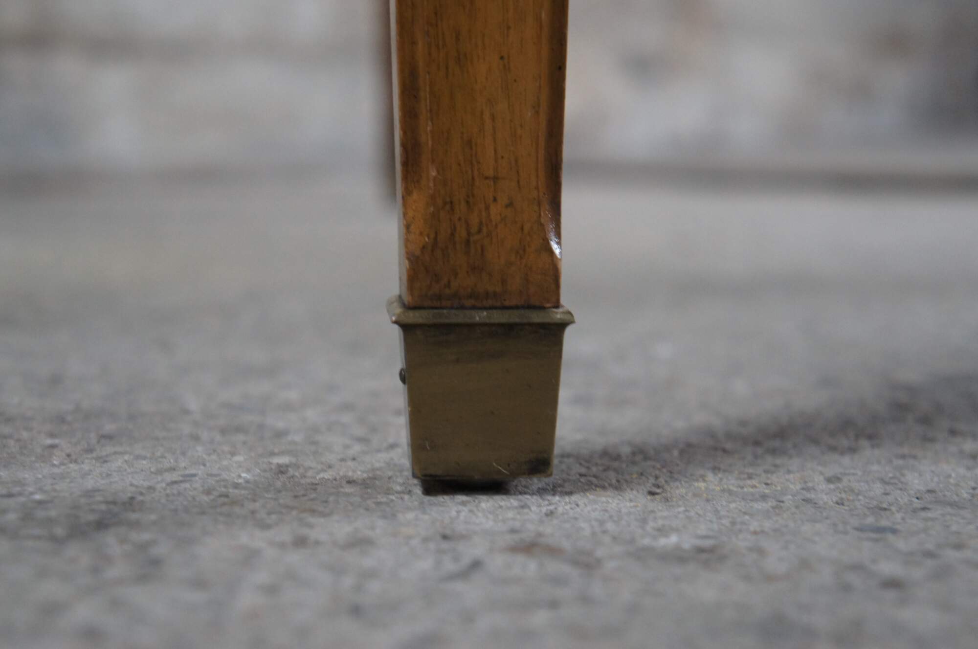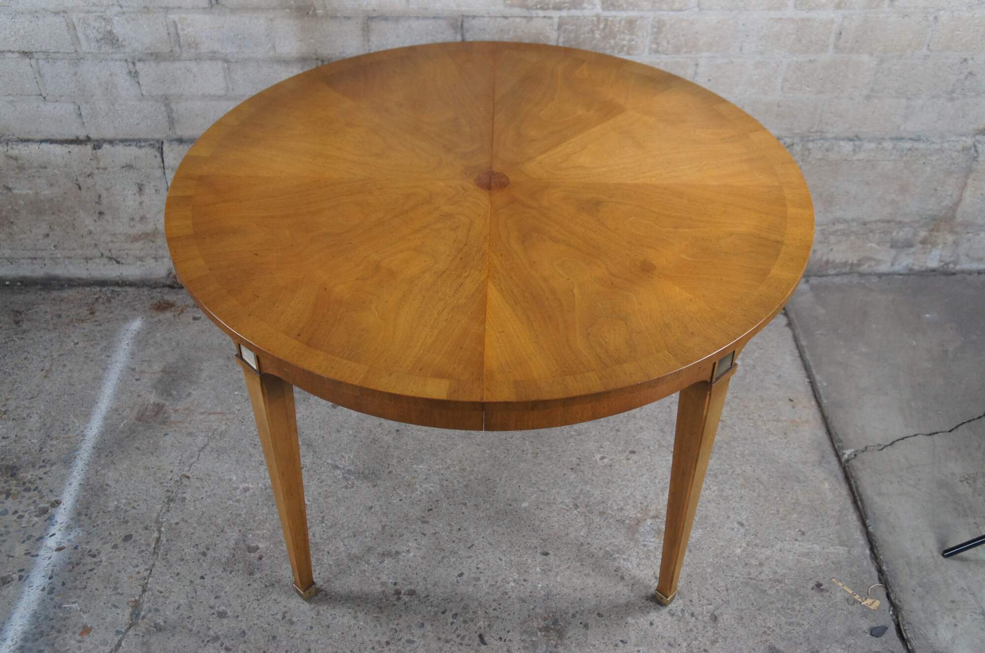 A lovely dining or breakfast table by Baker Furniture, circa 1960s. Made from European walnut with a burled center. Features a beautiful matchbook veneered top with a banded edge. Apron has brass inserts above each leg. The long legs square legs are chamfered and tapered to brass capped feet.