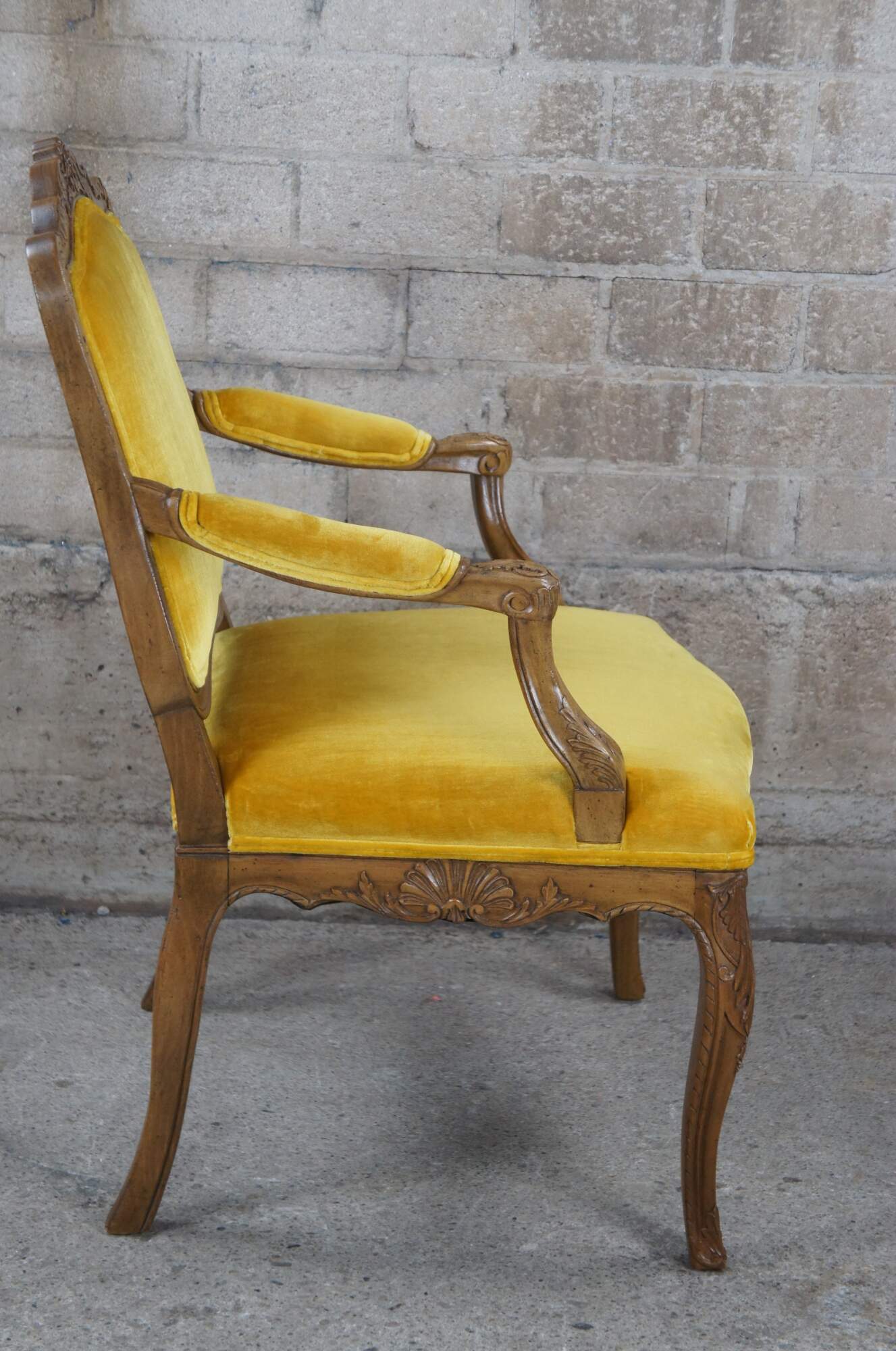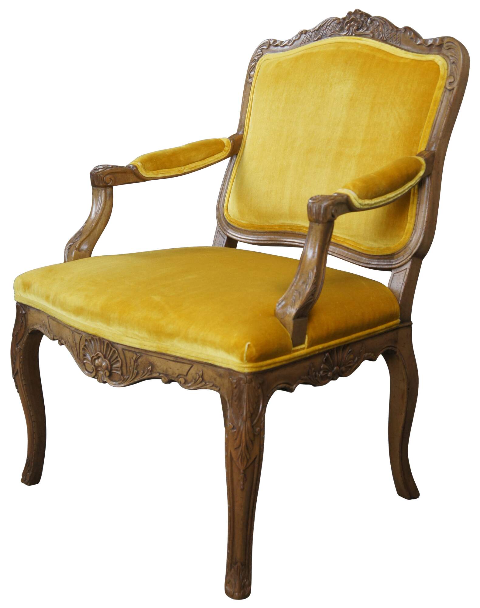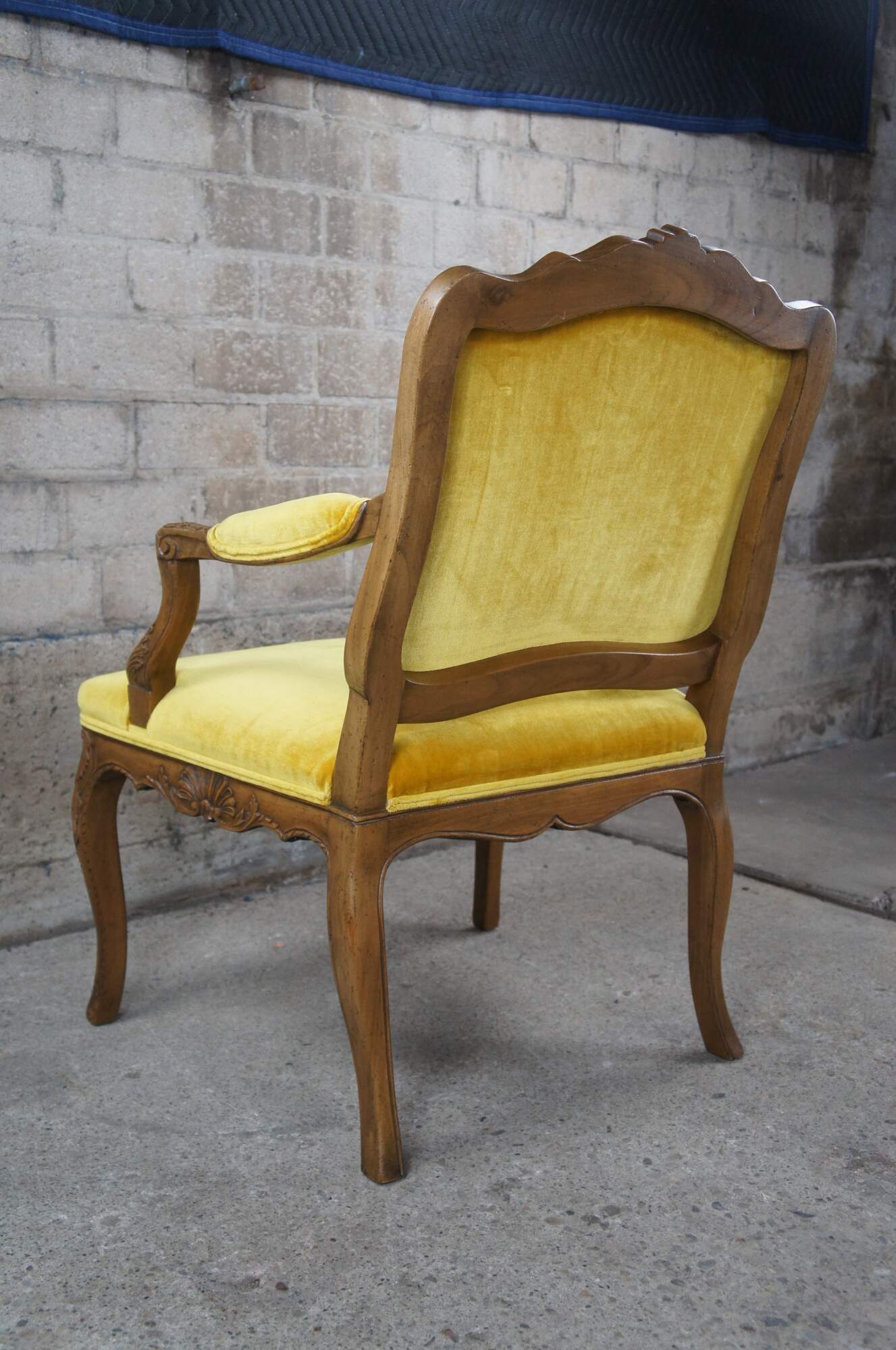 A stunning Arm Chair by Baker Furniture, circa 1960s. Made from naturally distressed European walnut. The frame is beautifully carved with acanthus and scalloped detail. Upholstered in yellow velvet with padded arms and cabriole feet.