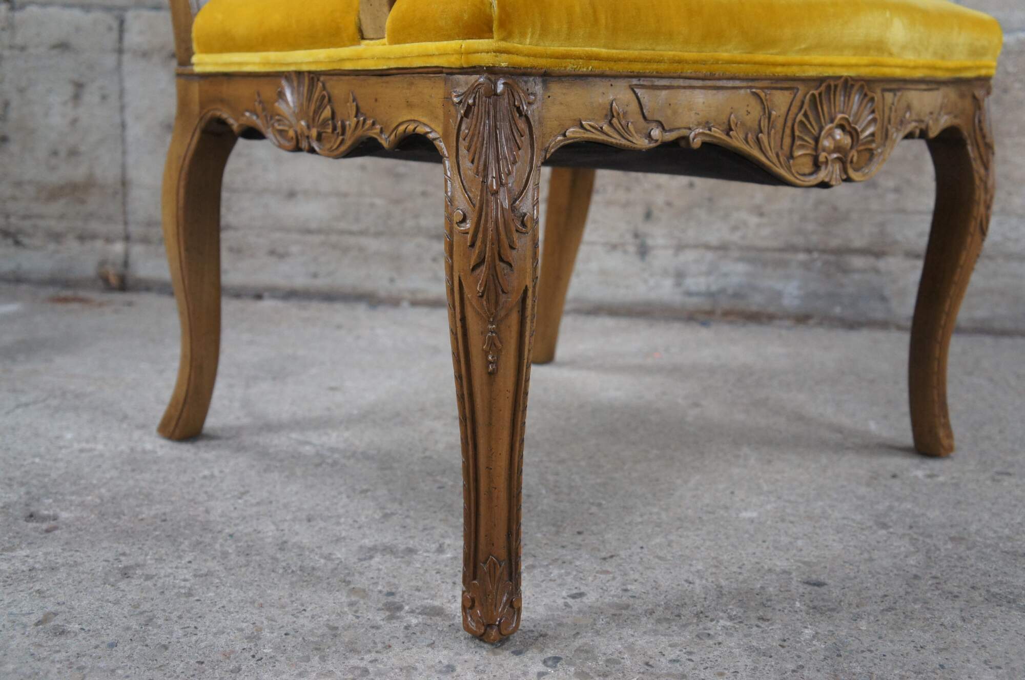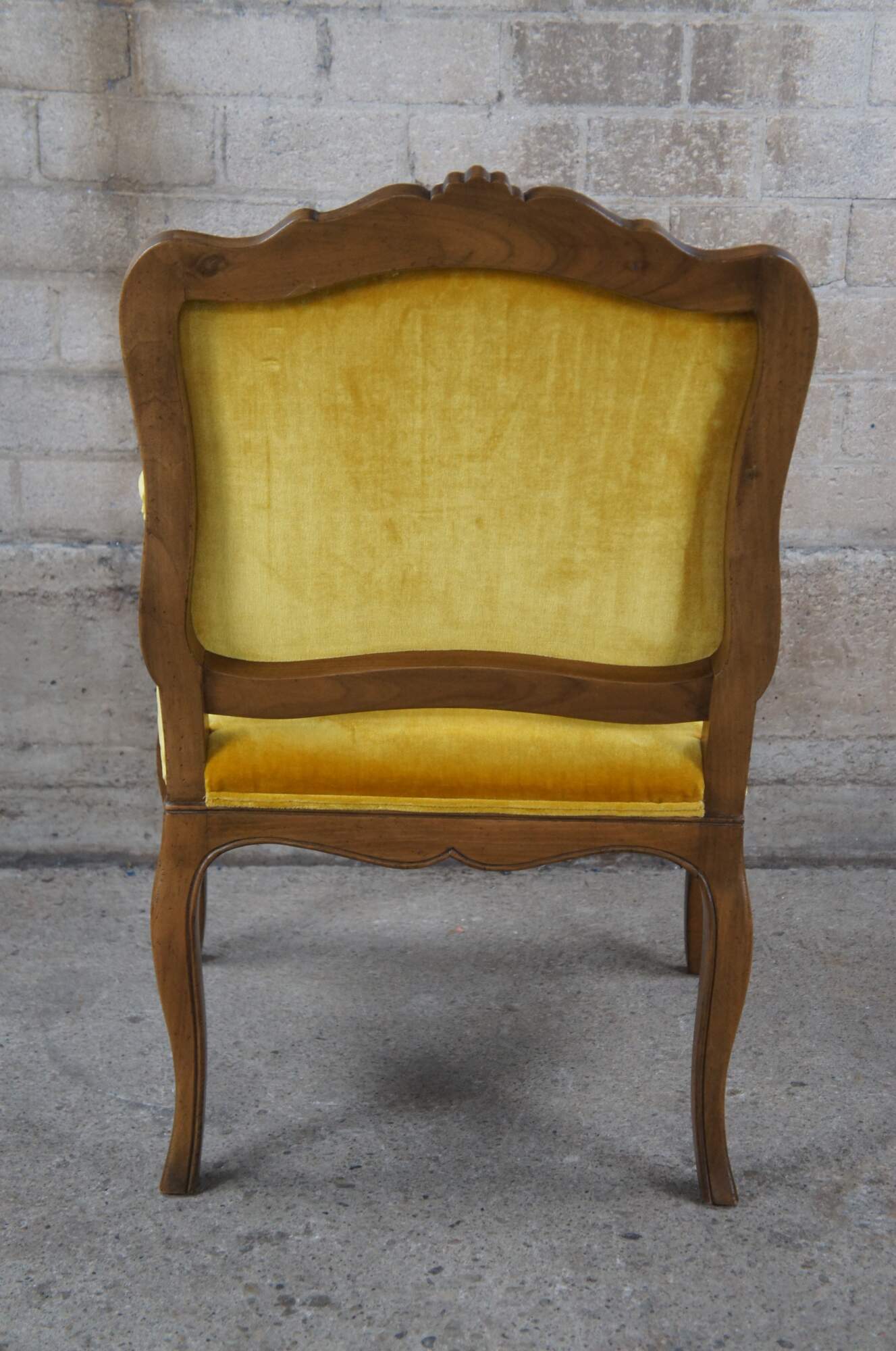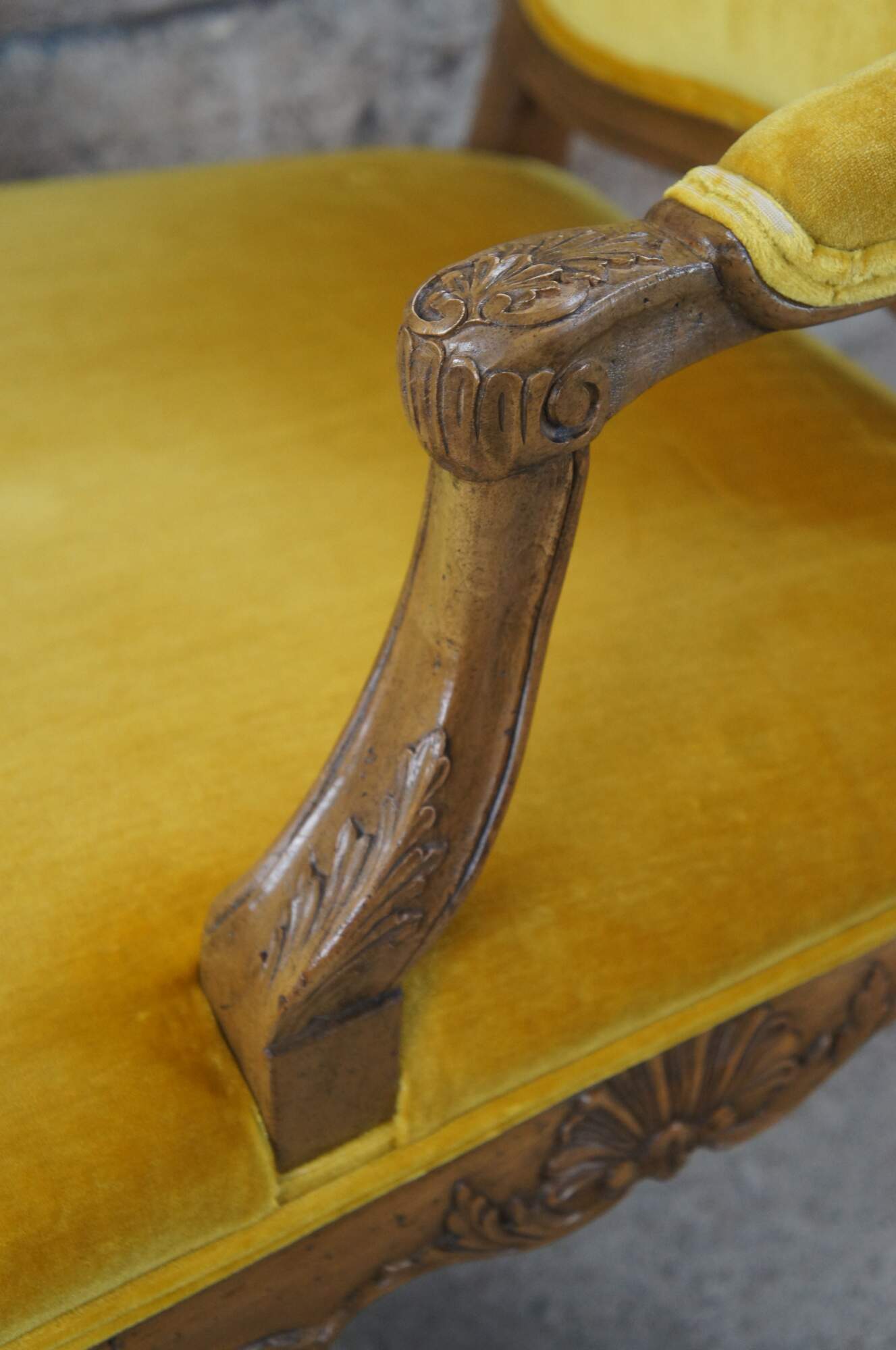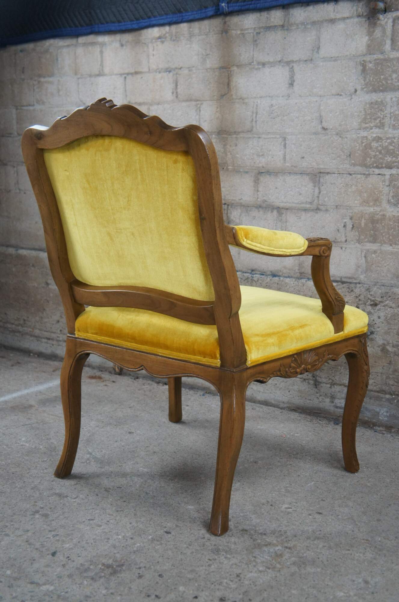 A stunning Arm Chair by Baker Furniture, circa 1960s. Made from naturally distressed European walnut. The frame is beautifully carved with acanthus and scalloped detail. Upholstered in yellow velvet with padded arms and cabriole feet.