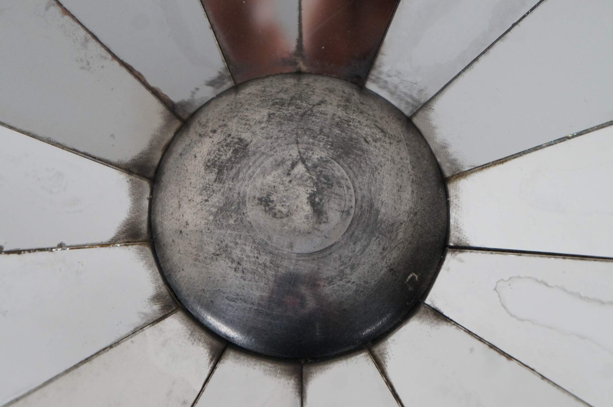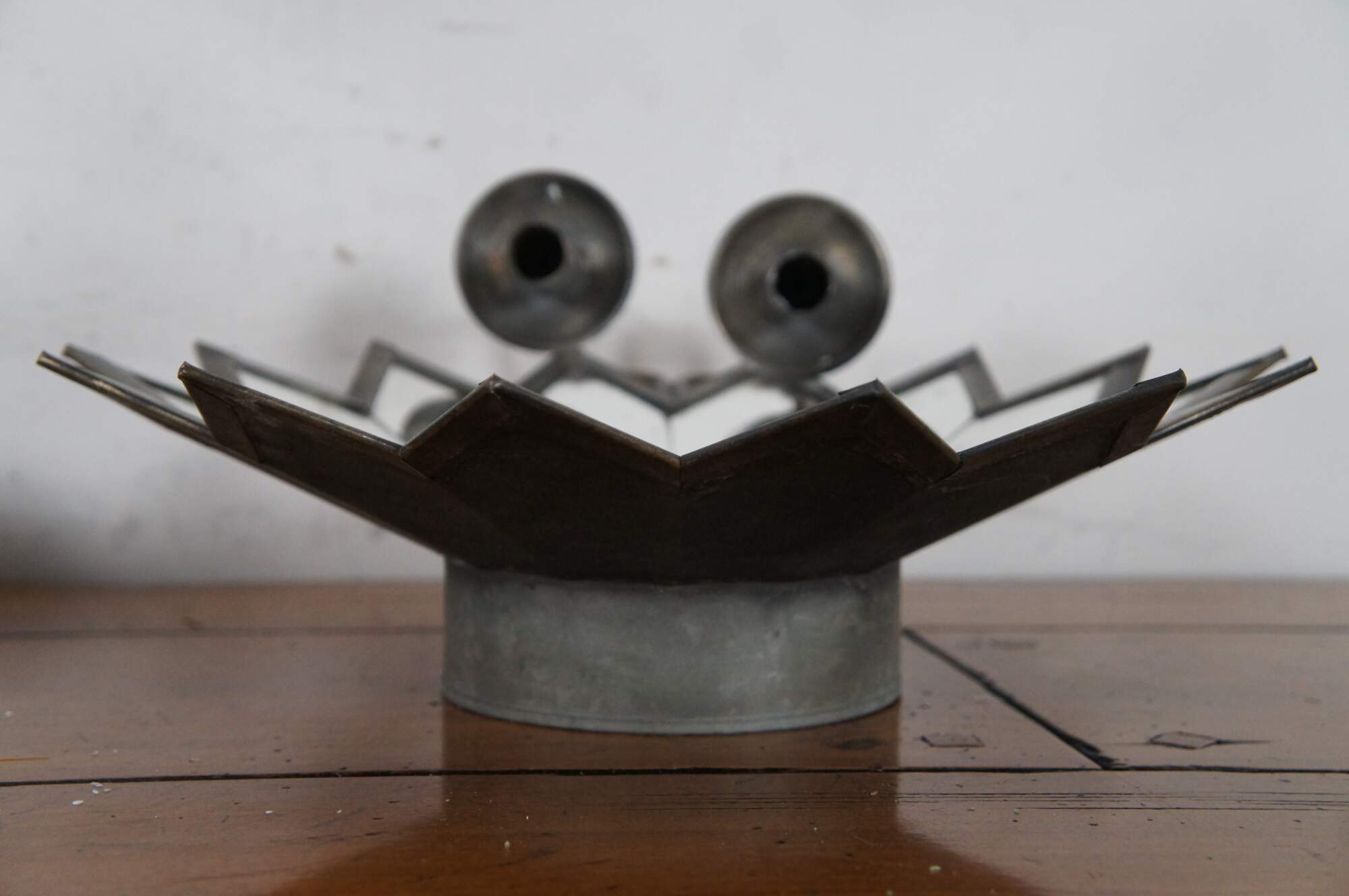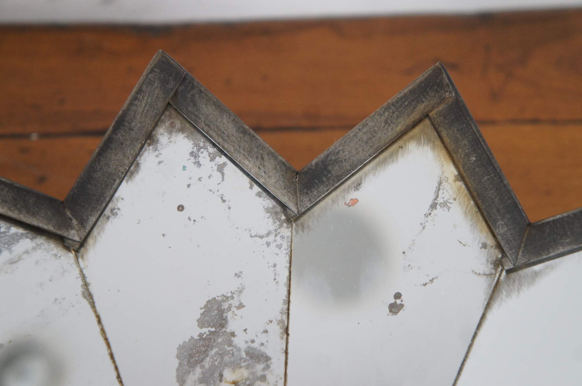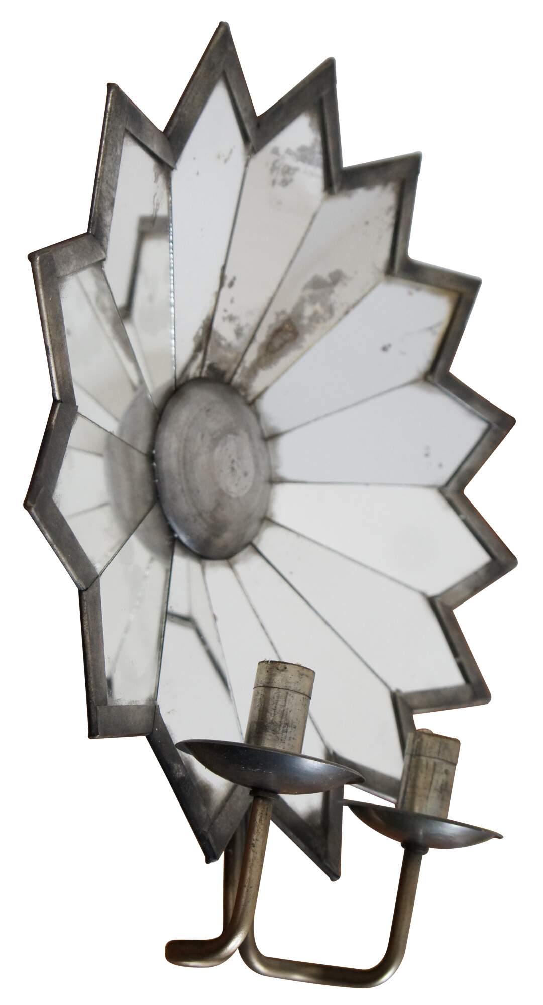 Pair of vintage two light candle wall sconces made of tin with sunburst mirror flower / daisy shaped reflectors. Made in Japan. Mirrors are antiqued giving added character.