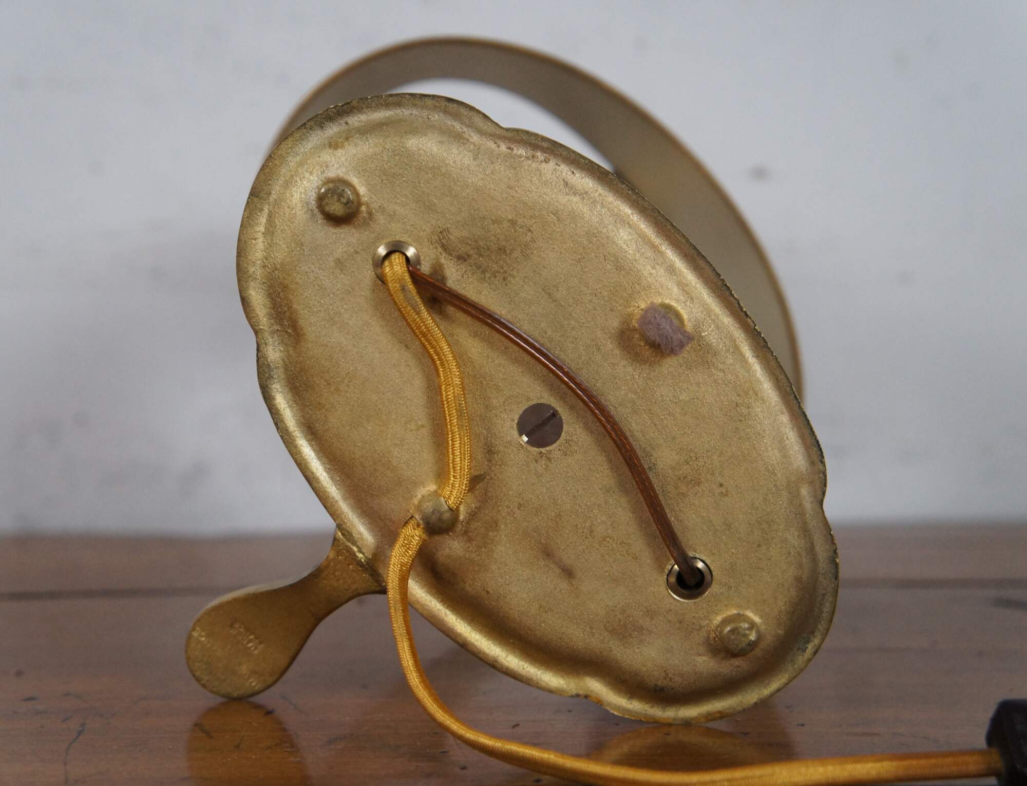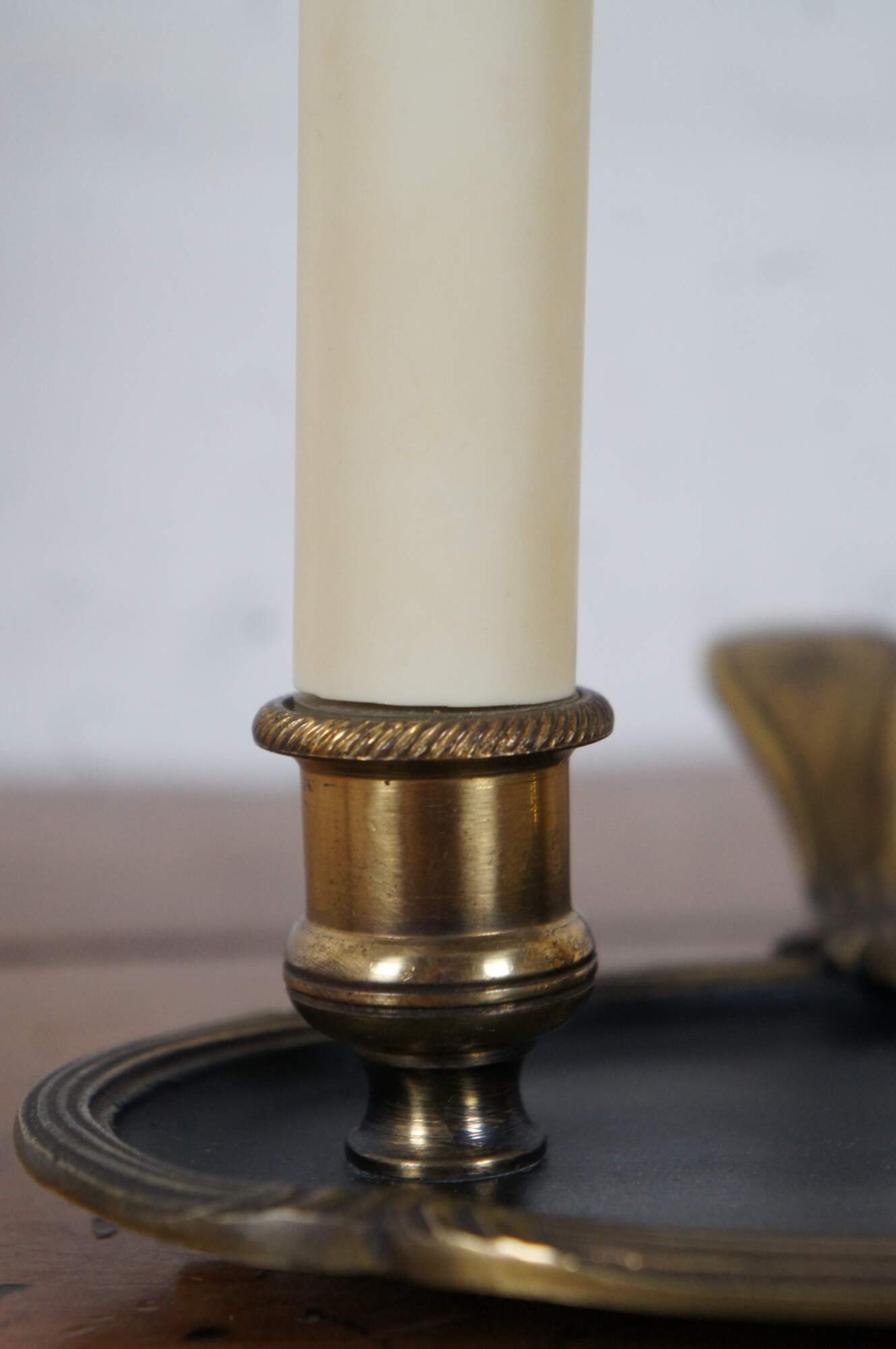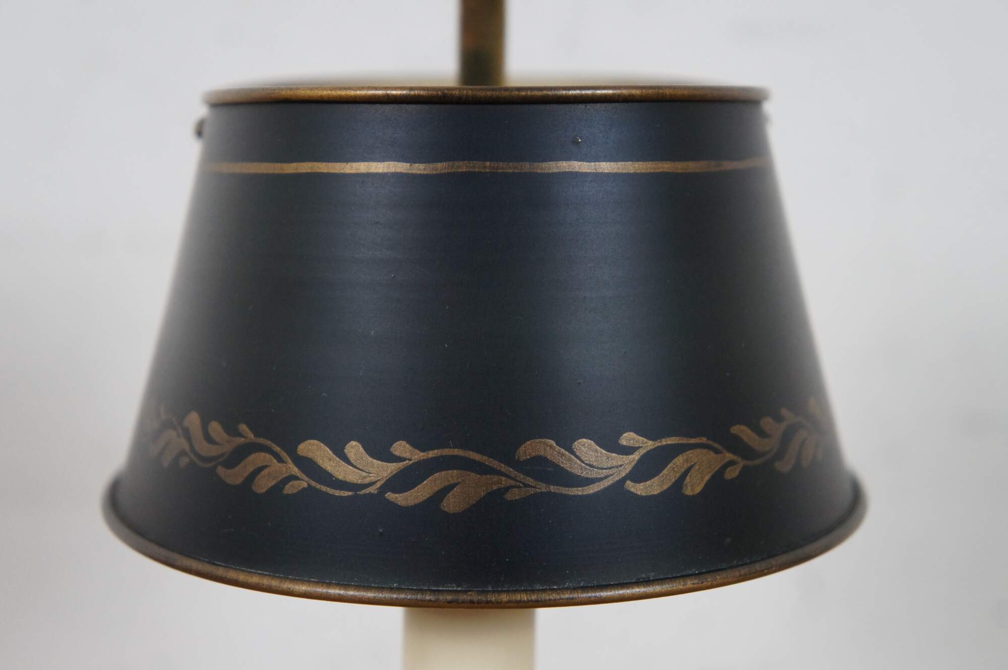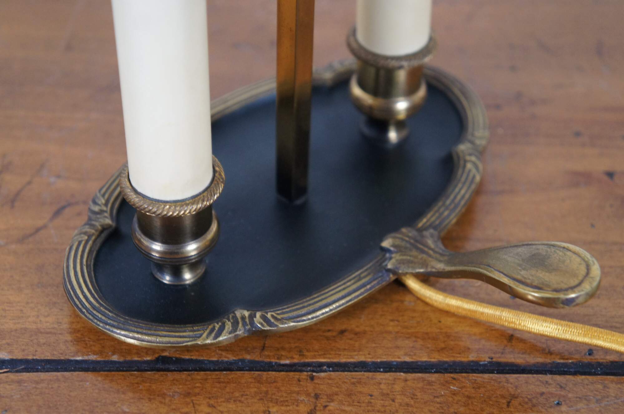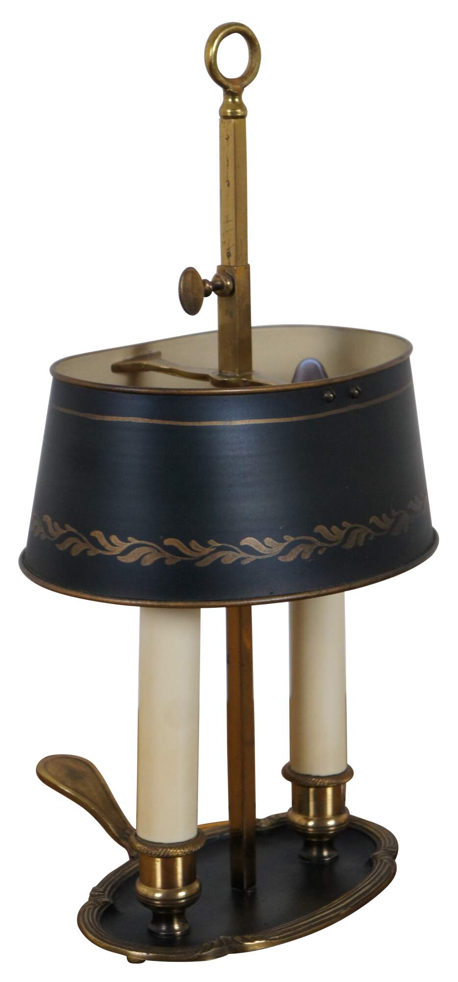 Vintage mid 20th century French bouillotte style budoir / table lamp featuring two candlestick shaped lights on a bronze edged tray with a handle, shaded with a black and gold tole shade. Made in France.