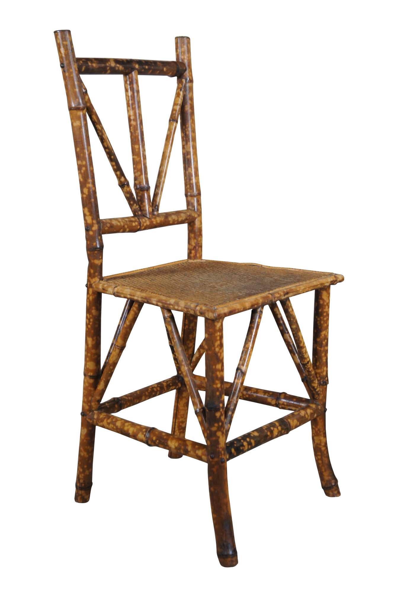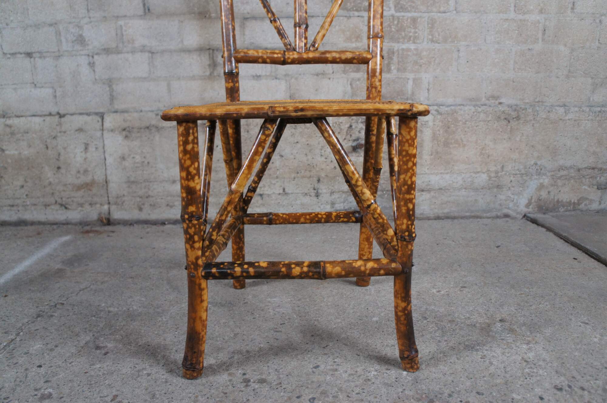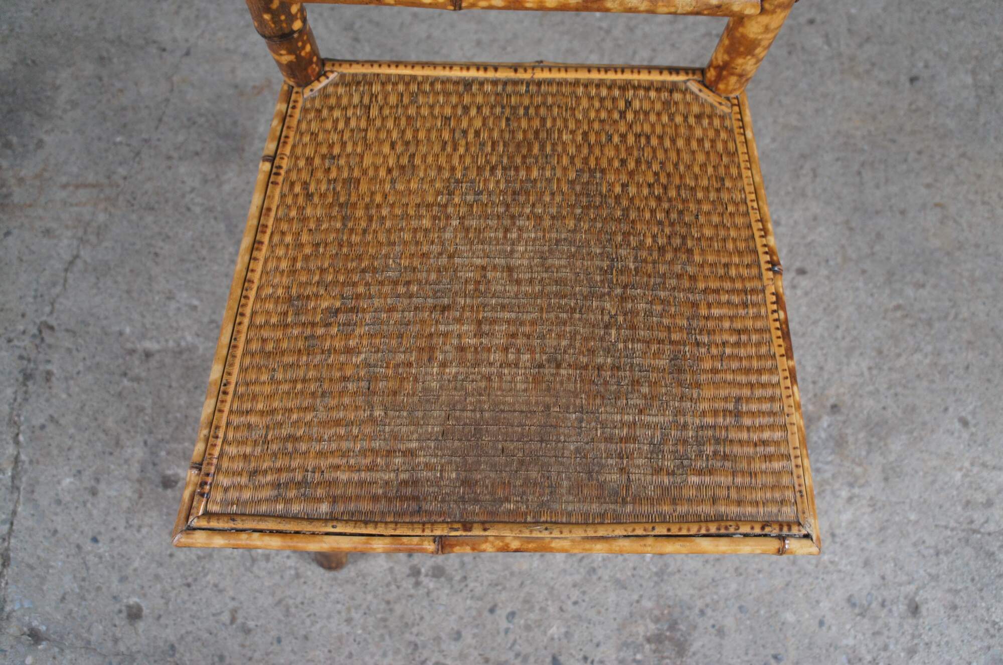 A lovely pair of petite scorched bamboo accent chairs. Great for use with a vanity or as an occasional seat.