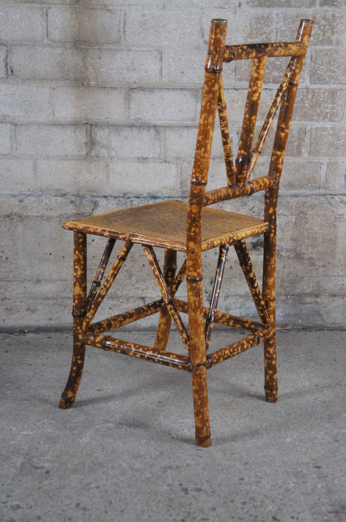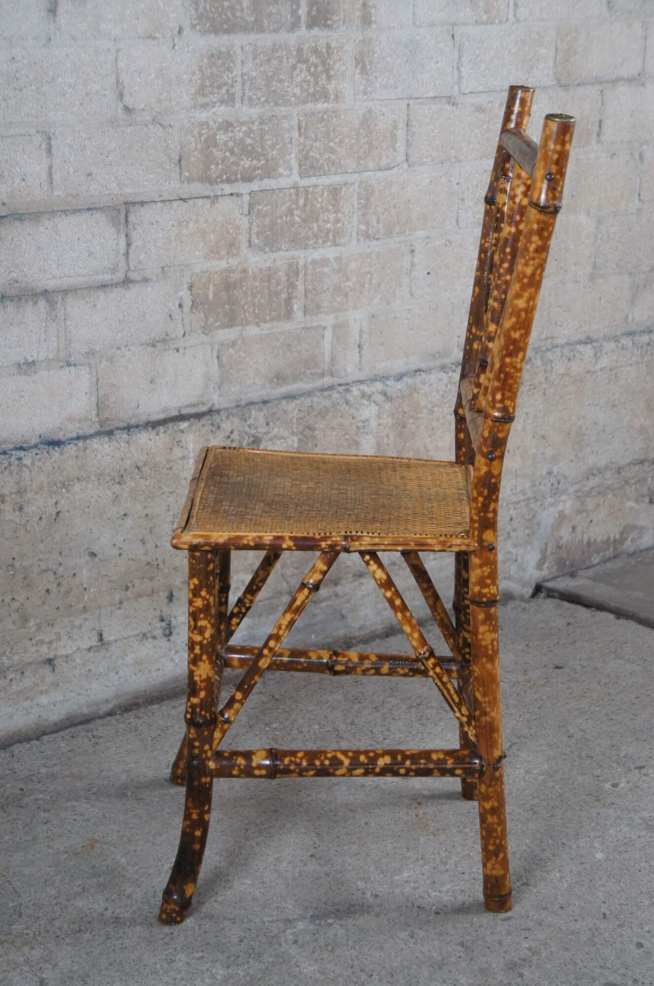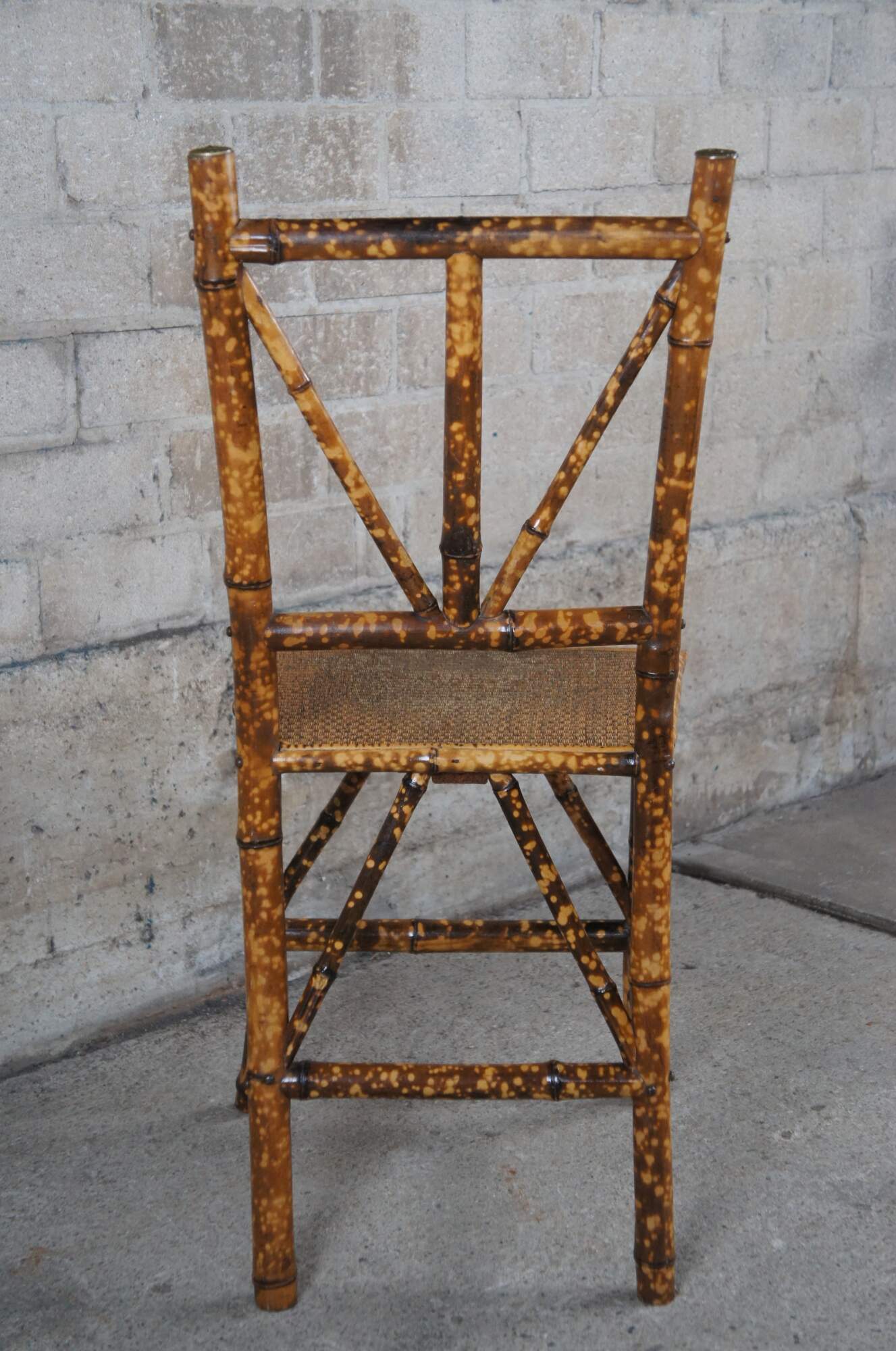 A lovely pair of petite scorched bamboo accent chairs. Great for use with a vanity or as an occasional seat.