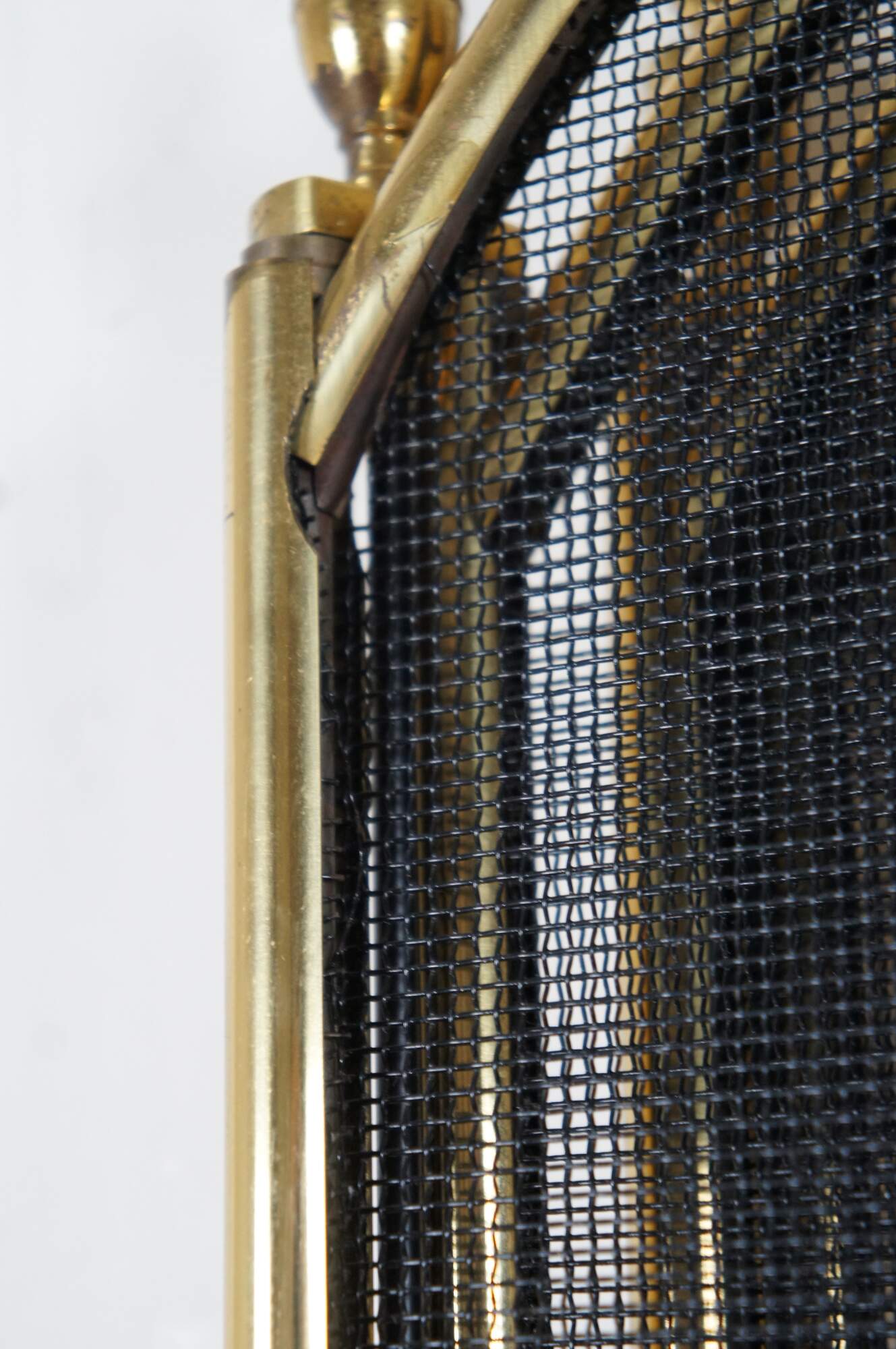 Vintage four panel polished brass and wire mesh fireplace screen featuring arched tops, turned urn shaped finials, and square handles. 18th century design