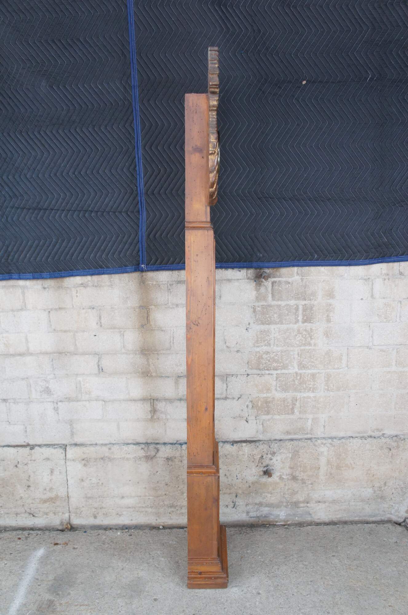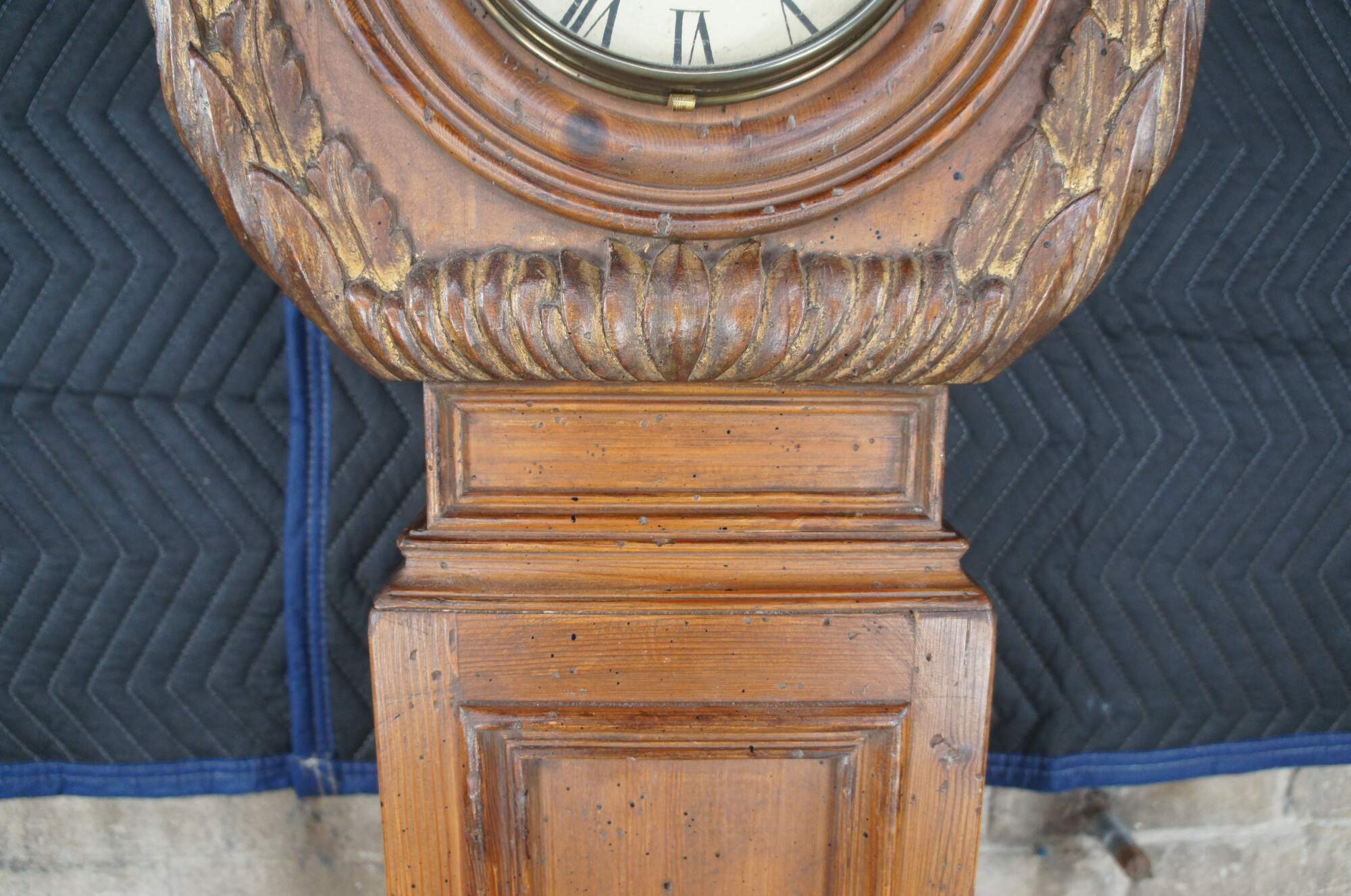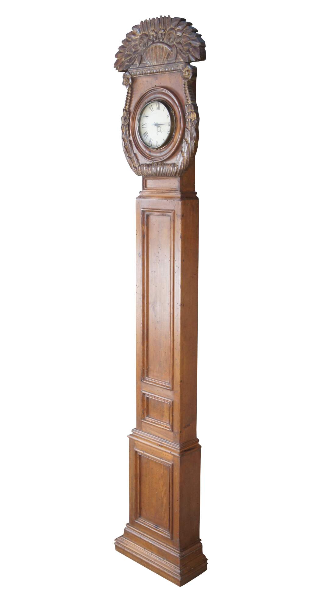 Gustavian inspired longcase clock by Chapman, circa last quarter 20th century. Made from distressed pine with a diminutive long paneled case. The round face of the clock is protected by a glass window and surrounded by acanthus leaf carvings. The crown of the clock is highlighted by a beautiful bouquet of flowers. The carved areas of the clock are enhanced by a gold finish. The mechanism is battery powered. Marked Chapman made in Spain.