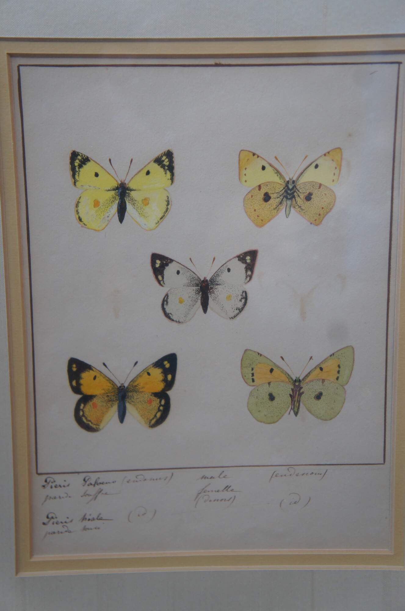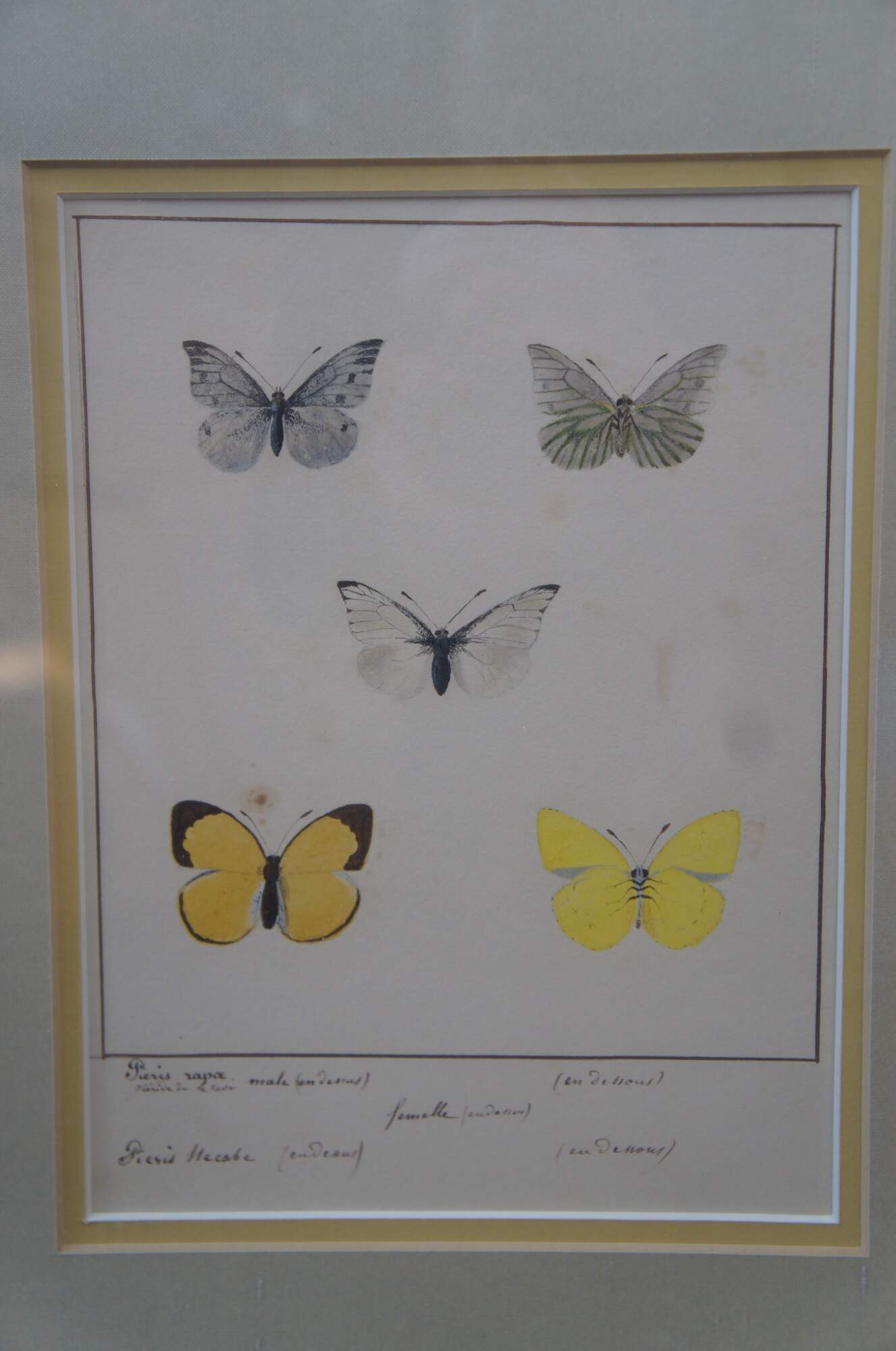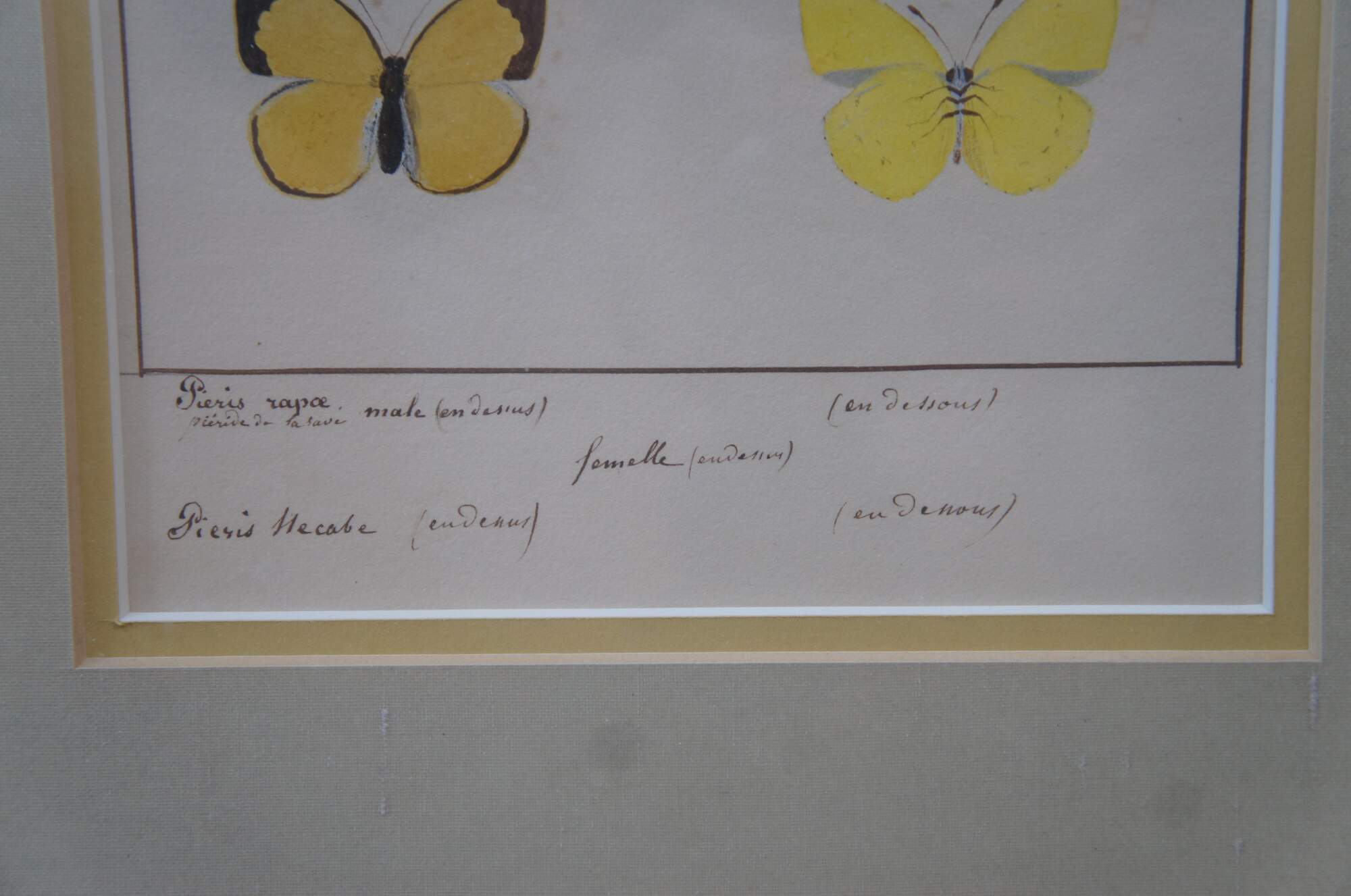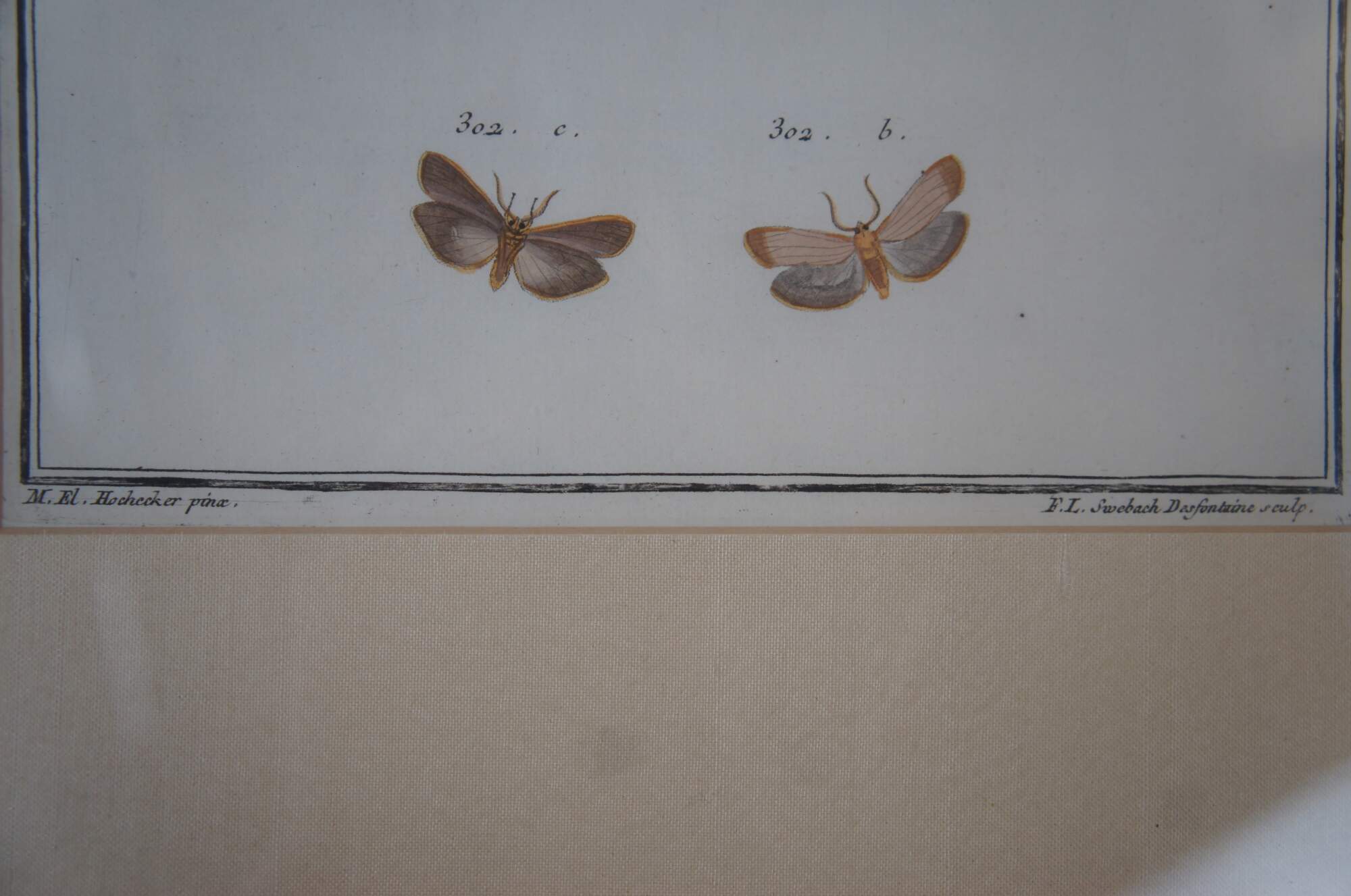 One hand-colored engraving is from Jacques Louis Engramelle's Papillons d'Europe. The work was published in Paris by Delaquette, Basan & Poignant between 1779 and 1792. The original hand-coloring and engraving were completed by Desfontainese, Juillet and others. Ernst is mentioned as the illustrator for the work, though most of the illustrations were after the work of Mara Eleon Hochecker. The engravings were printed on chain-linked, watermarked paper.