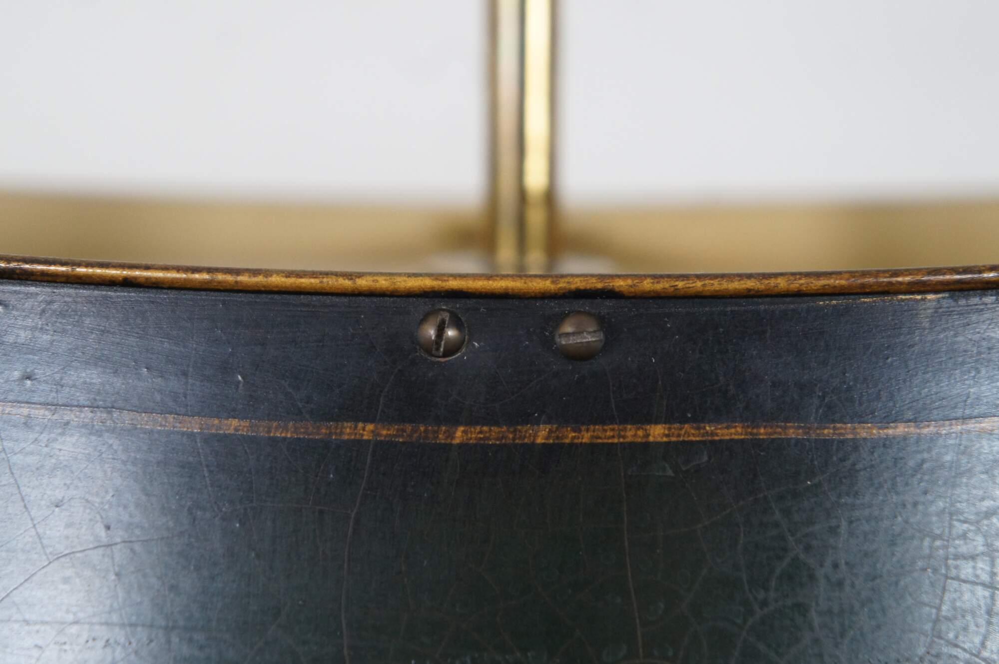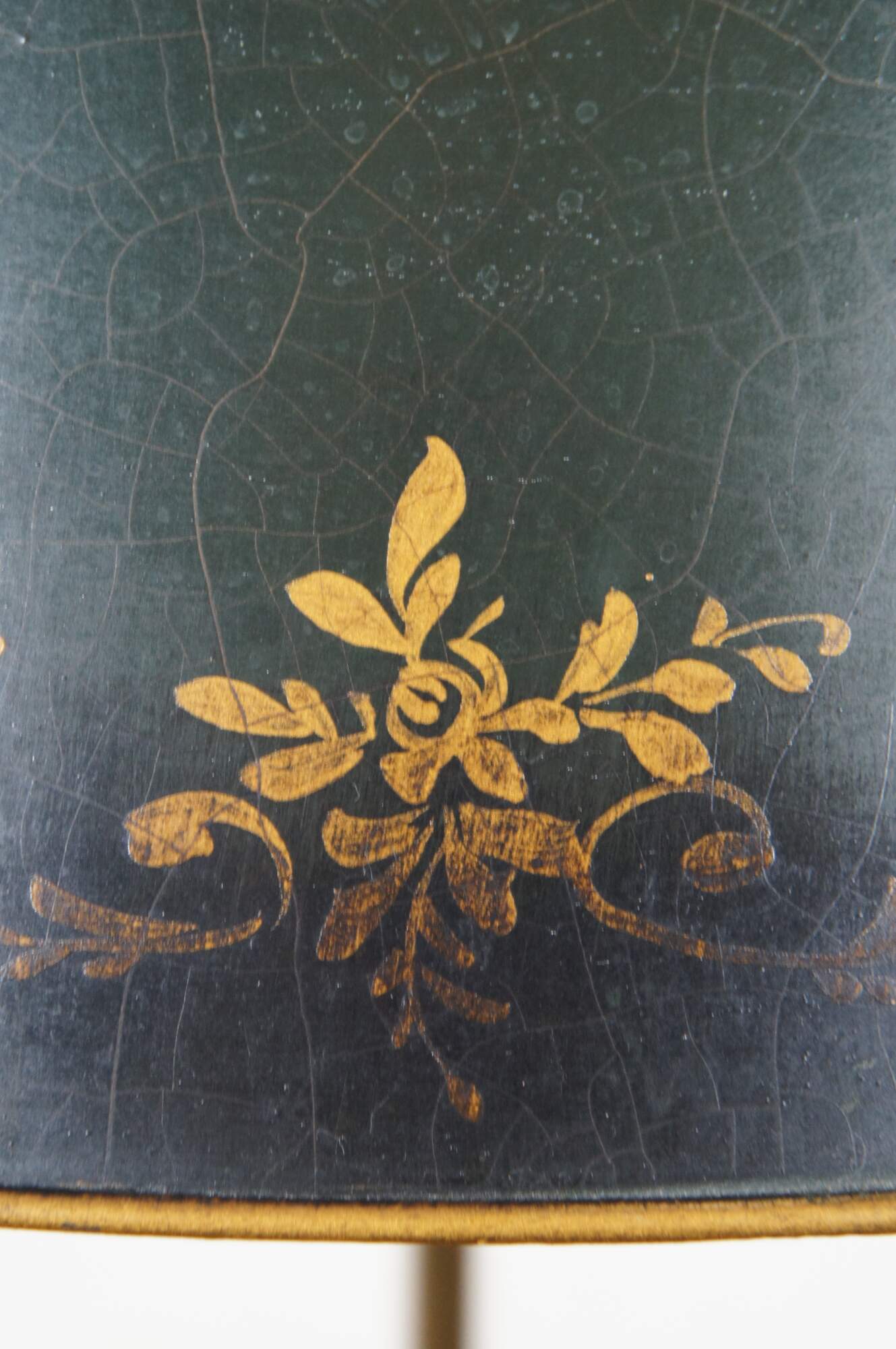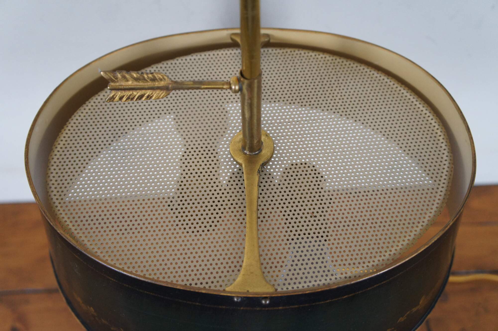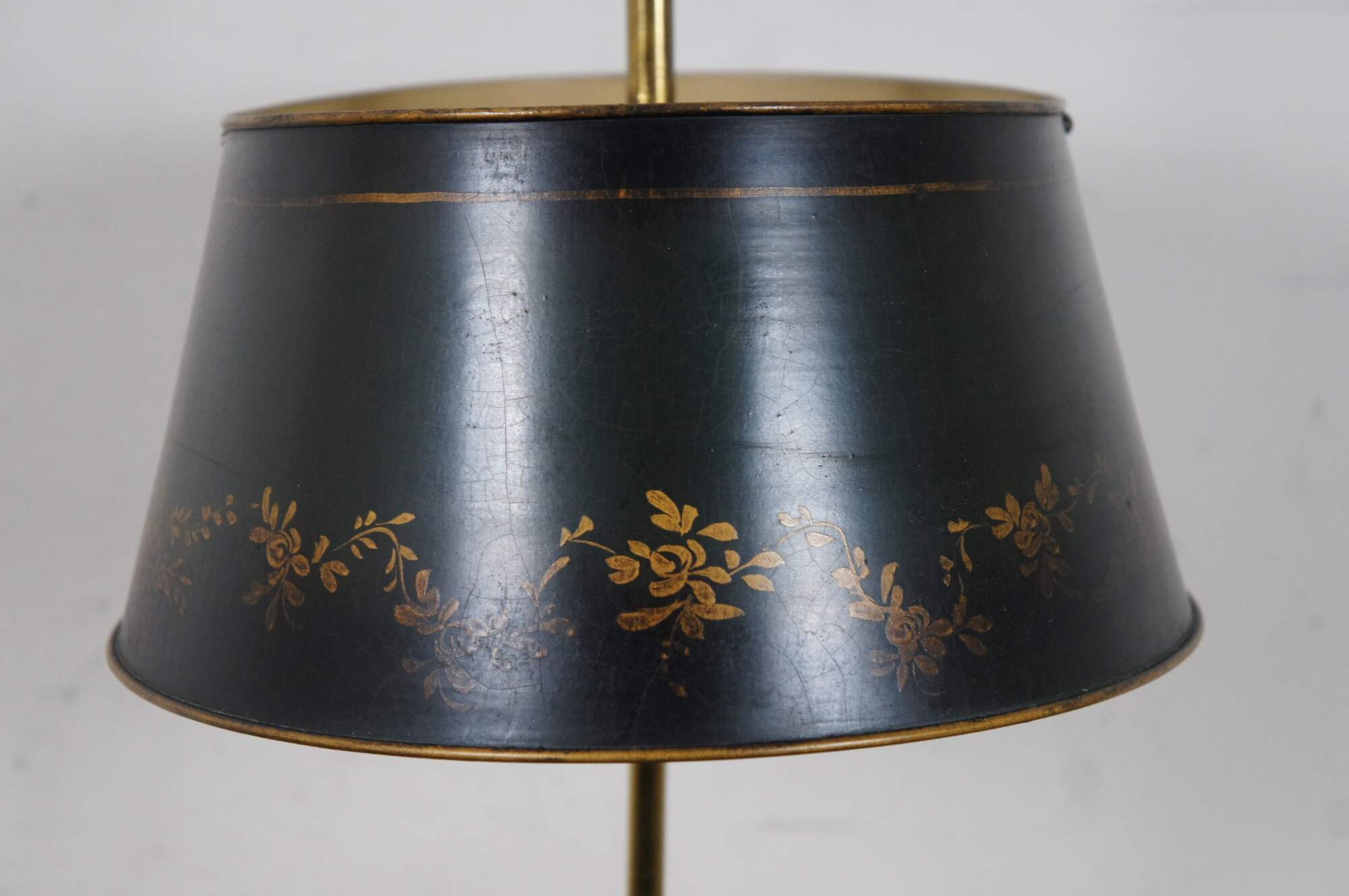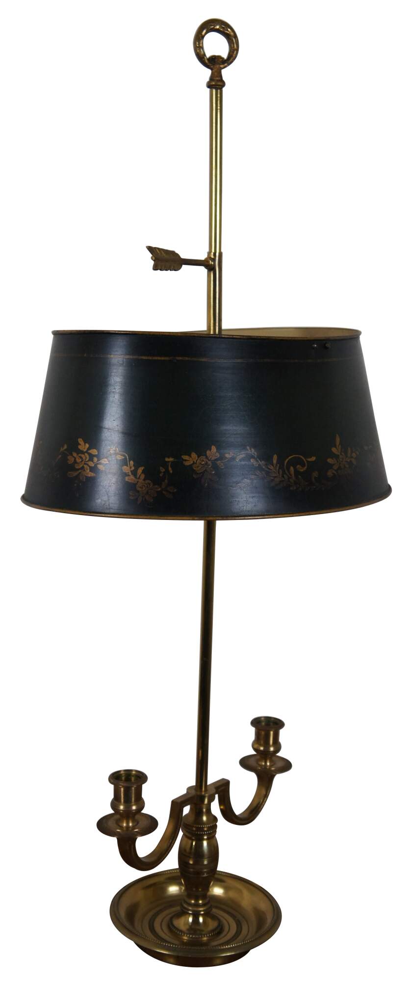 Vintage mid 20th century French bouillotte style two light table lamp featuring a brass double candlestick base, arrow and wreath finial, and hand painted black and gold tole metal shade.