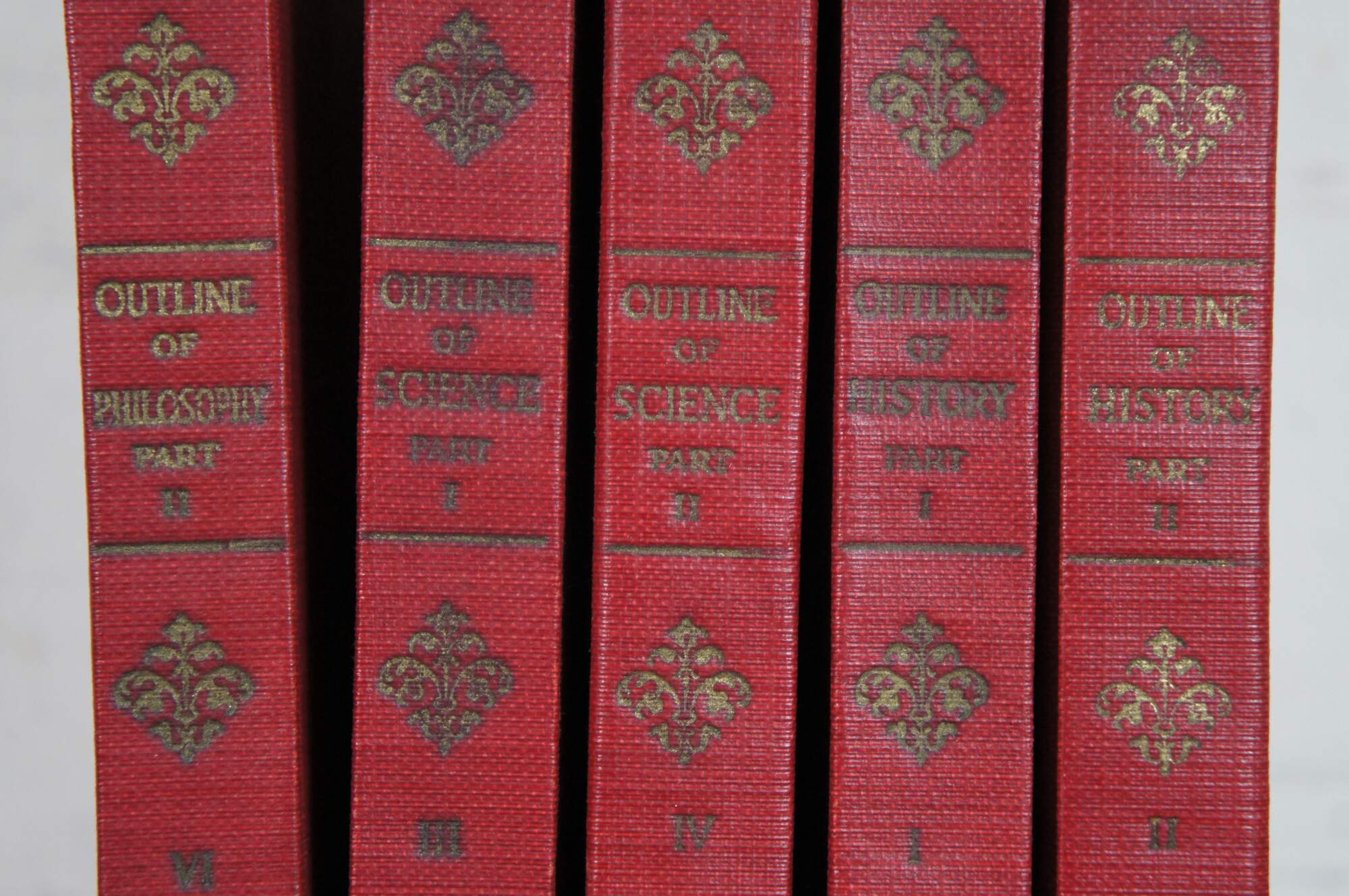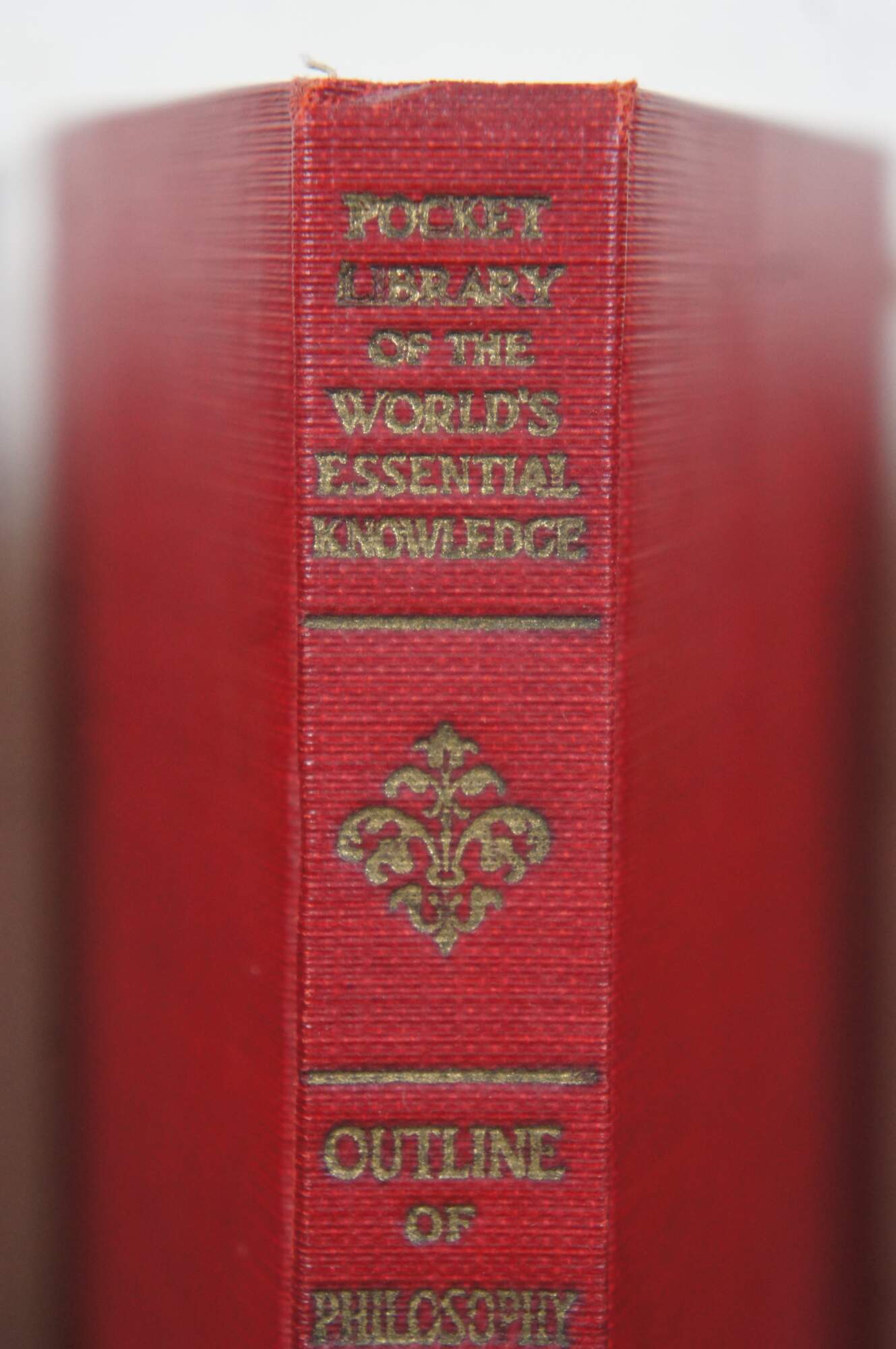 Set of ten red cloth, hard bound books comprising the “Pocket Library of the World’s Essential Knowledge” in 10 Volumes, a complete set containing the Outlines of History, Science, Philosophy, Literature, and Business – Editor-in-Chief Henry Cook Hathaway, A.B. - Published by Funk & Wagnalls Company 1929 – Copyright 1910.