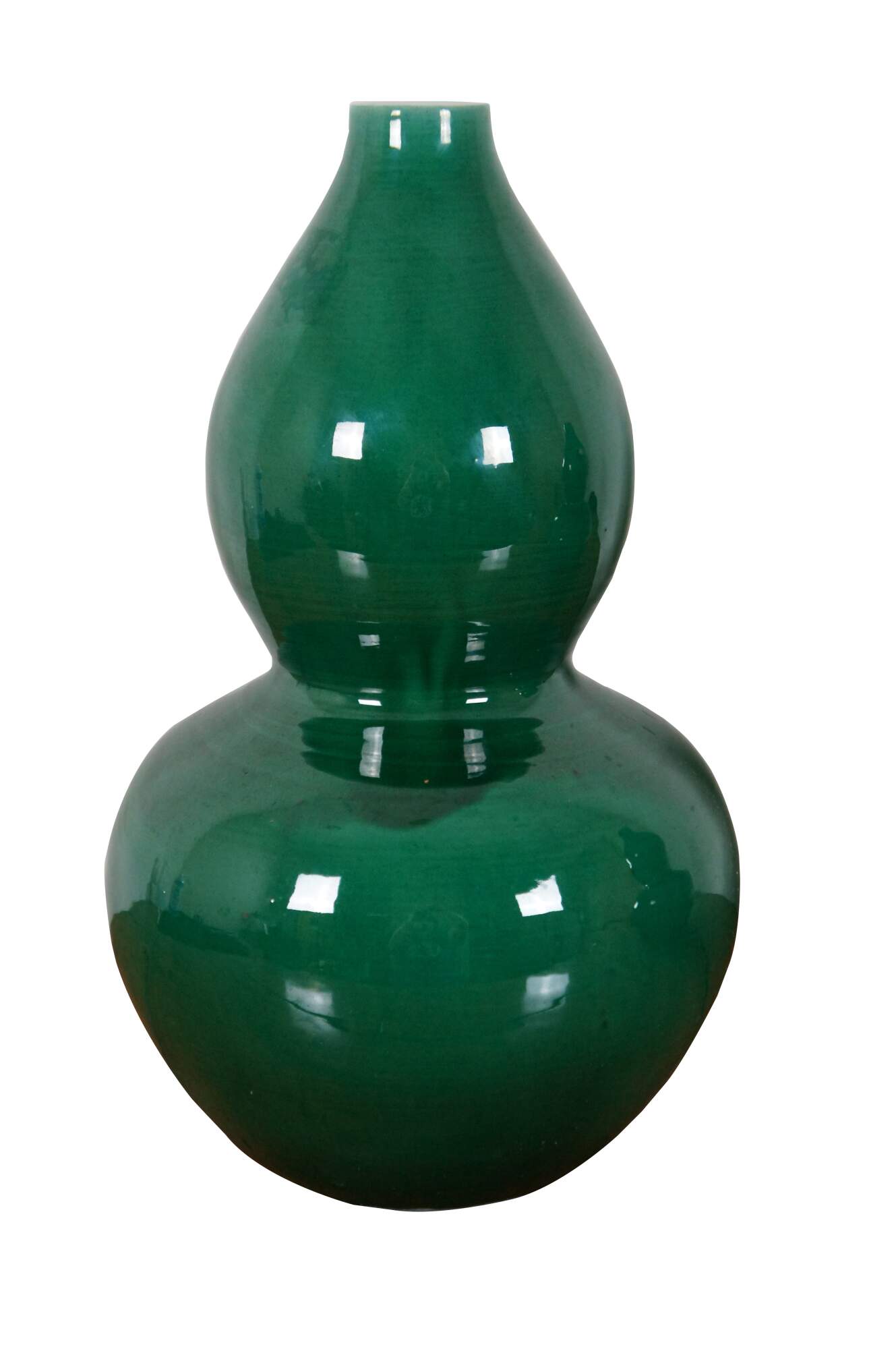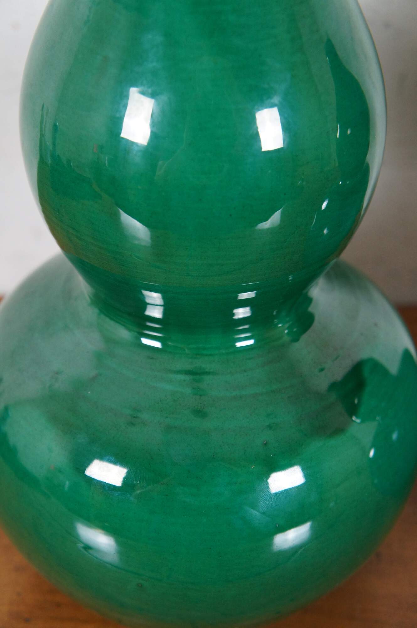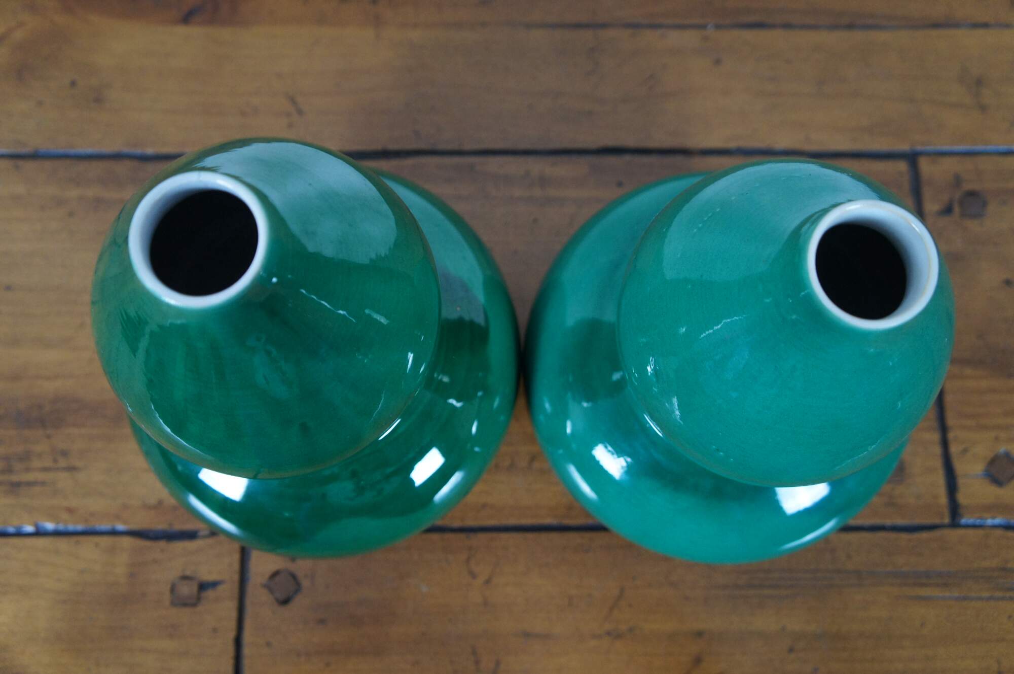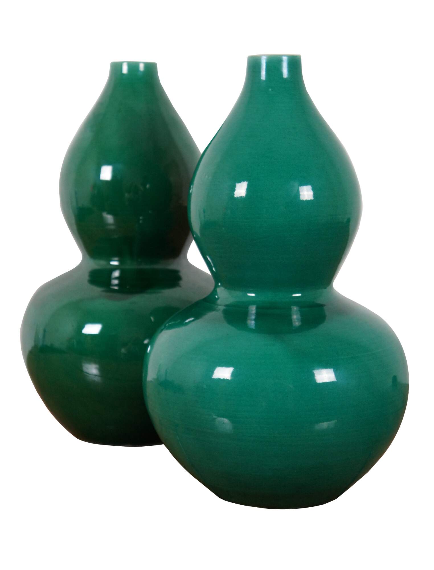 Pair of emerald green Chinese double gourd shaped porcelain vases. Marked on bases.