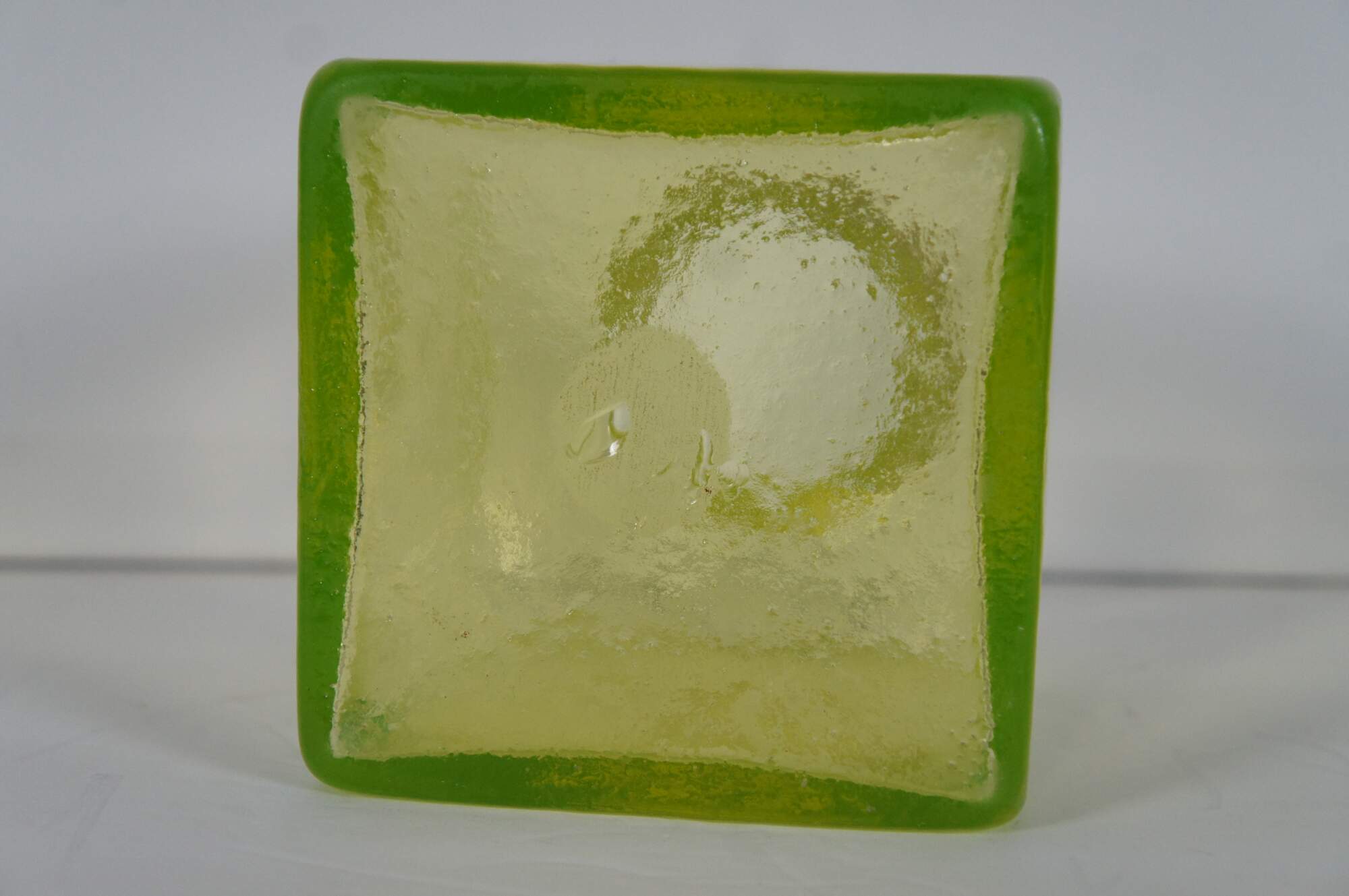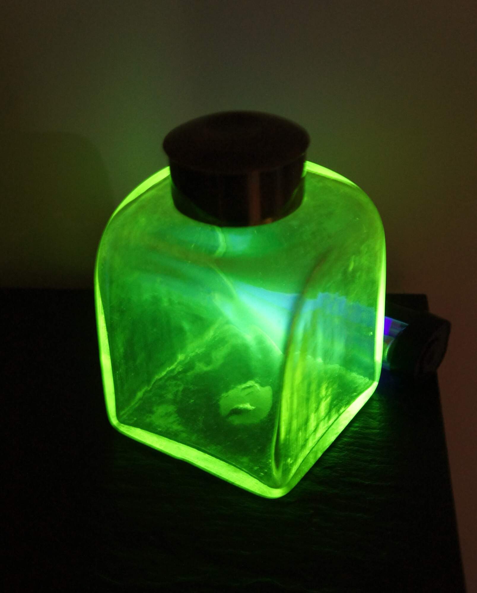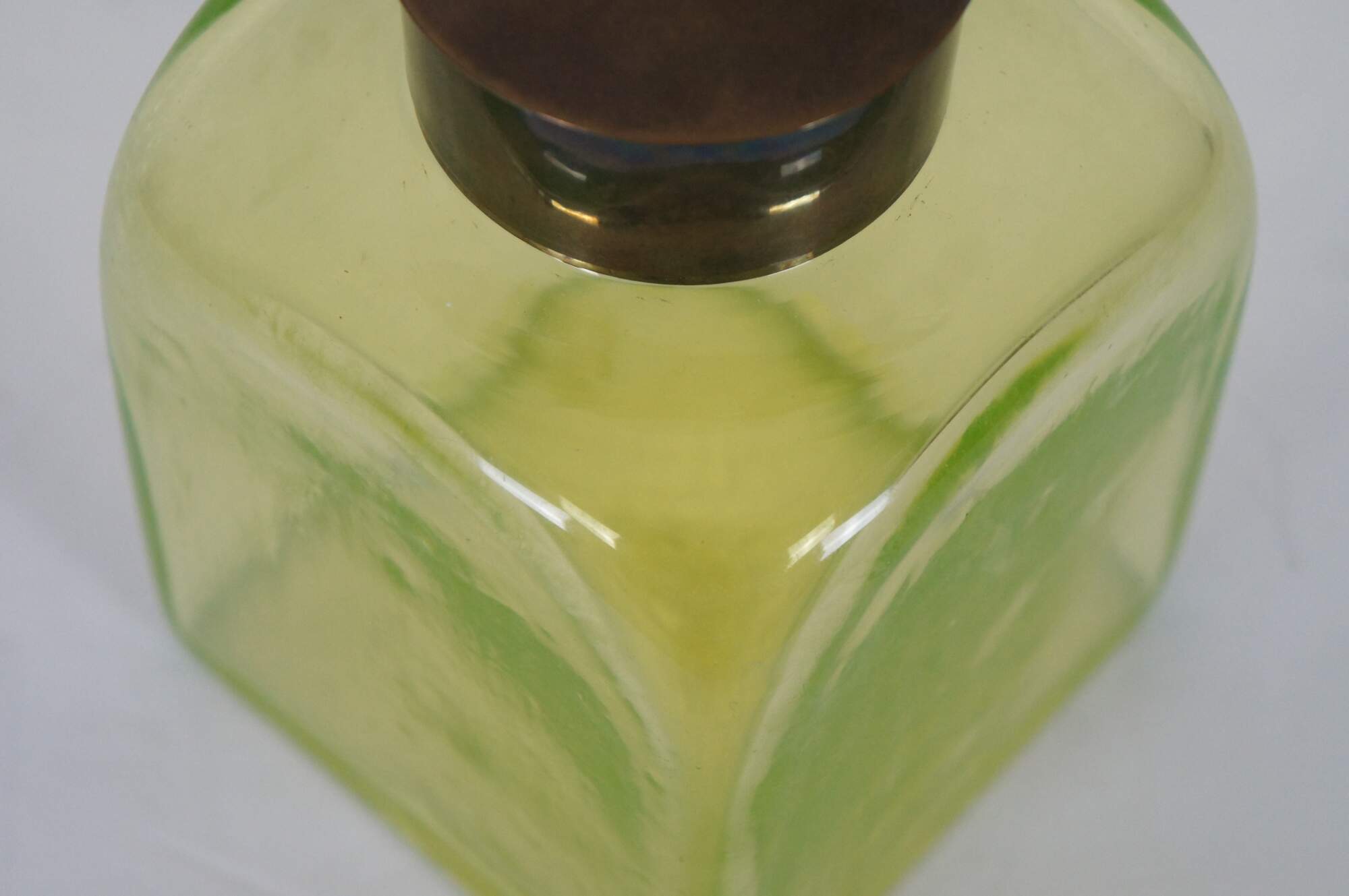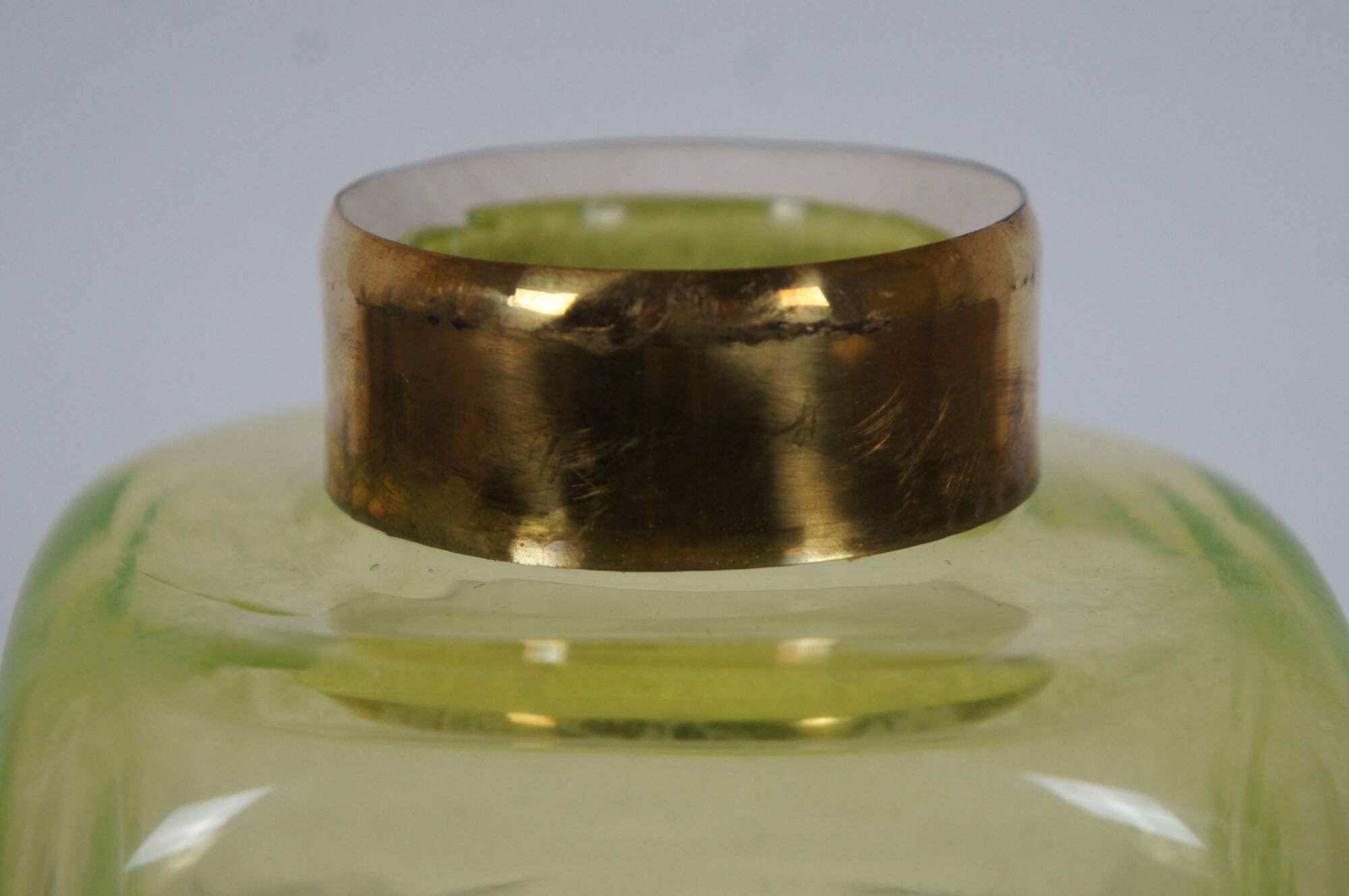 Antique hand blown, square shaped, yellow Vaseline / uranium glass jar / canister with brass clad rim and lid. Glows green in blacklight.