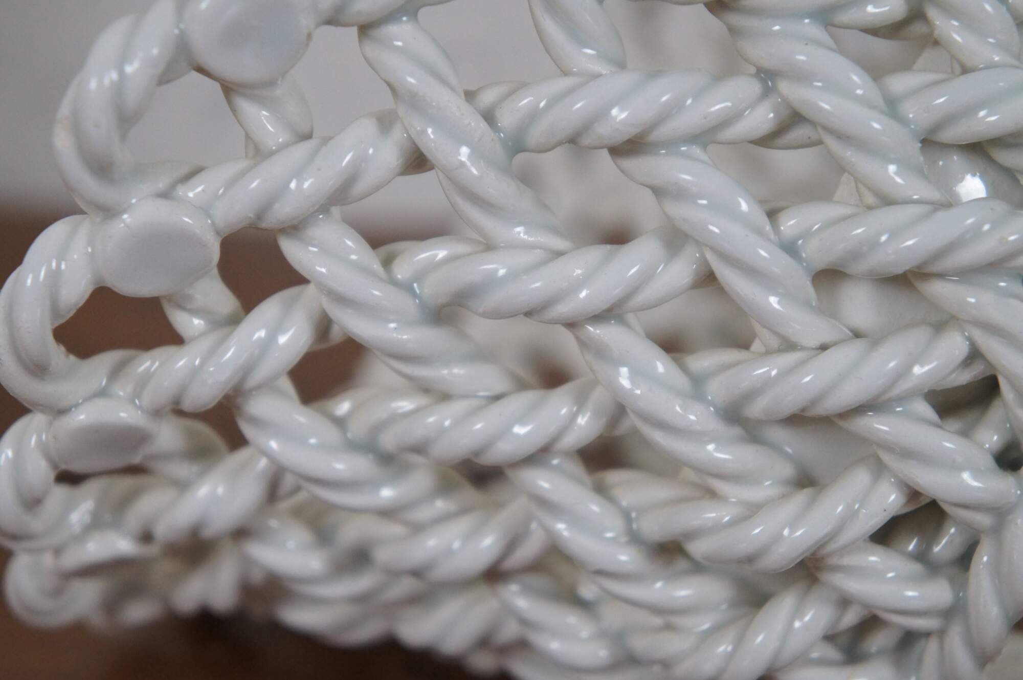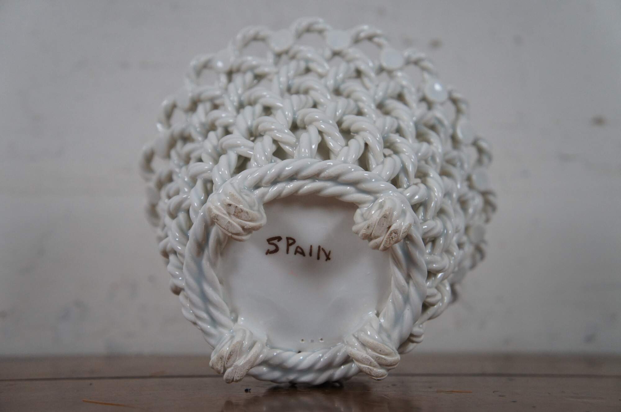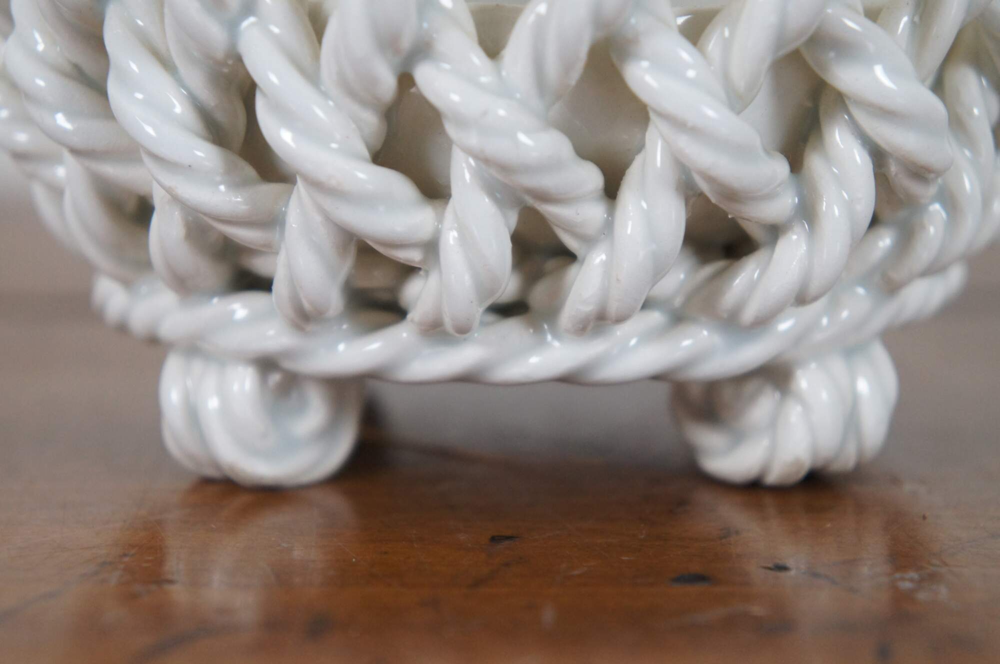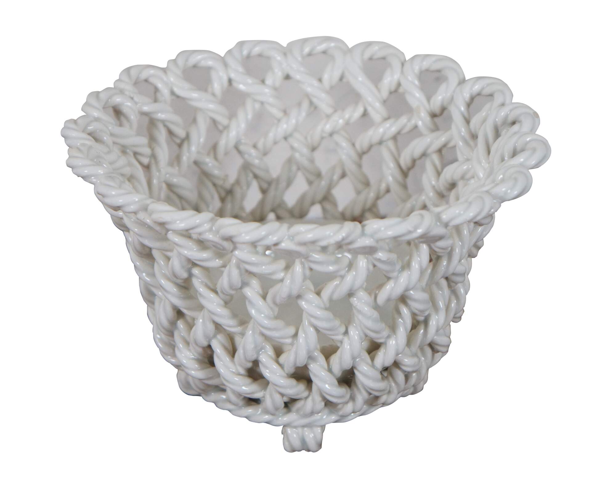 Vintage white porcelain / blanc de chine cachepot with a round open basket weave design, flared mouth, and knot feet. Marked Spain.