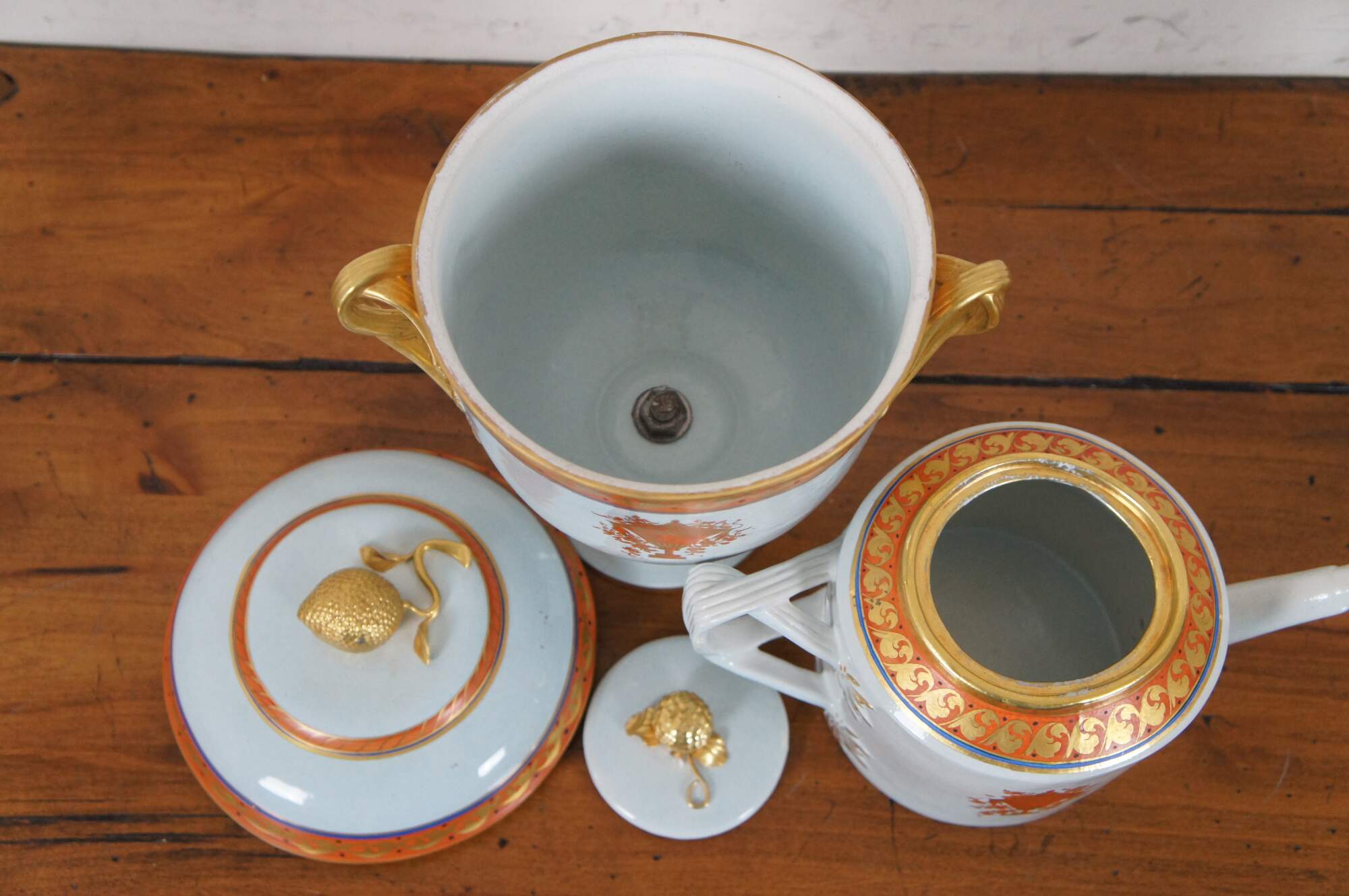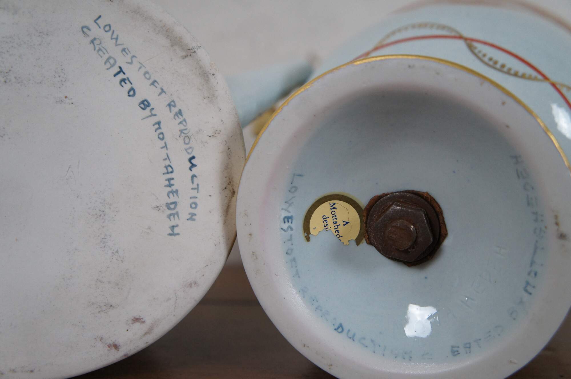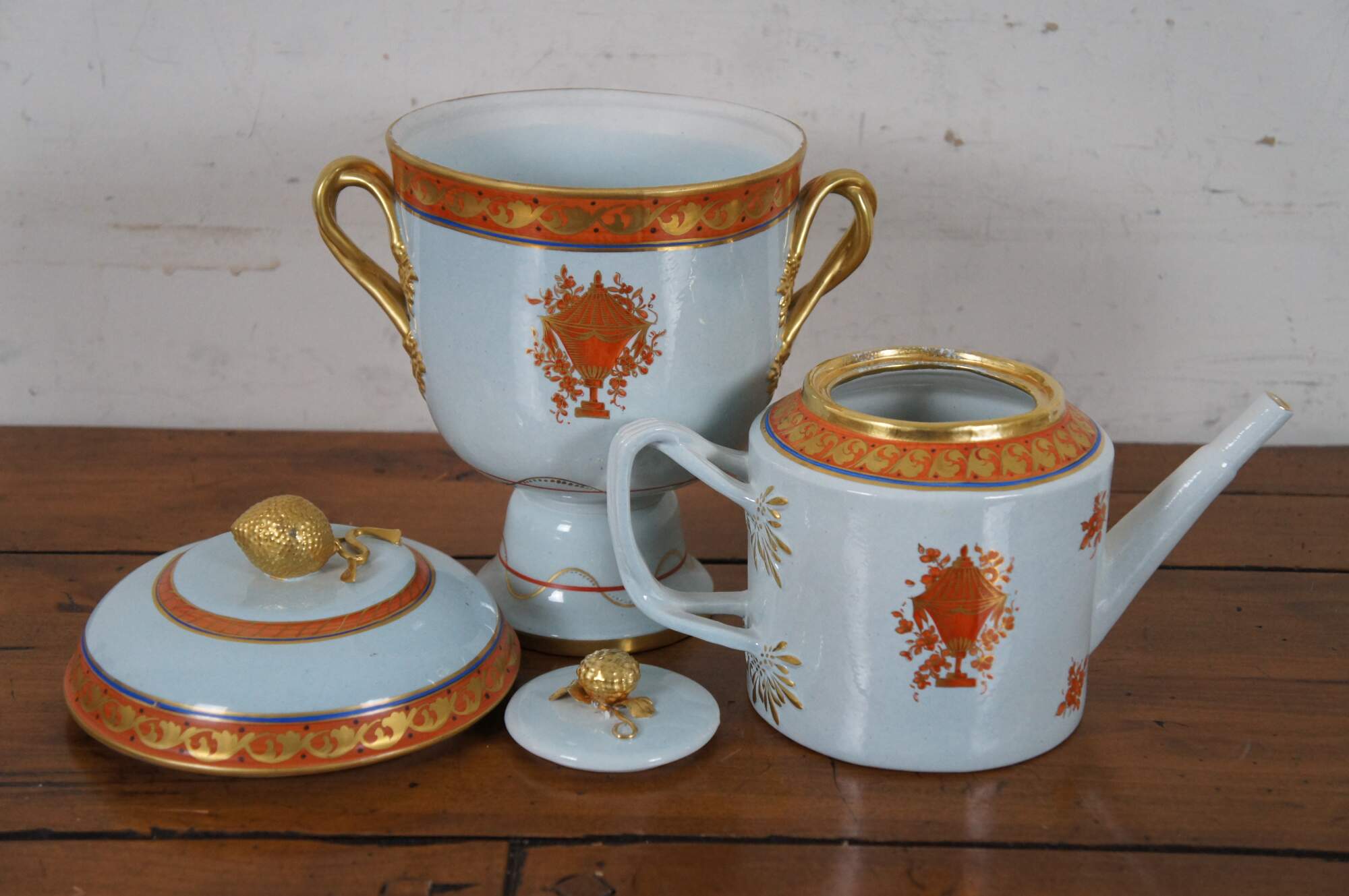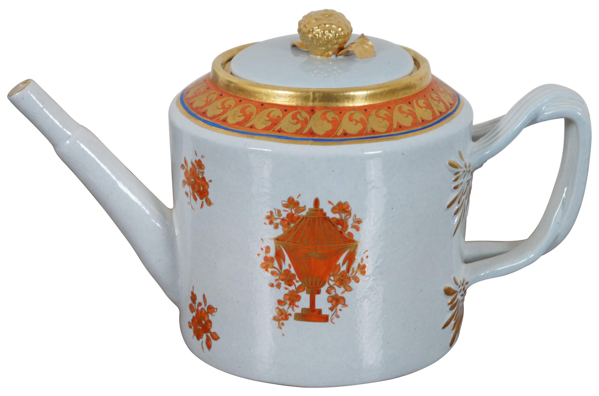 Pair of vintage mid 20th century reproduction Lowestoft style porcelain by Mottahedeh, one lidded cachepot and one tea pot, featuring a lightly blue tinted base, decorated with vase, foliate, and floral designs in orange, blue and gold, with fruit shaped finials and branch shaped handles.