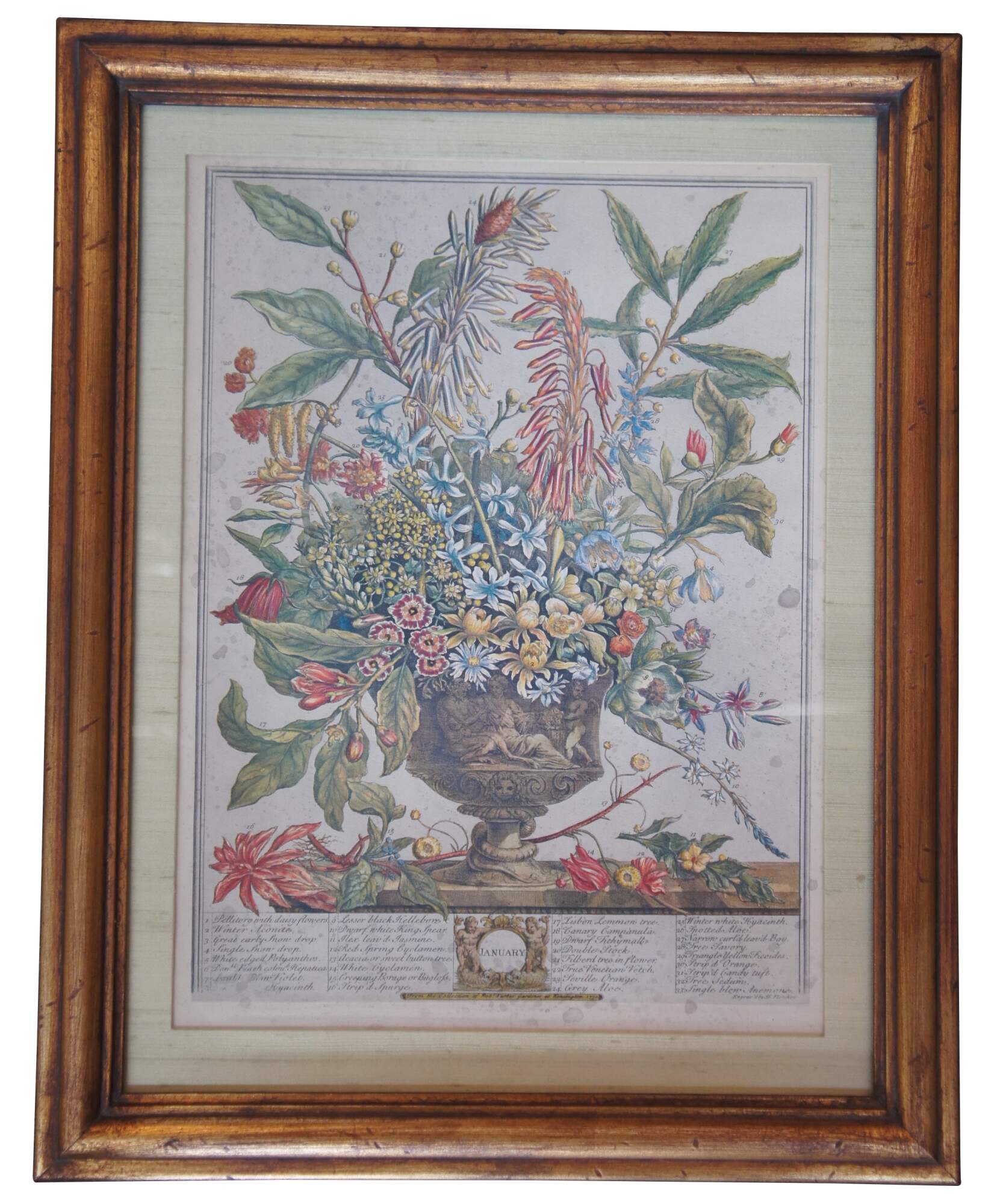 Six framed antique colored botanical engravings from a series titled “Twelve Months of Flowers,” original produced in the 1730’s to advertise Robert Furber's plant and seed catalog. People could select the flowers of the month and buy the seeds by using the numbers referenced at the bottom. Furber commissioned painter Peter Casteels and engraver Henry Fletcher to create the images. Includes January, February, April, May, September and November.