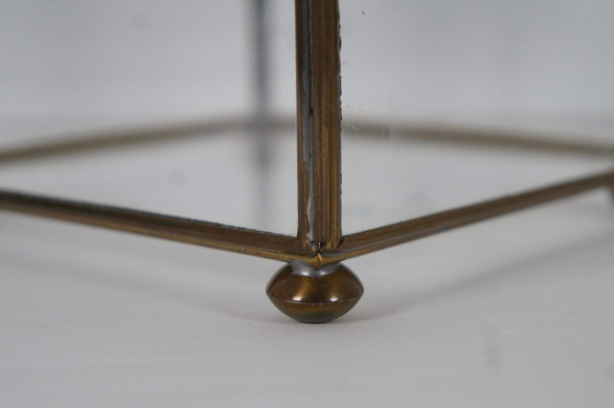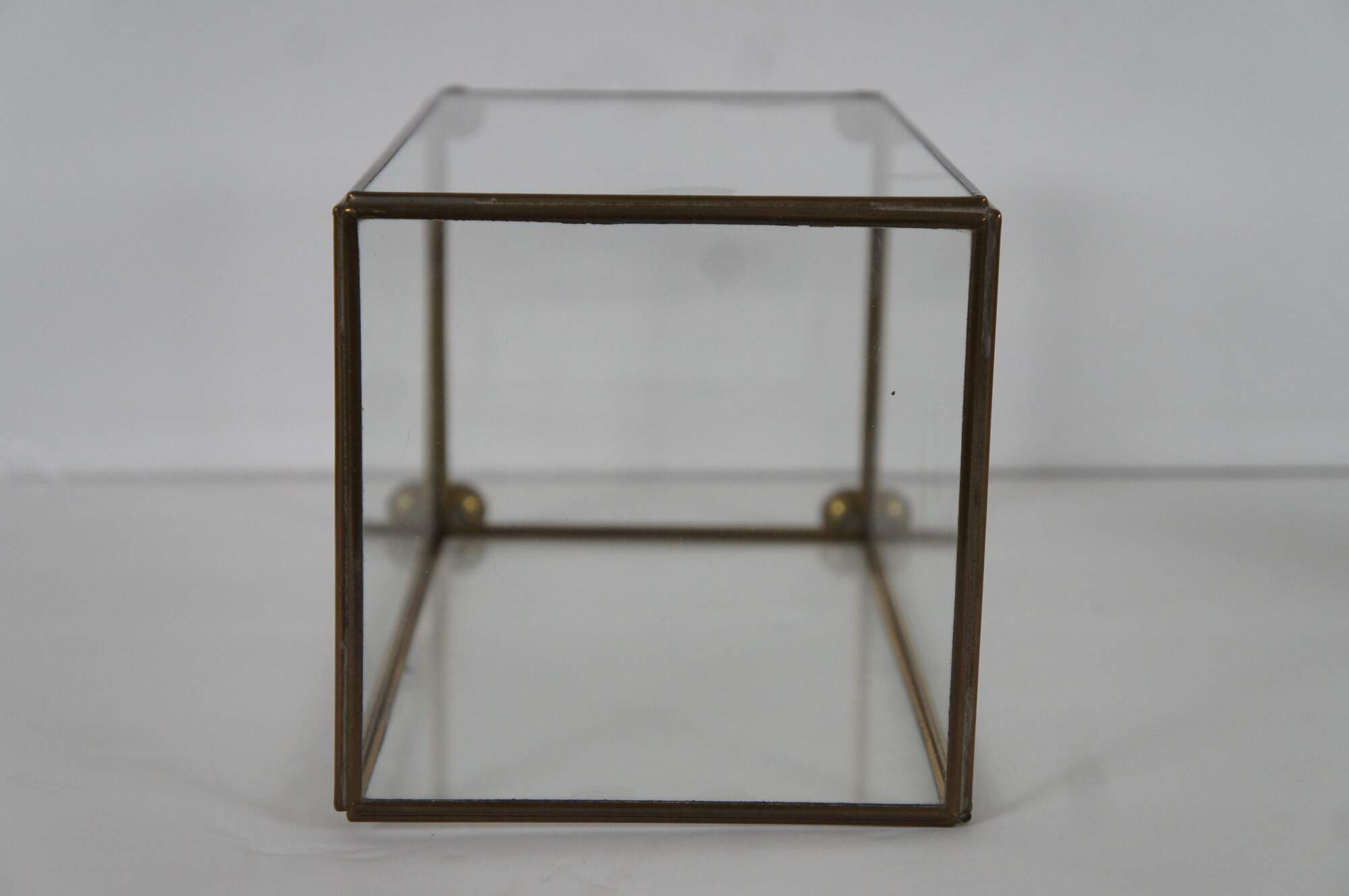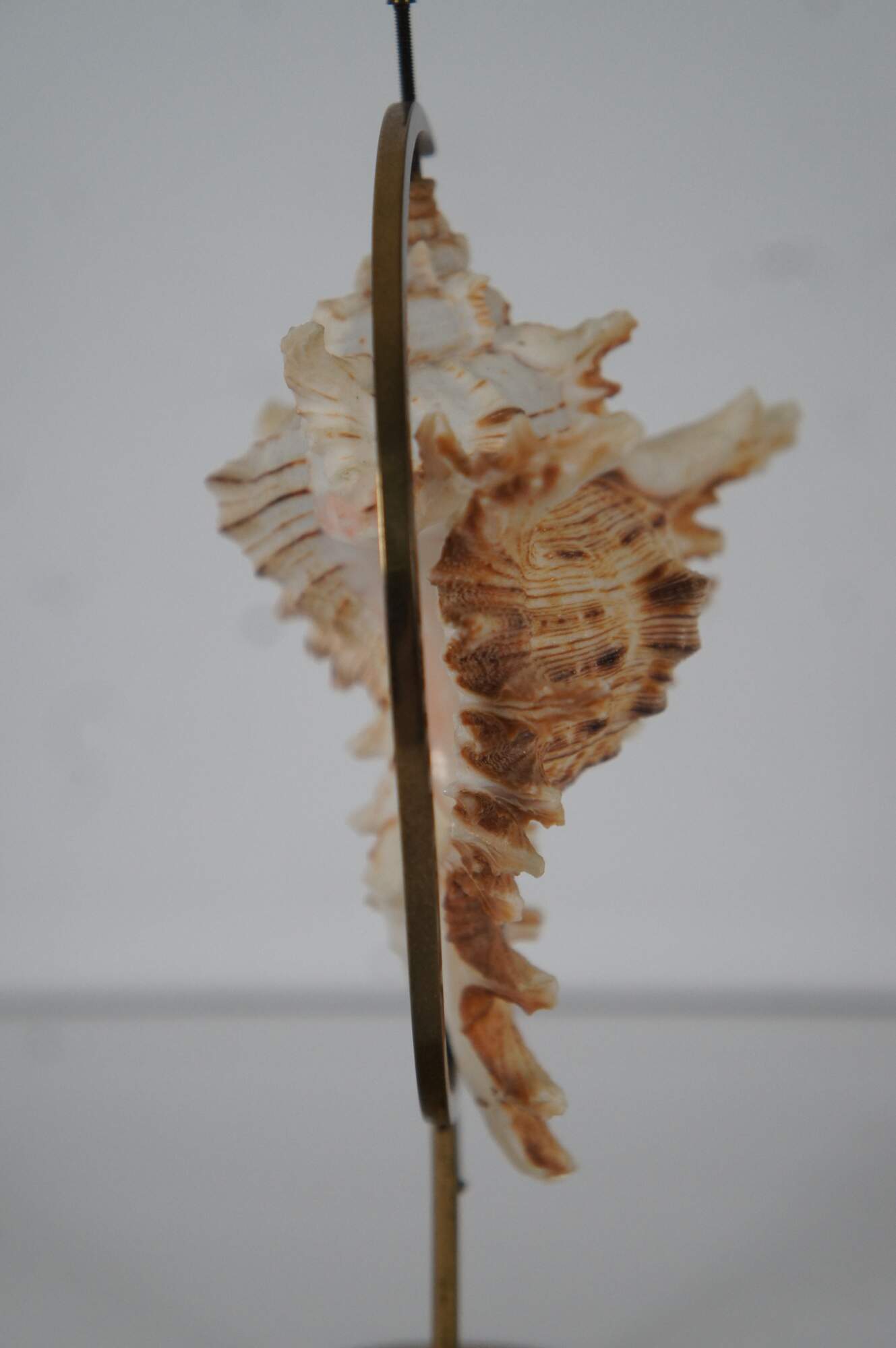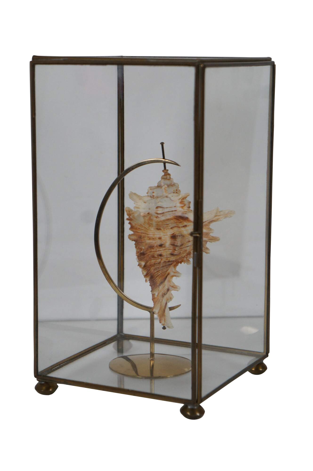 Vintage brass and glass display case / casket containing an ivory and copper colored spiked conch shell on a brass crescent stand.