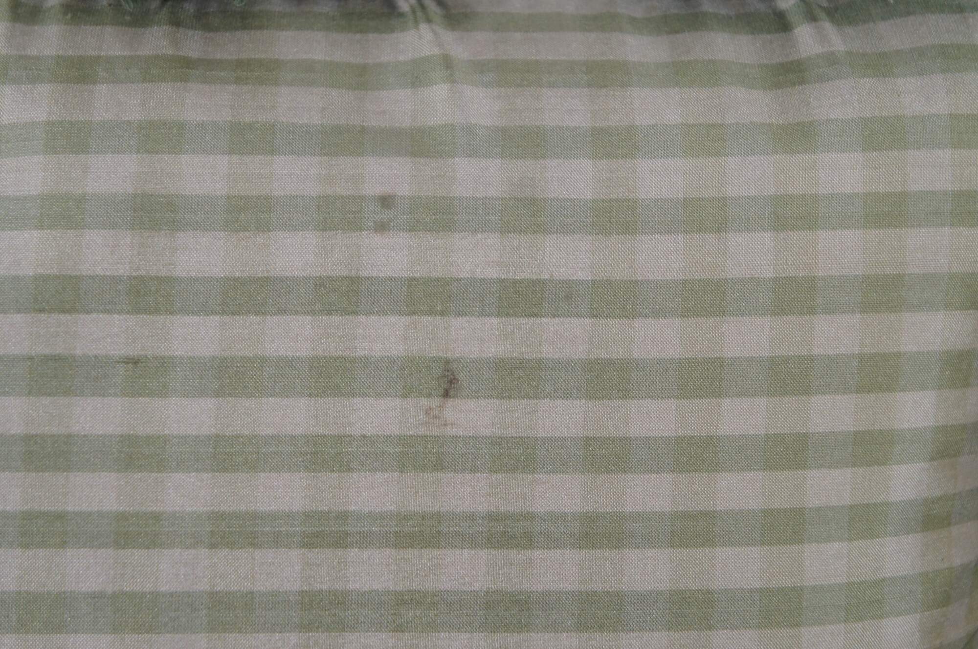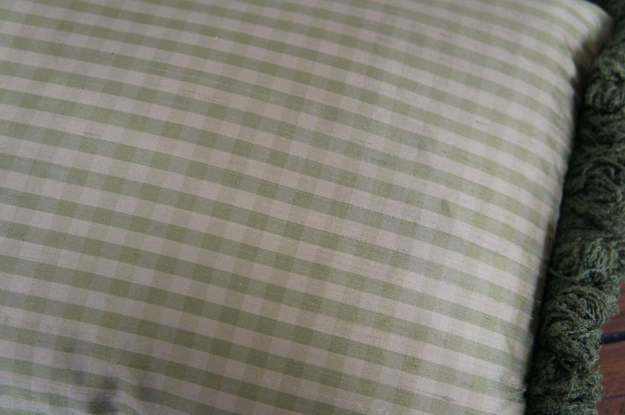 Pair of vintage lumbar throw pillows in green gingham with olive green fringe. Interior form is cotton filled with down/feathers.