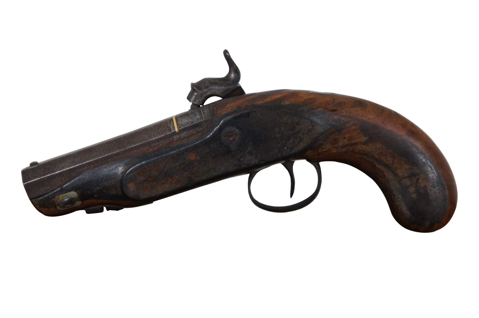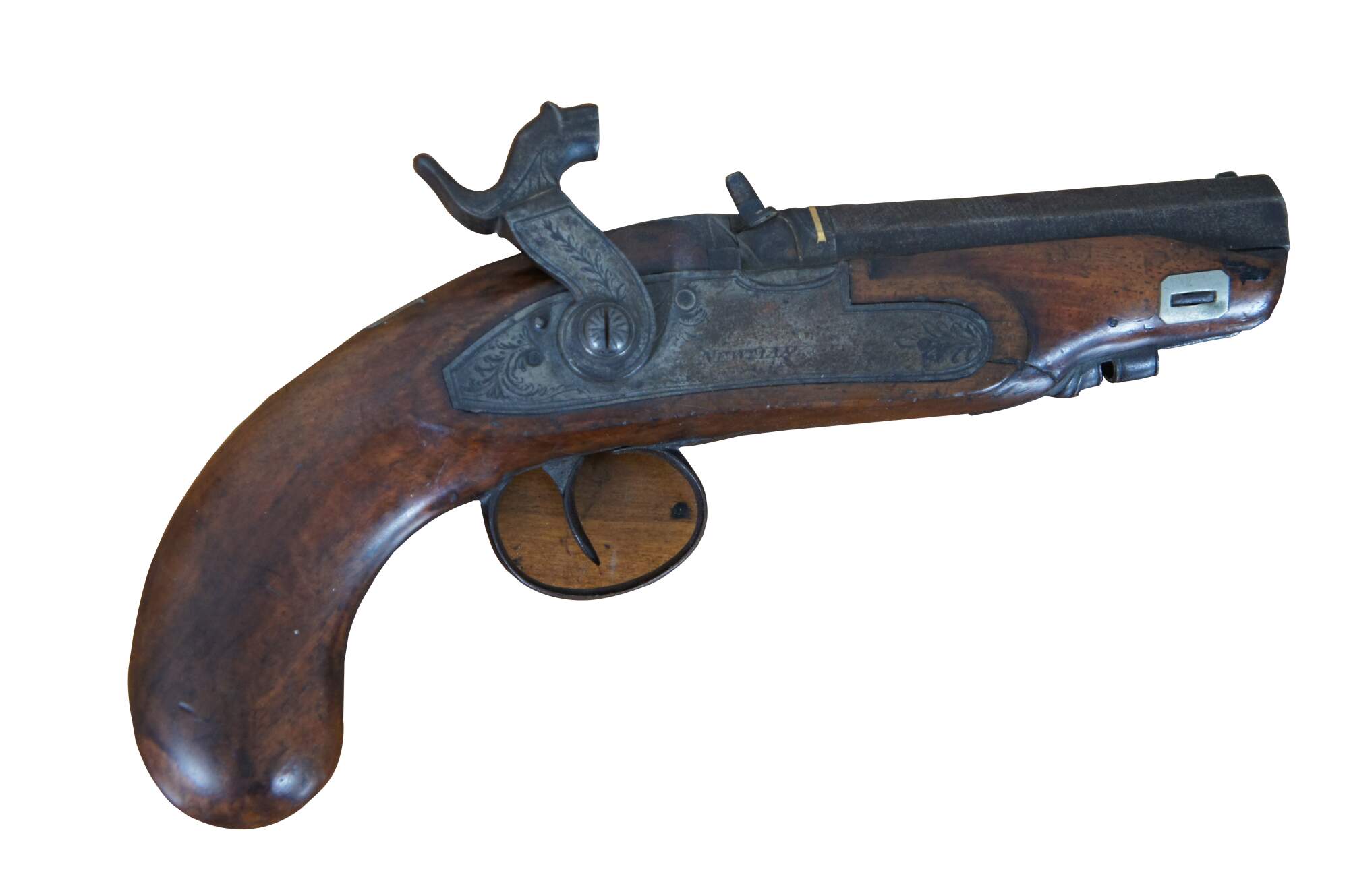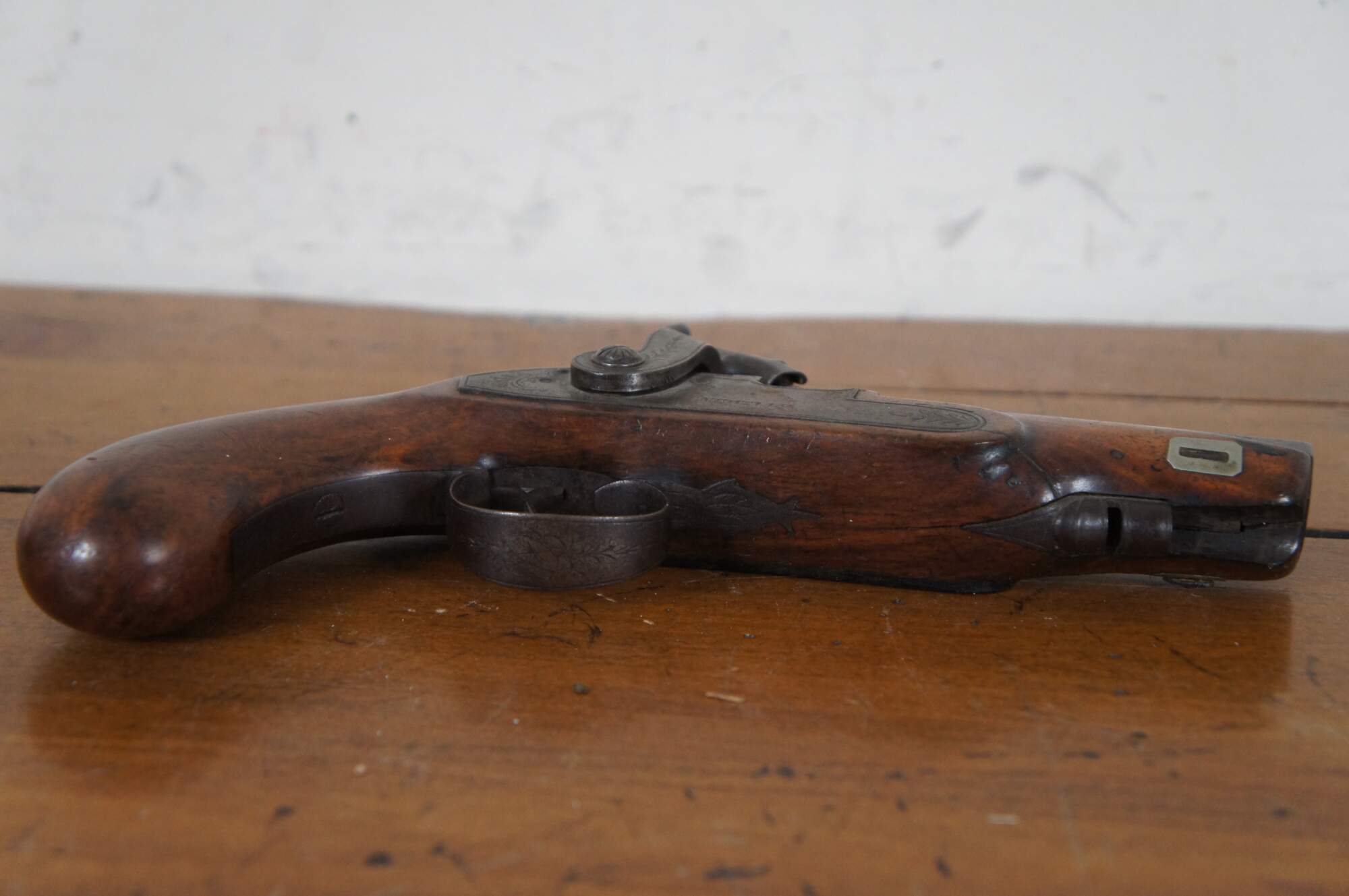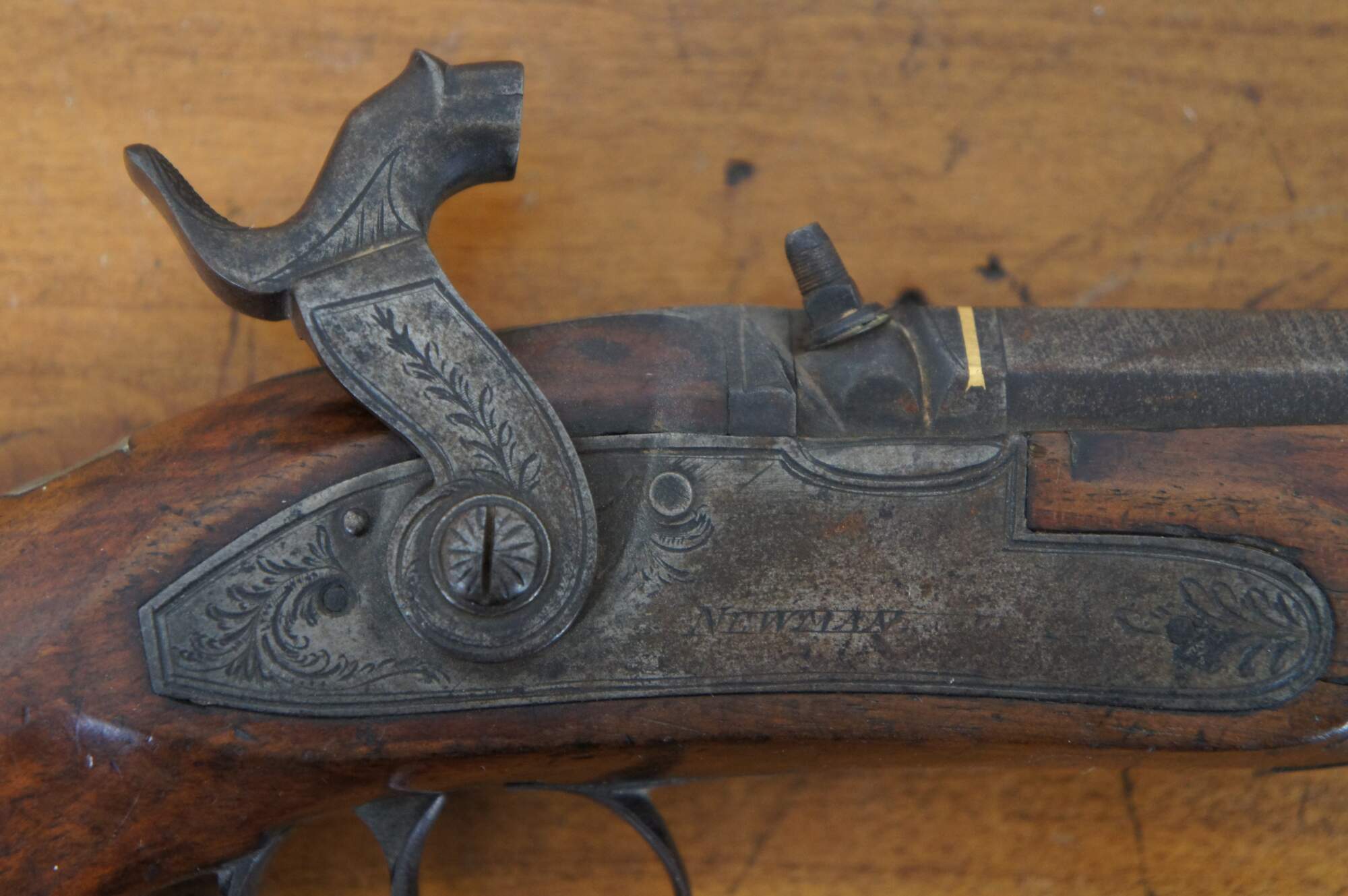 Antique mid 19th century percussion flintlock pocket pistol by Newman of Cork, Ireland featuring octagonal barrel housed in a walnut grip with inset metal mounts, trigger guard and hammer etched with foliate decoration. Top of grip includes a small shield shaped plate marked with the initial H. Circa 1840s