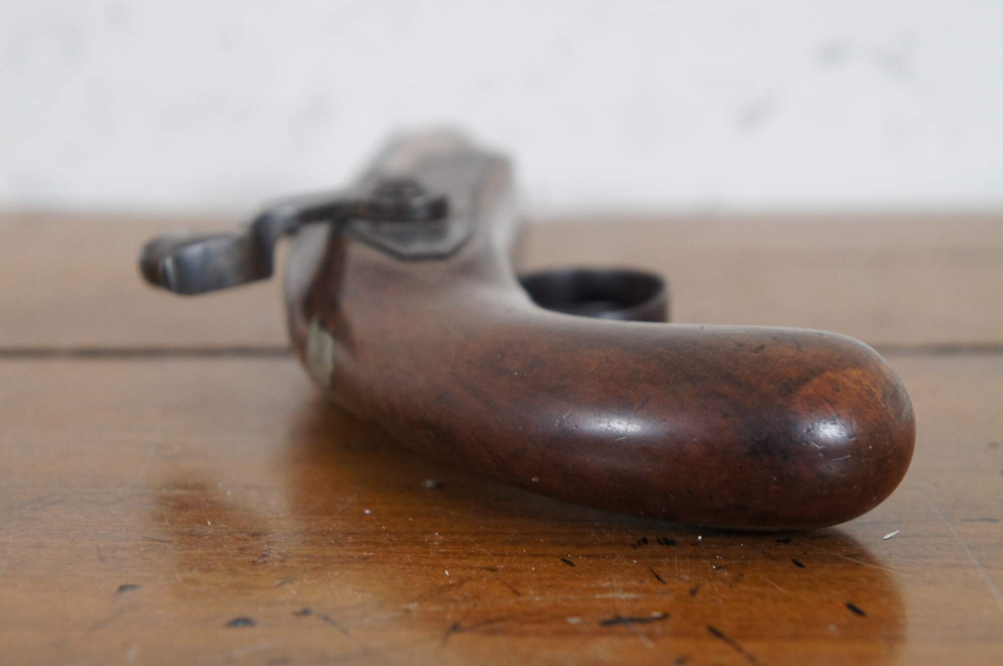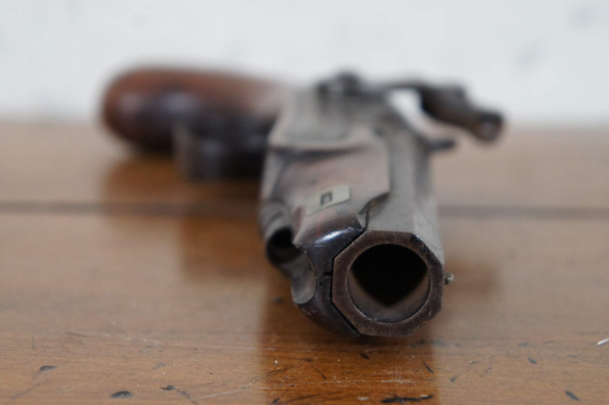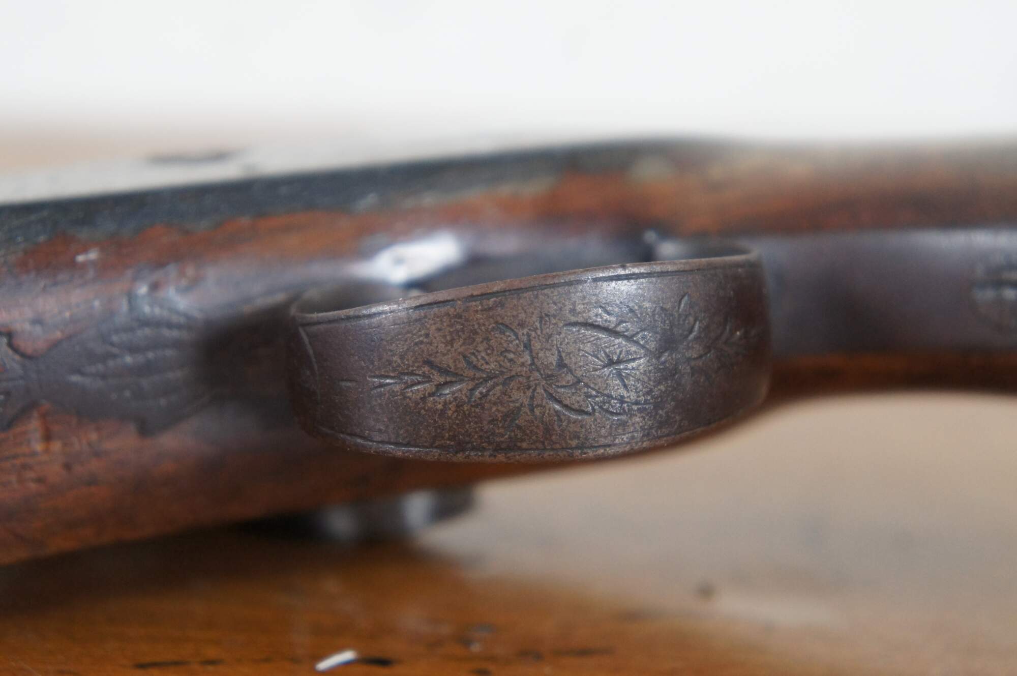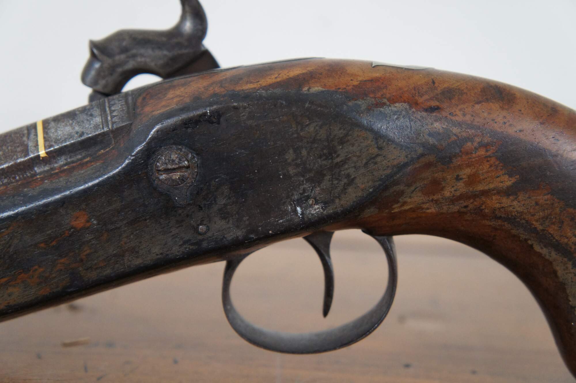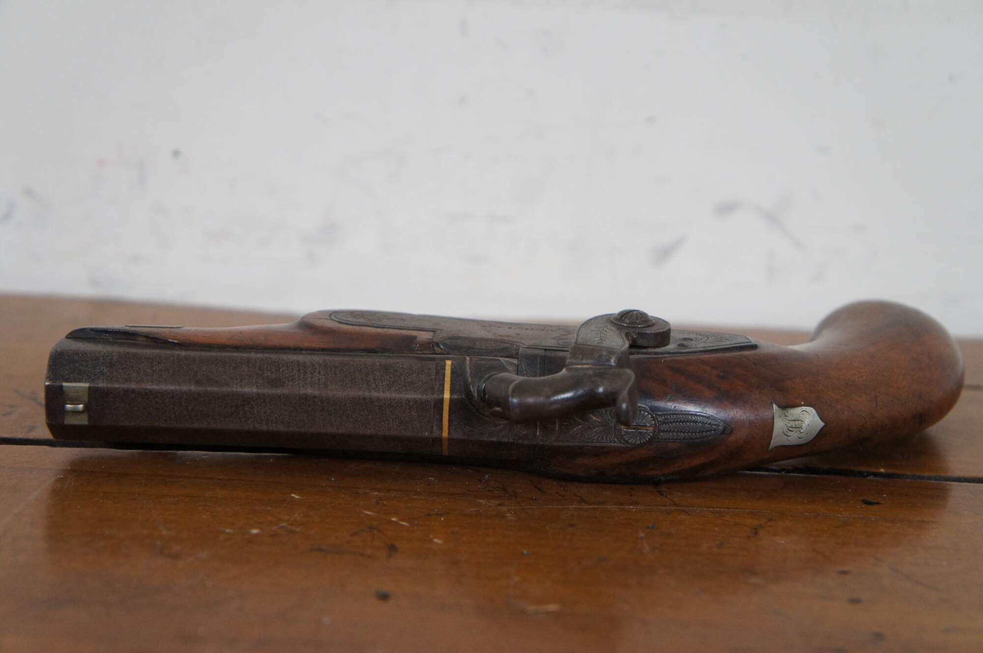 Antique mid 19th century percussion flintlock pocket pistol by Newman of Cork, Ireland featuring octagonal barrel housed in a walnut grip with inset metal mounts, trigger guard and hammer etched with foliate decoration. Top of grip includes a small shield shaped plate marked with the initial H. Circa 1840s