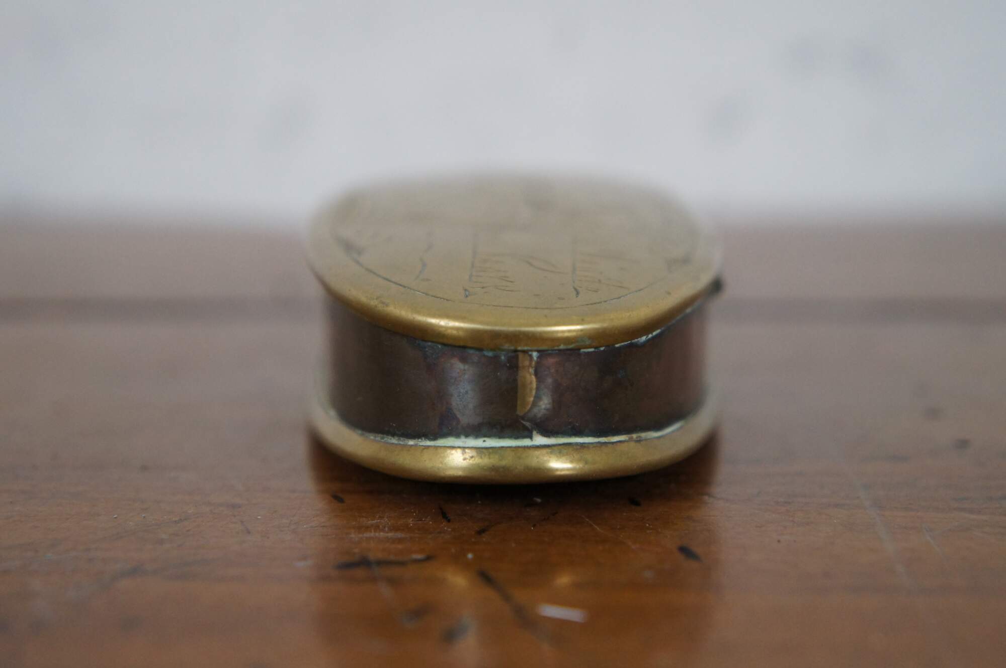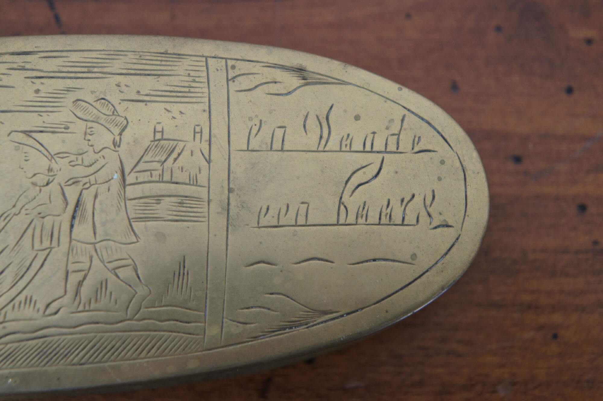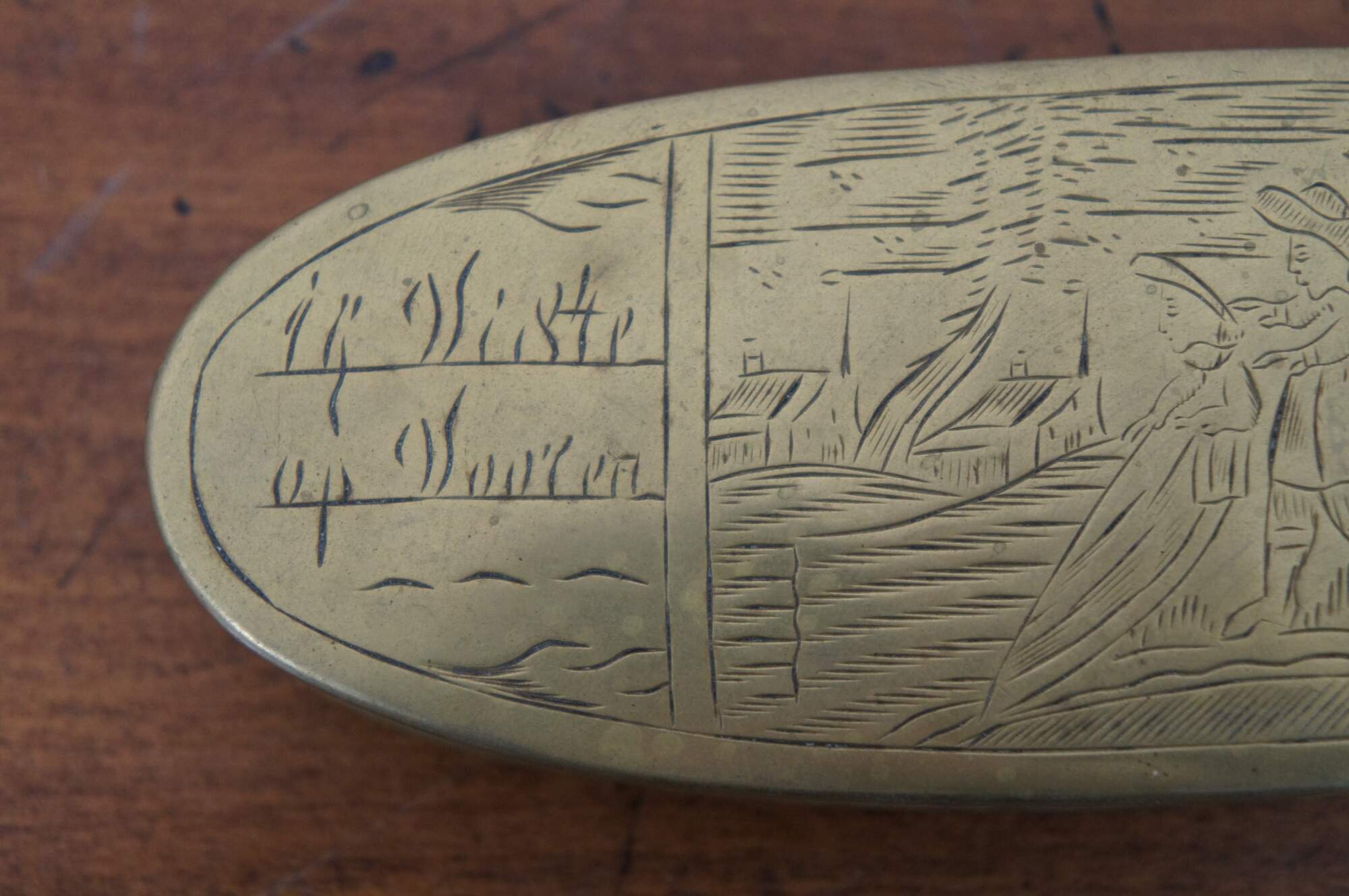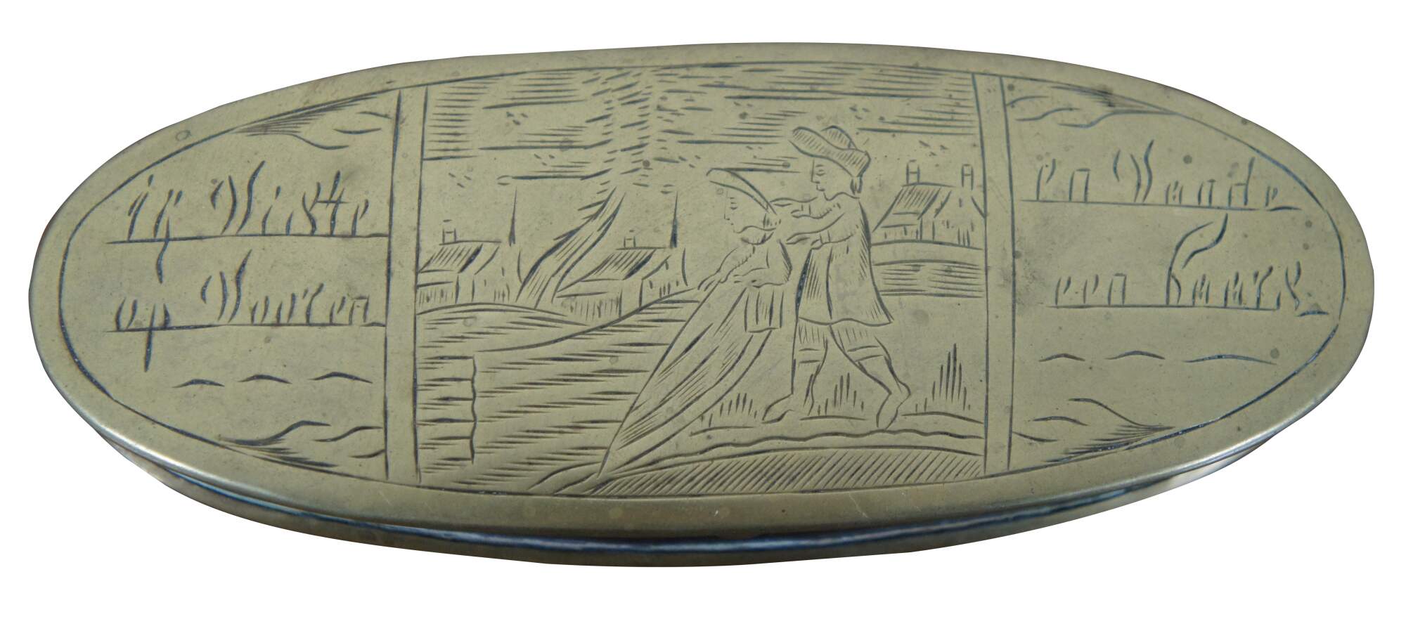 Antique late 18th century oval brass Dutch tinder / snuff / pill box, etched with phrases and a landscape of two figures plowing a field.