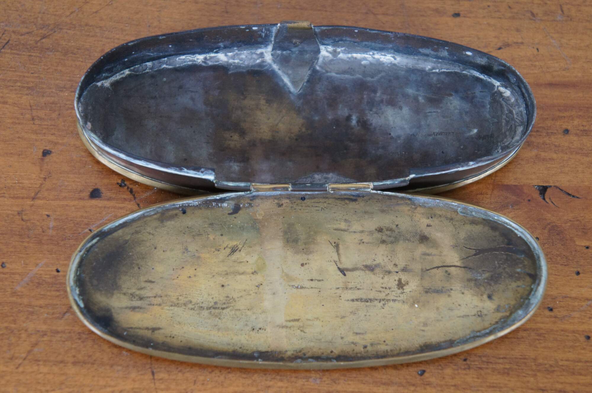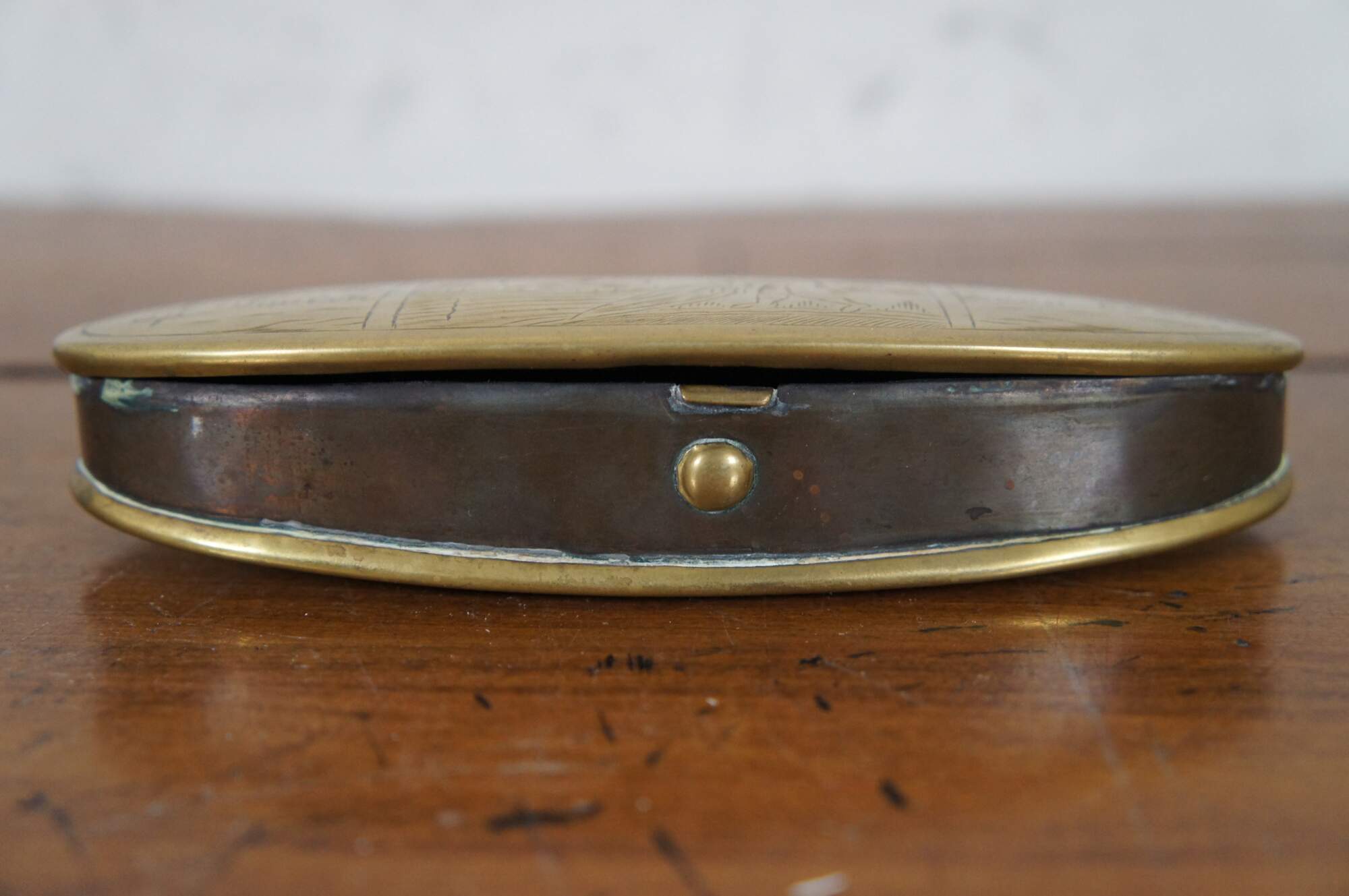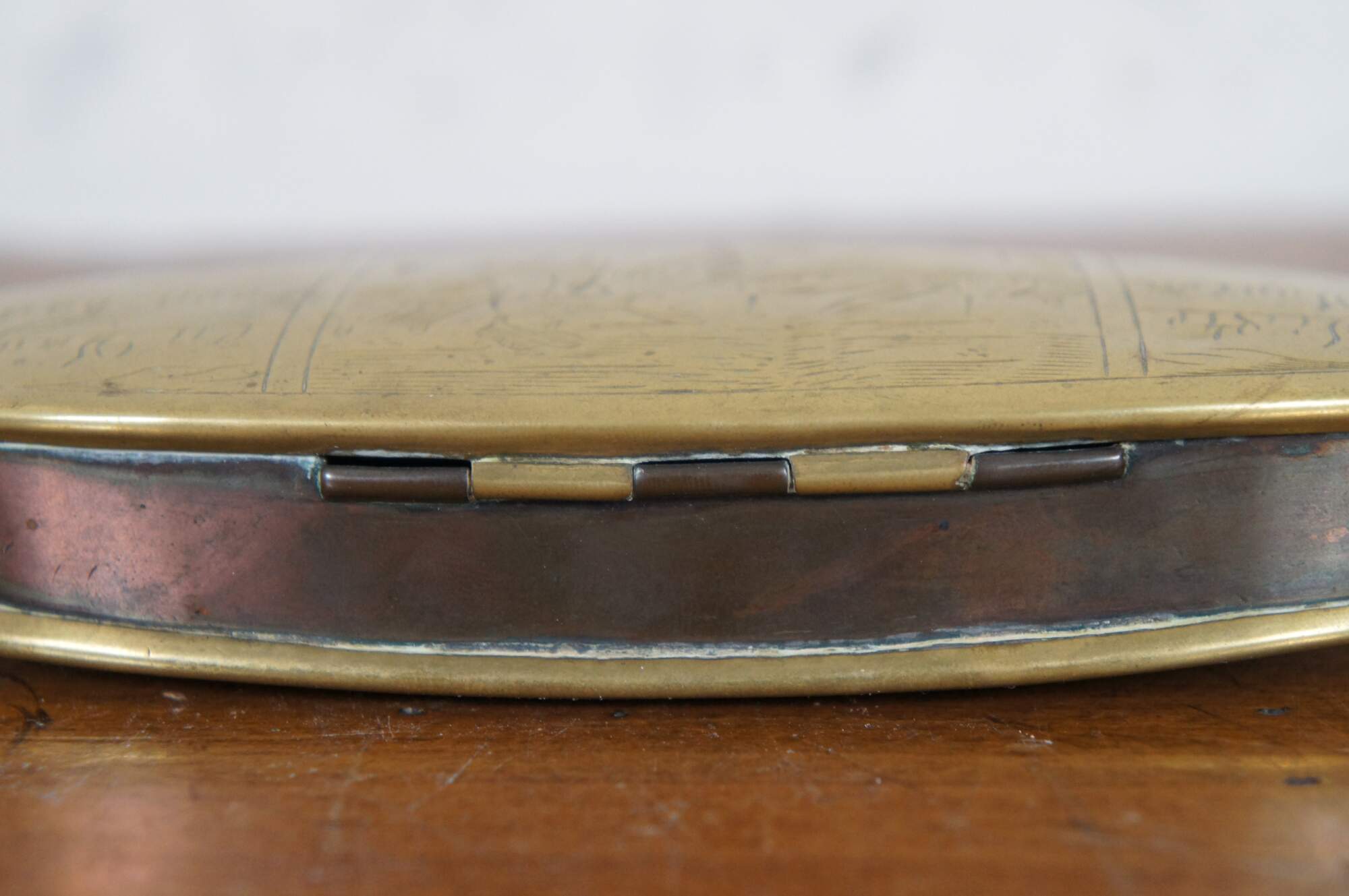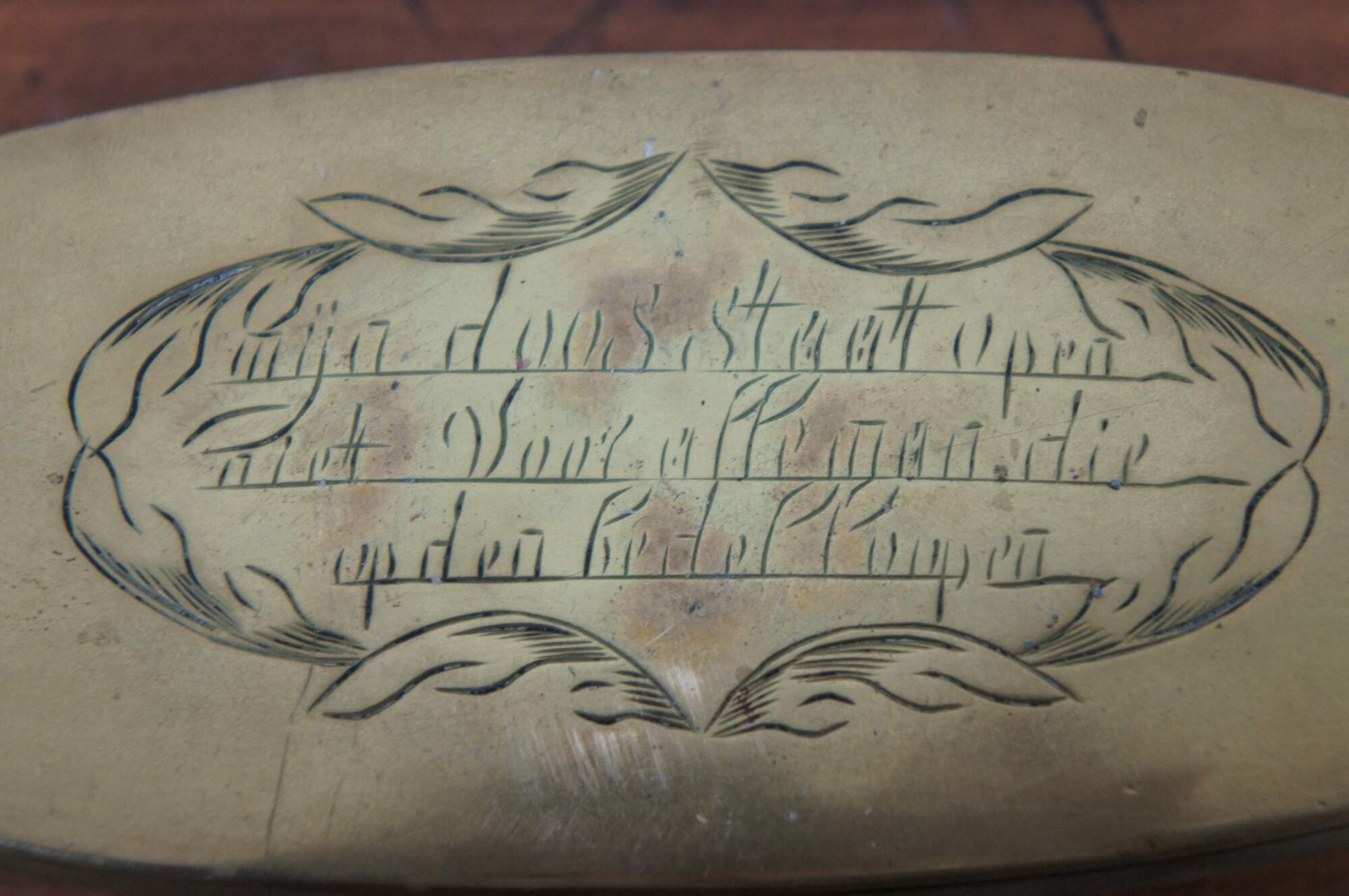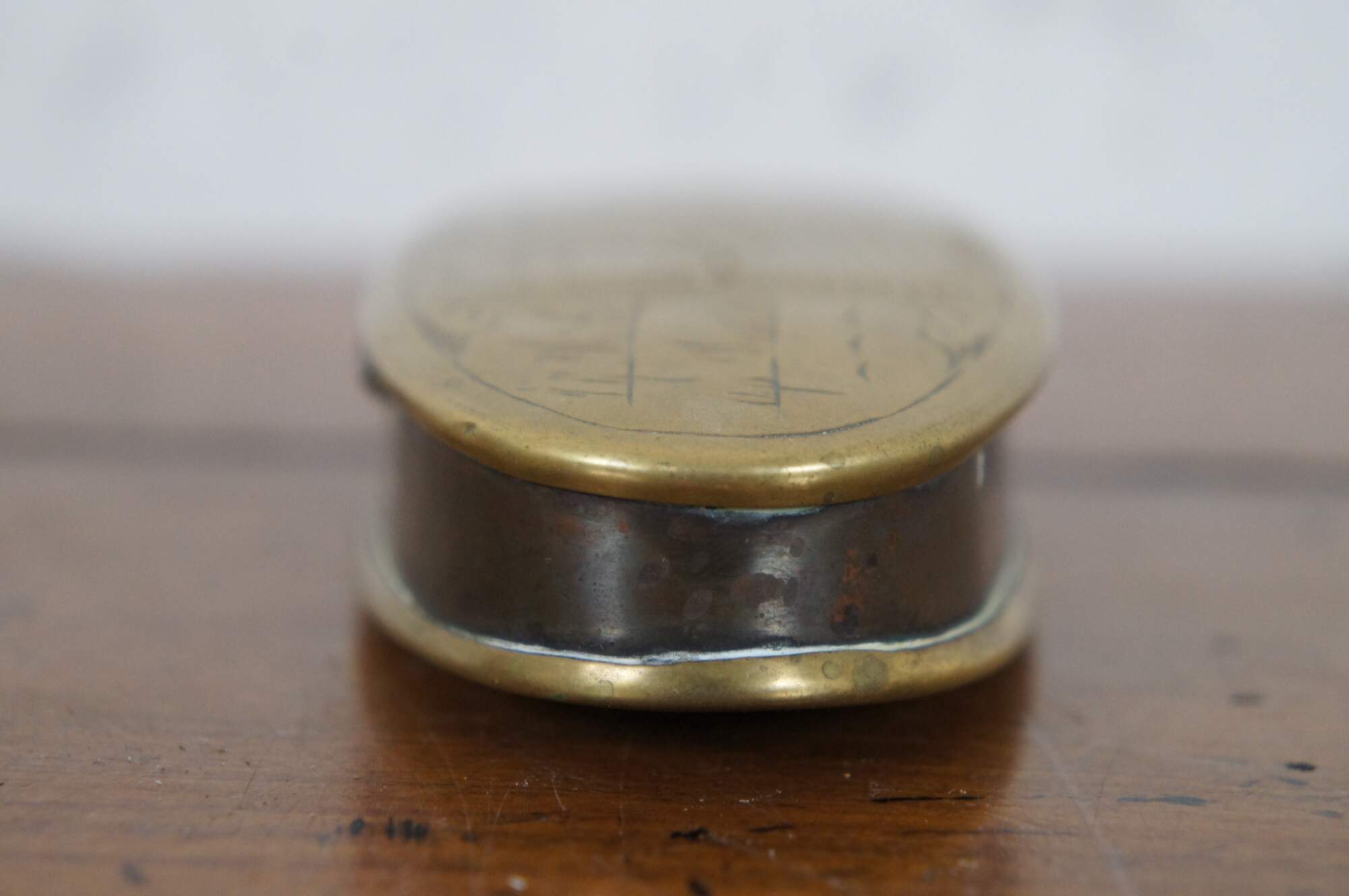 Antique late 18th century oval brass Dutch tinder / snuff / pill box, etched with phrases and a landscape of two figures plowing a field.