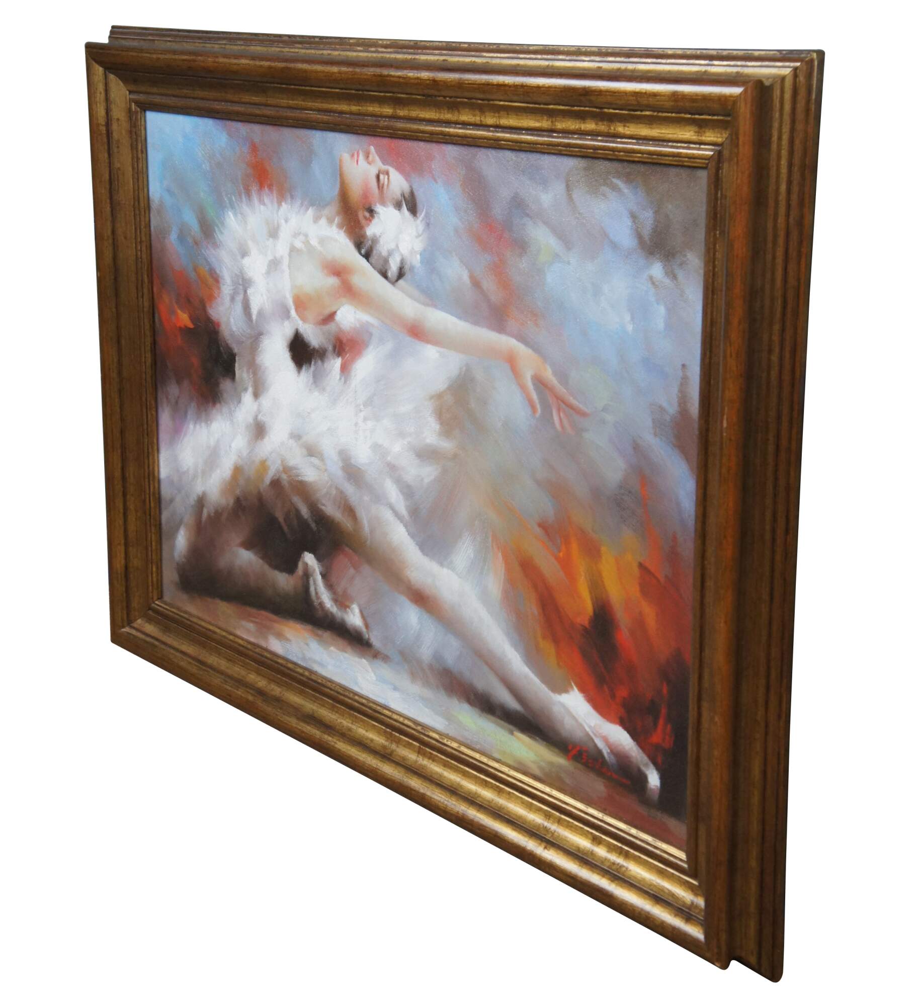 An impressionist style oil painting of a ballerina striking a pose. Signed lower right by Fisher. Framed in gold.