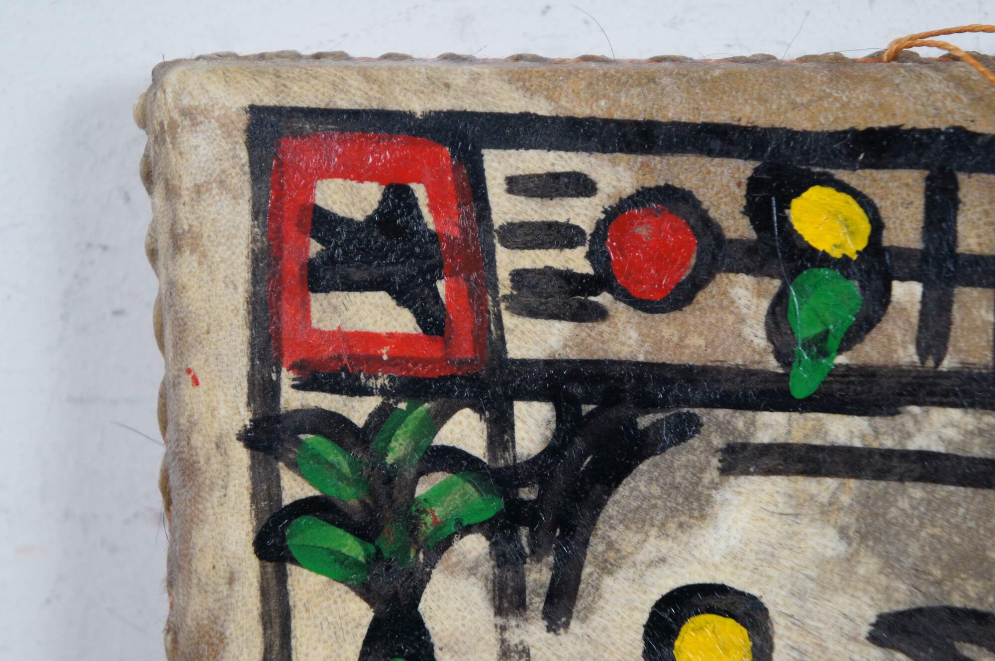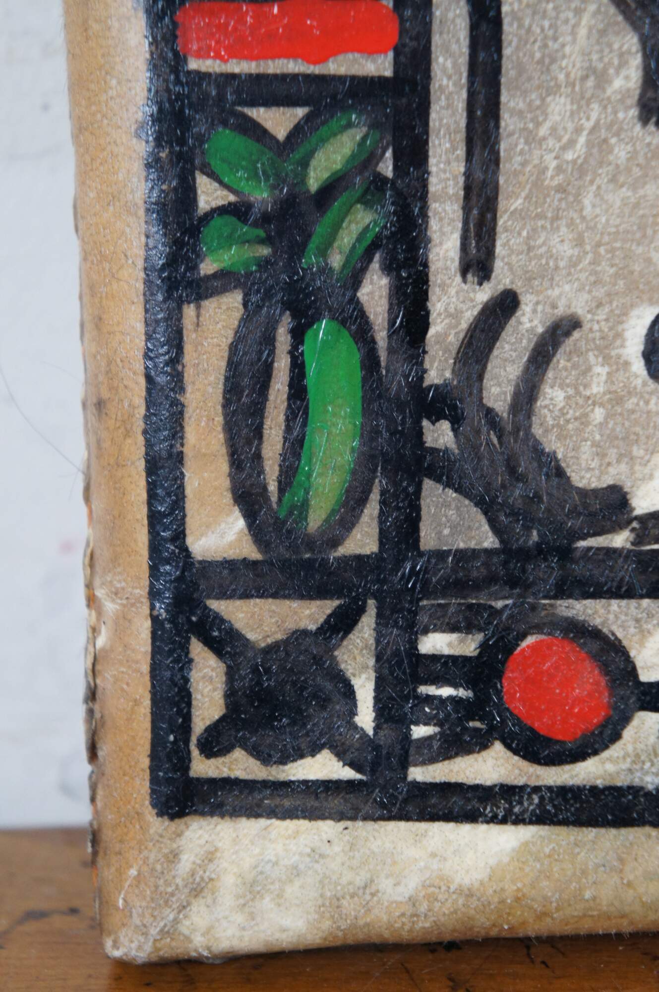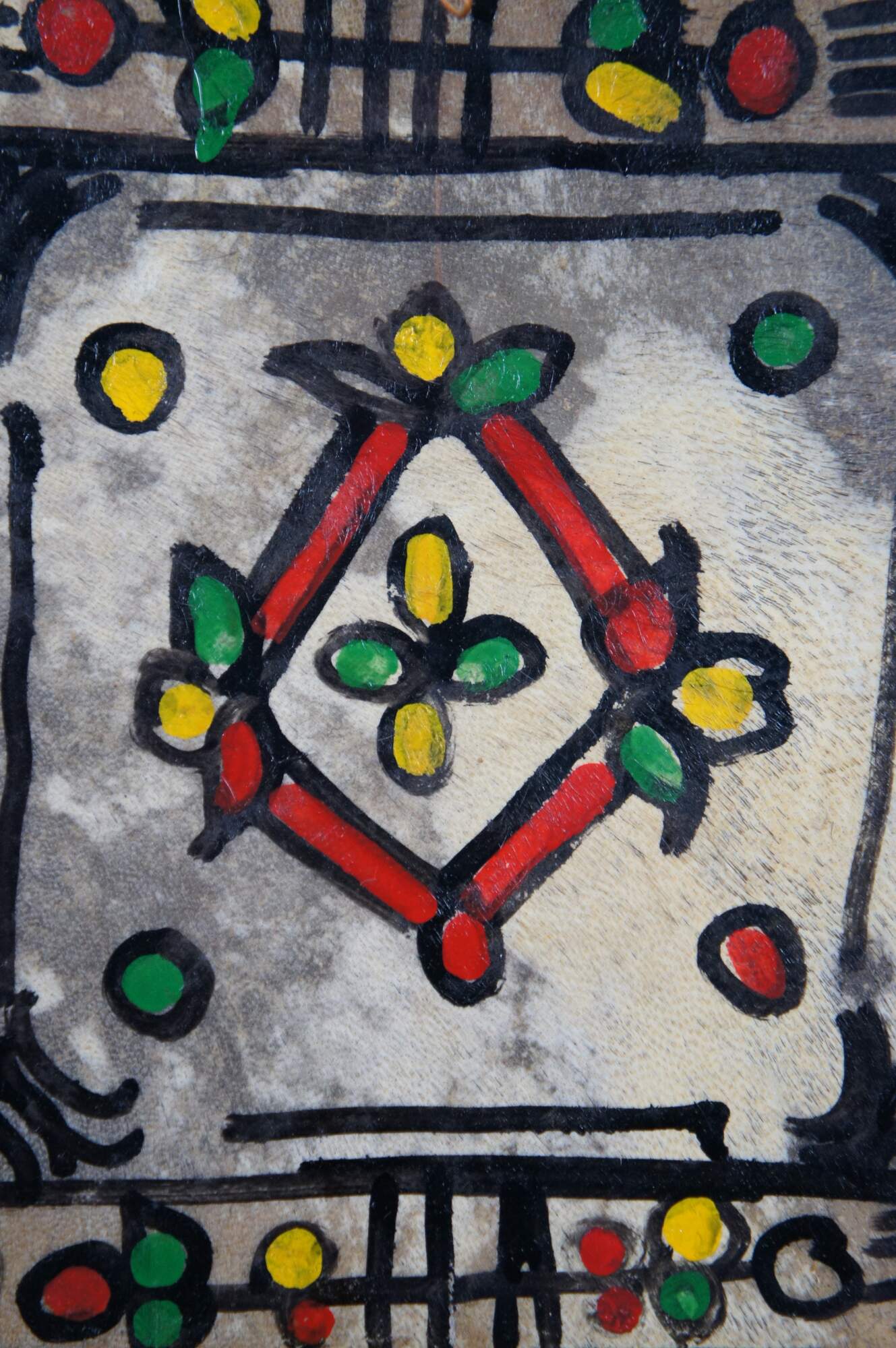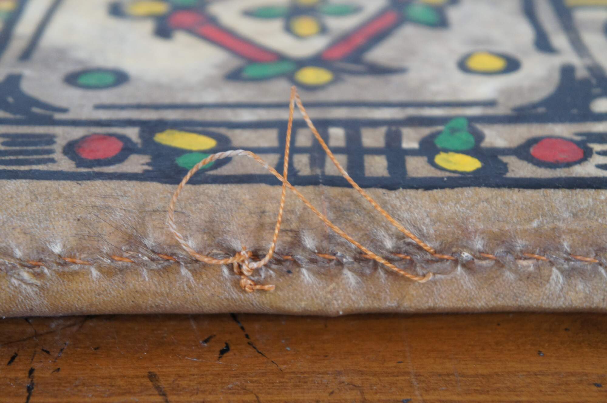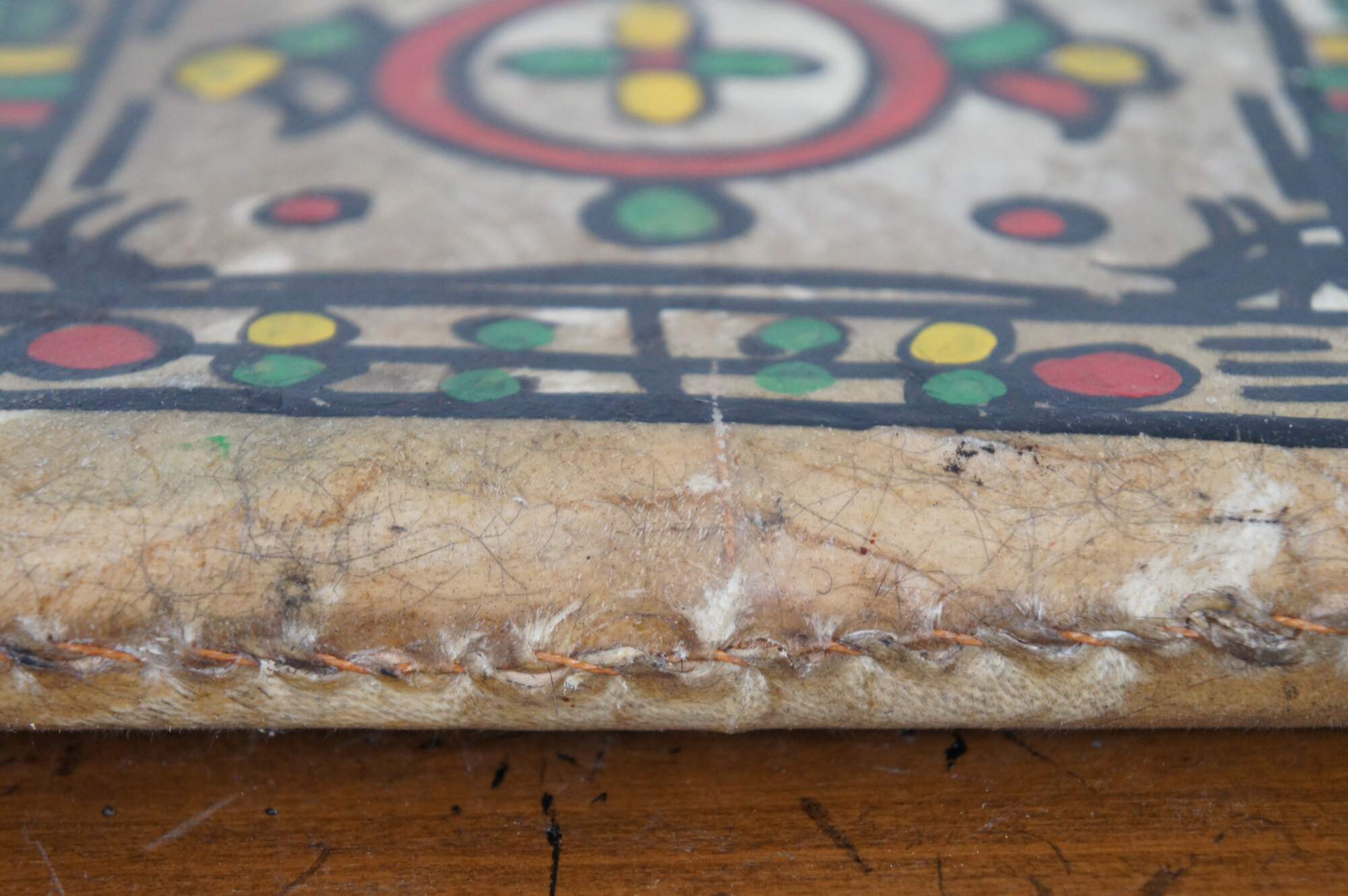 Vintage Berber / Moroccan adufe or square frame drum. This double sided drum is fashioned of a wooden frame covered with stretched leather (usually goat skin), stitched with thick thread and hand painted with a floral motif.