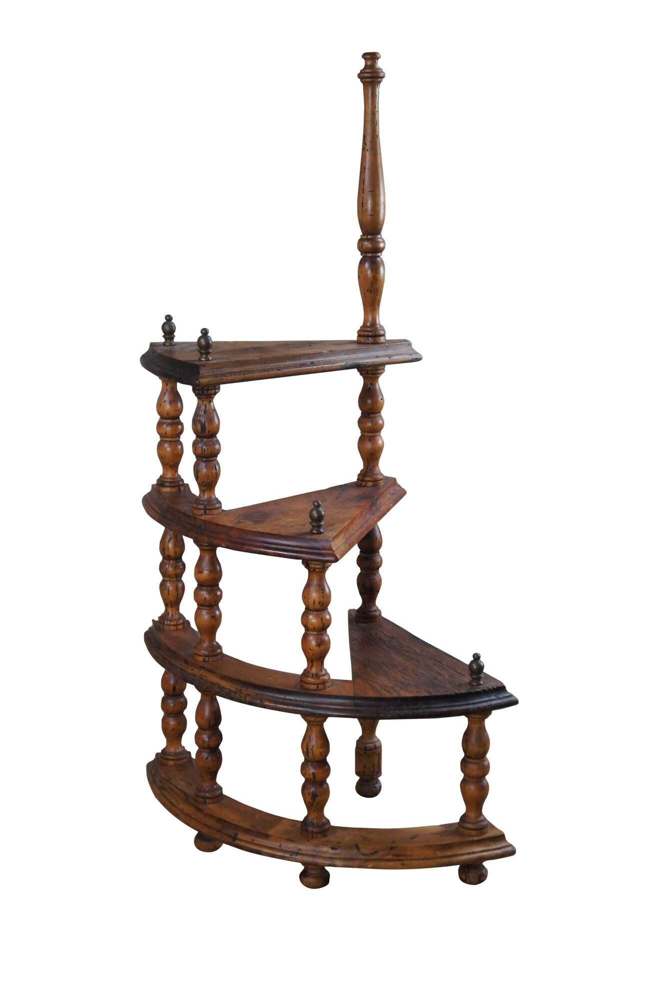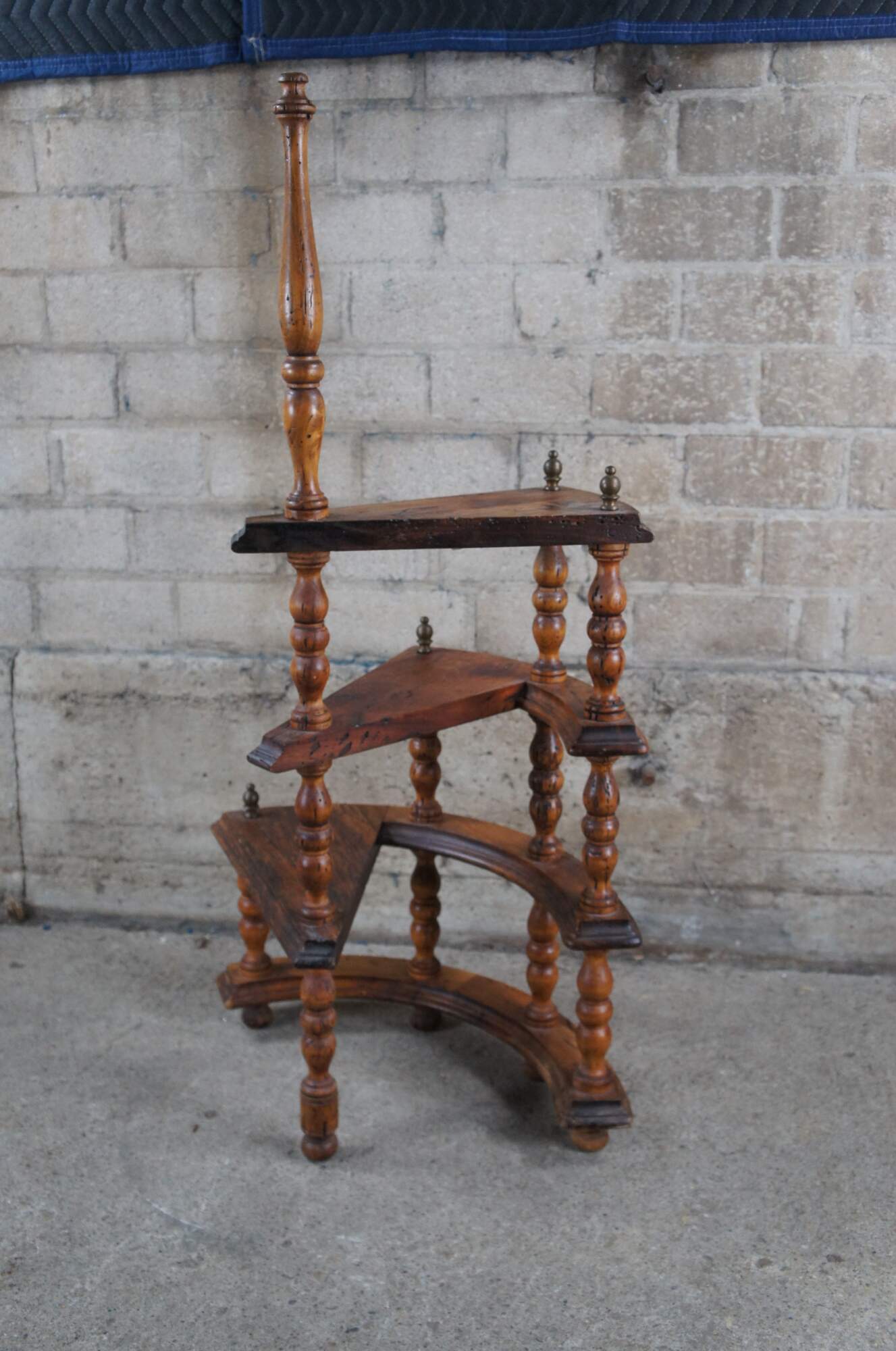 Antique spiral library book staircase or step ladder. Made of walnut featuring three tiers with turned posts and brass finials.