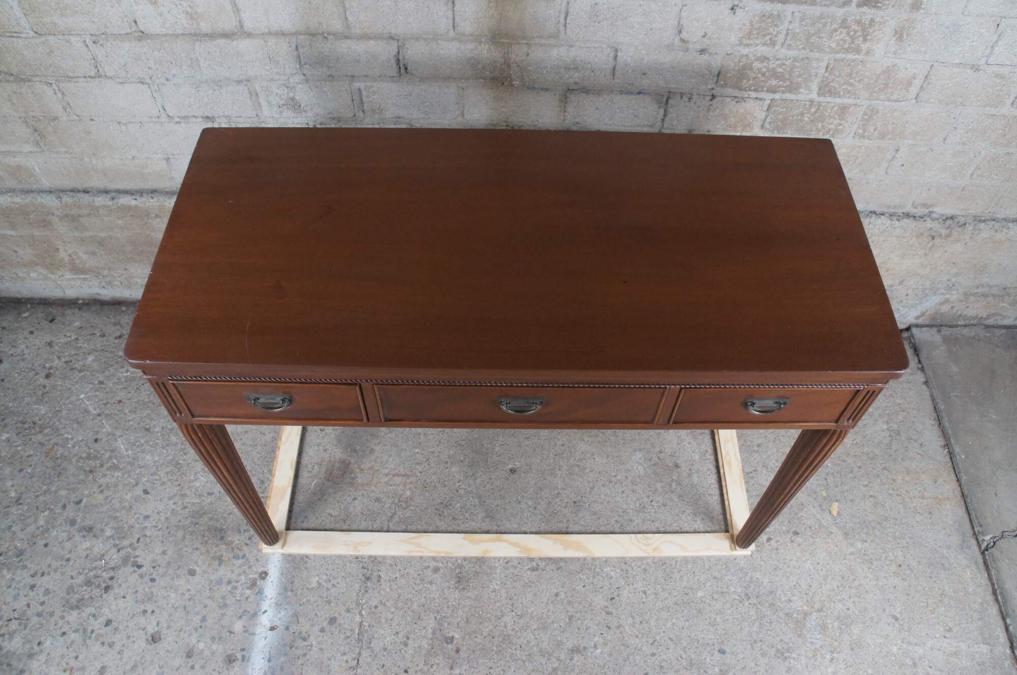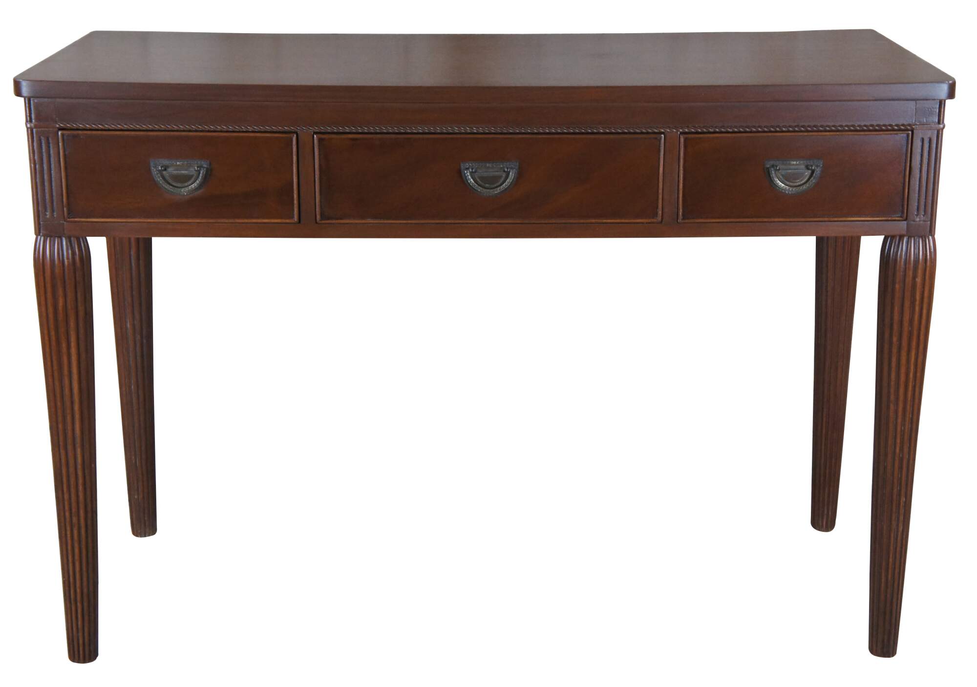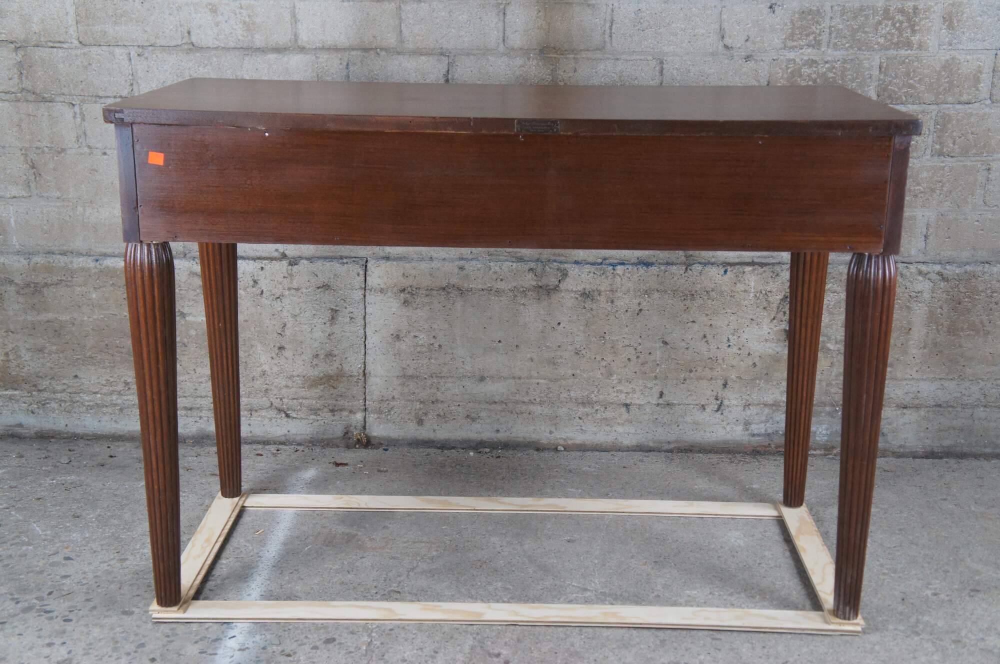 Vintage John Wanamaker library writing desk. Made of mahogany featuring rectangular form with three brass art deco hardware drawers and fluted tapered legs.