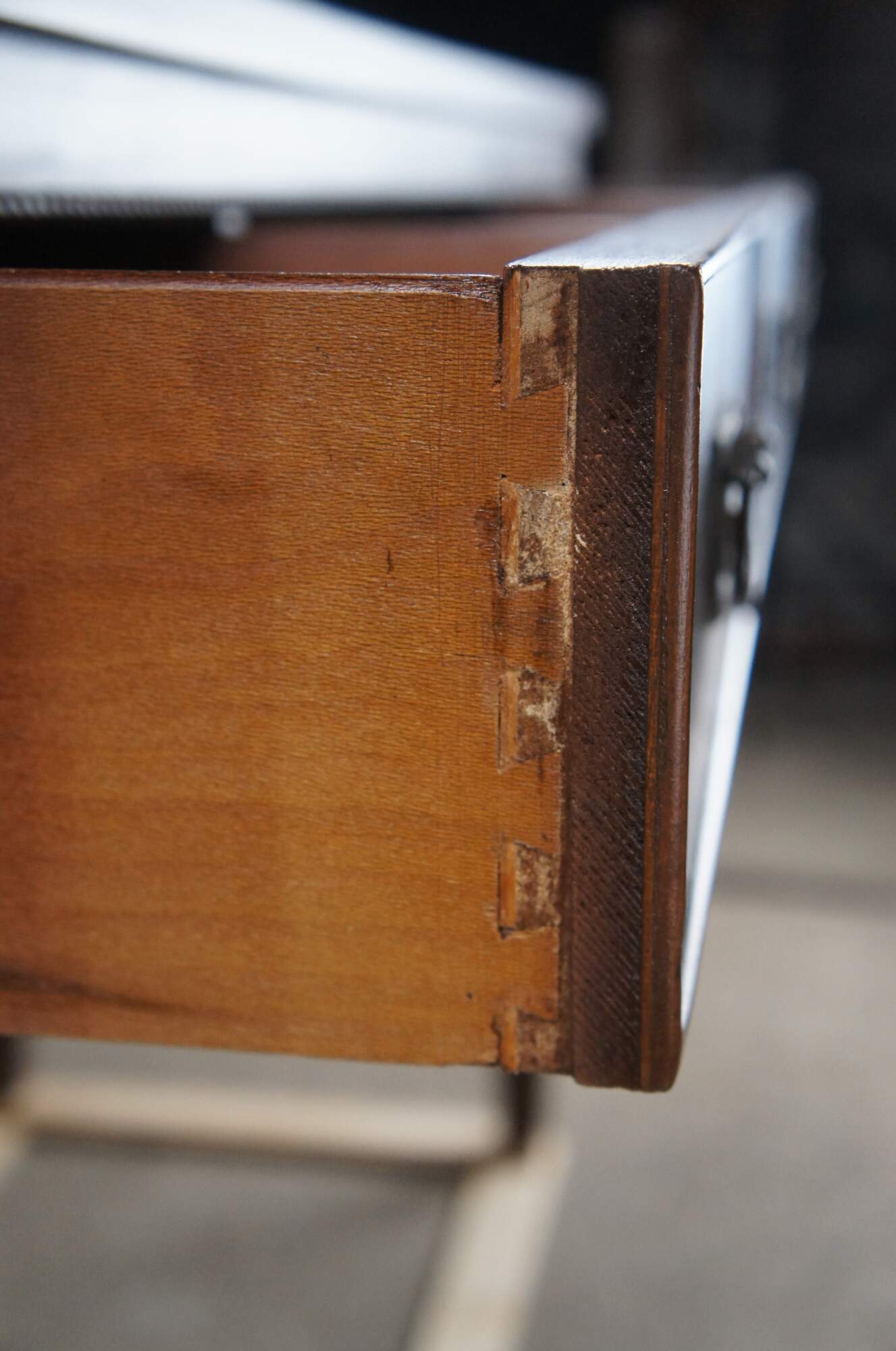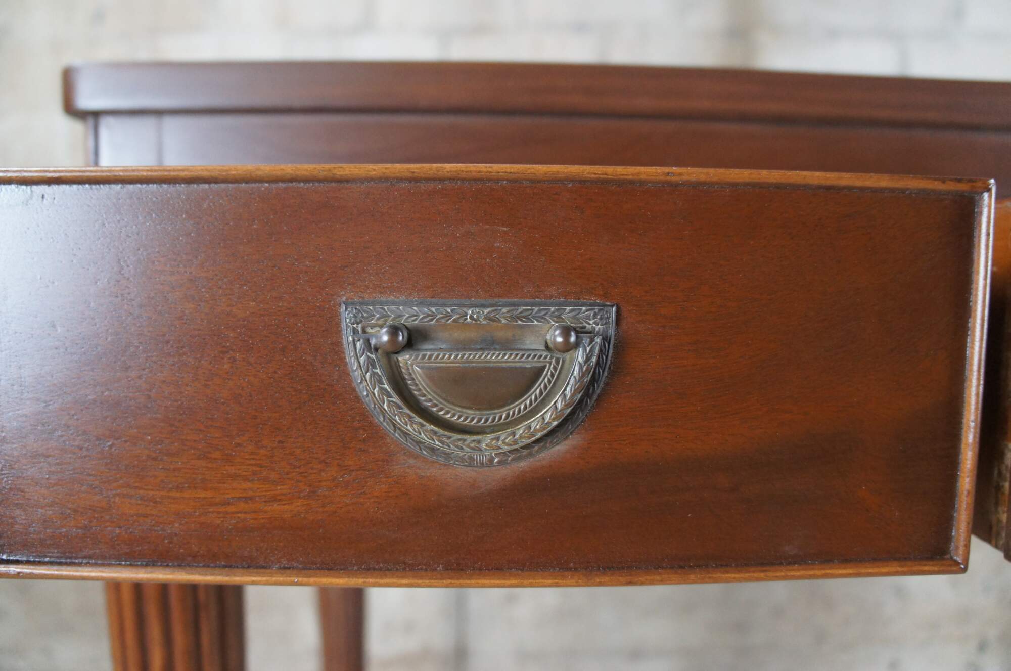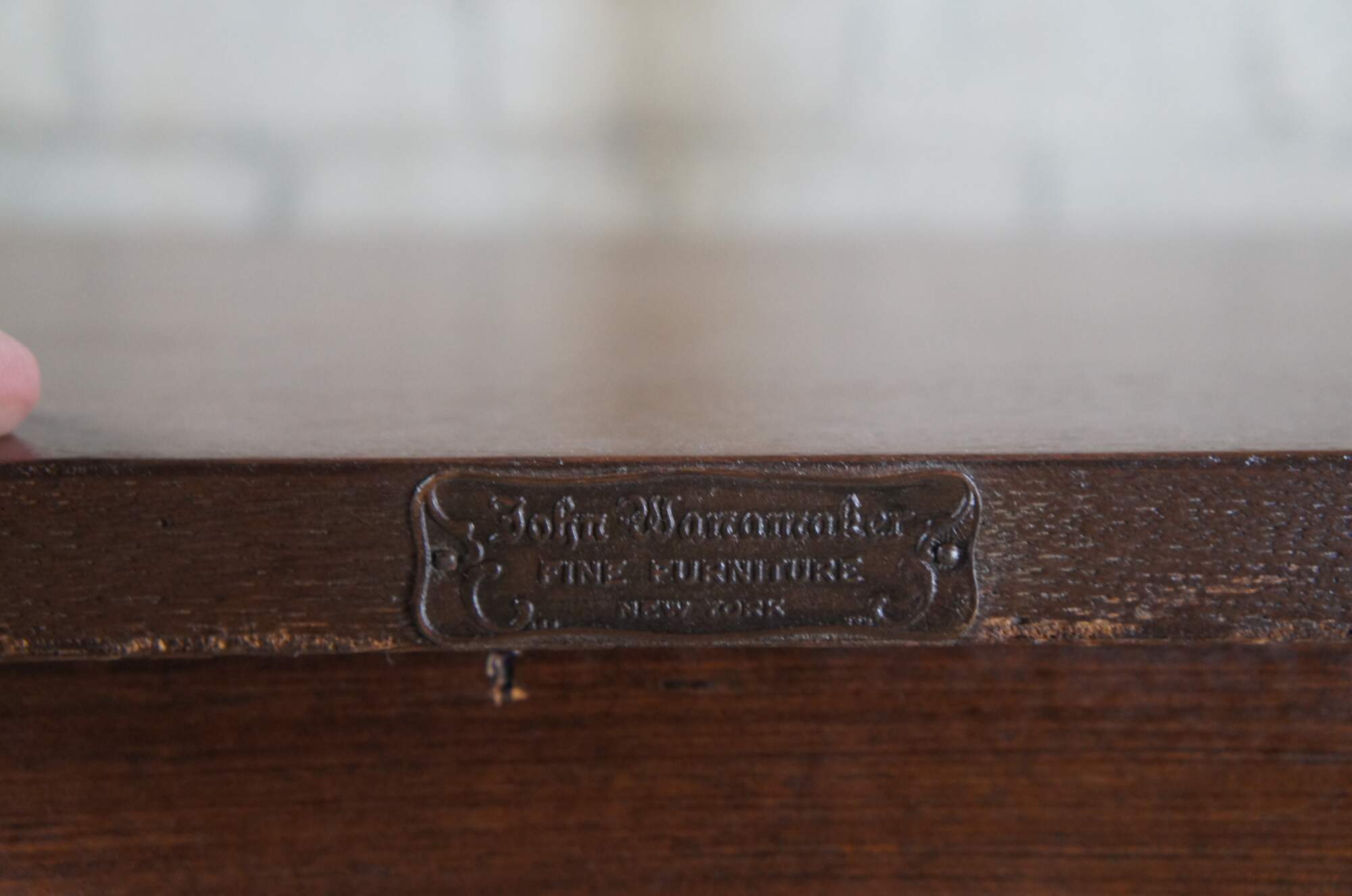 Vintage John Wanamaker library writing desk. Made of mahogany featuring rectangular form with three brass art deco hardware drawers and fluted tapered legs.