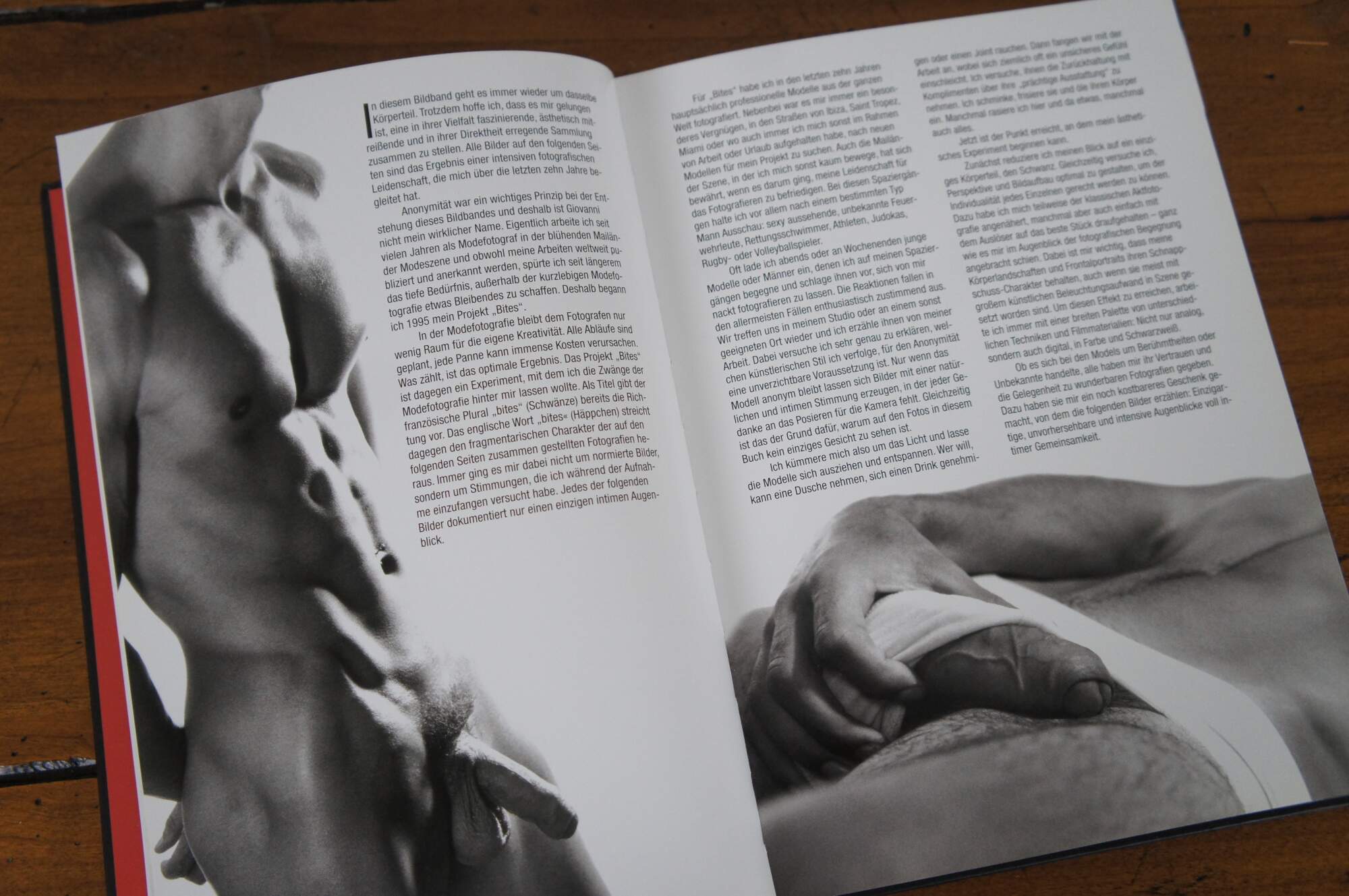 “Giovanni is the pseudonym of a world-famous photographer who has been working successfully in the international fashion scene for years. His speciality is men’s portraits. Many of us would recognize his work without realizing it was his. Under the name Giovanni he can escape the everyday work life of fashion photography that leaves very little room for the photographer’s own creativity to shine through. His Photo collections Bites and Private Parts have allowed Giovanni to realize a product that moves beyond the fashion industry’s standardized point-of-view to one where his own personal perspectives com to the fore. The result is an impressive erotic experiment that will hopefully continue for some time to come.” (Private Parts by Giovanni - Editor: Claus Kiessling – Bruno Gmunder 2006)